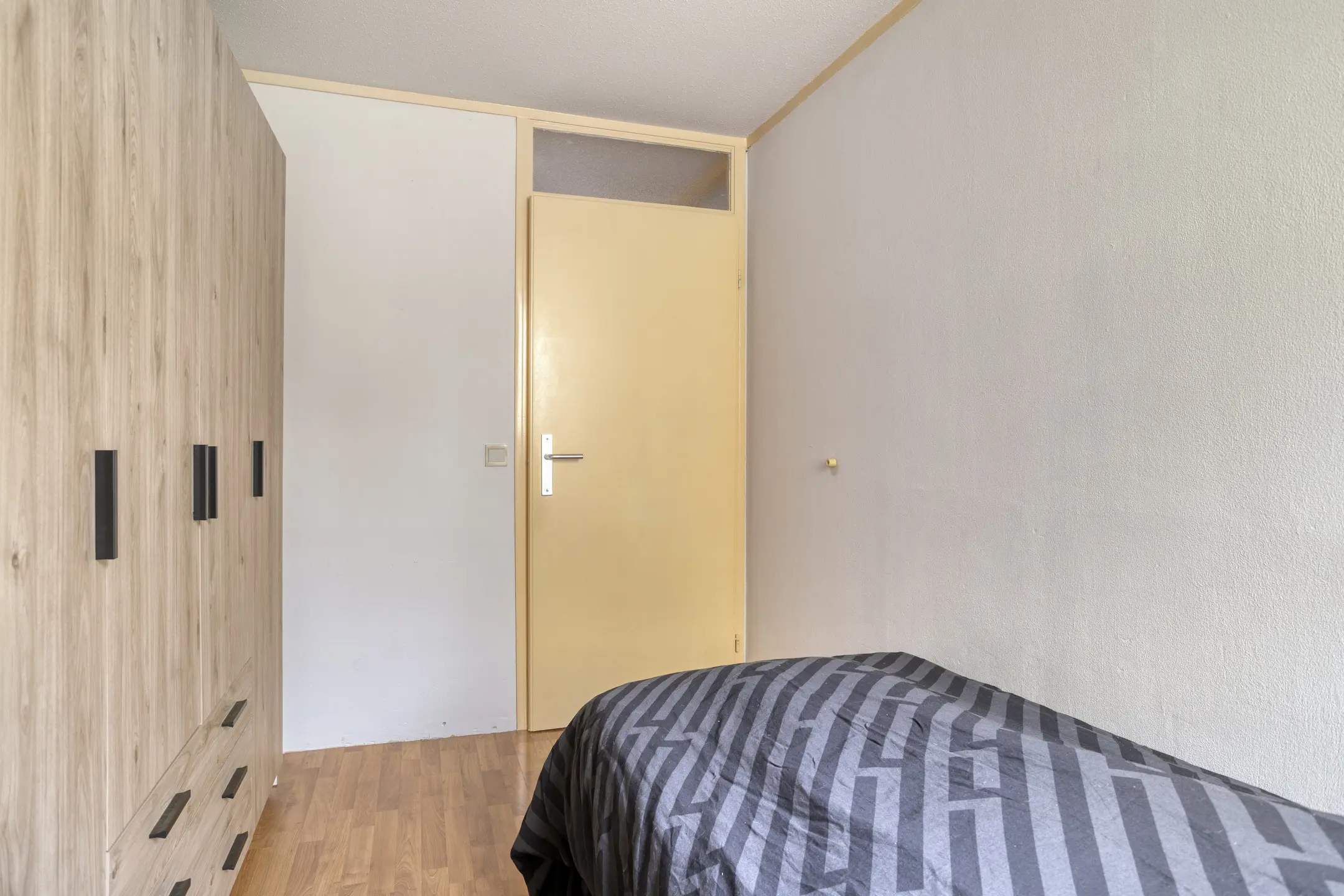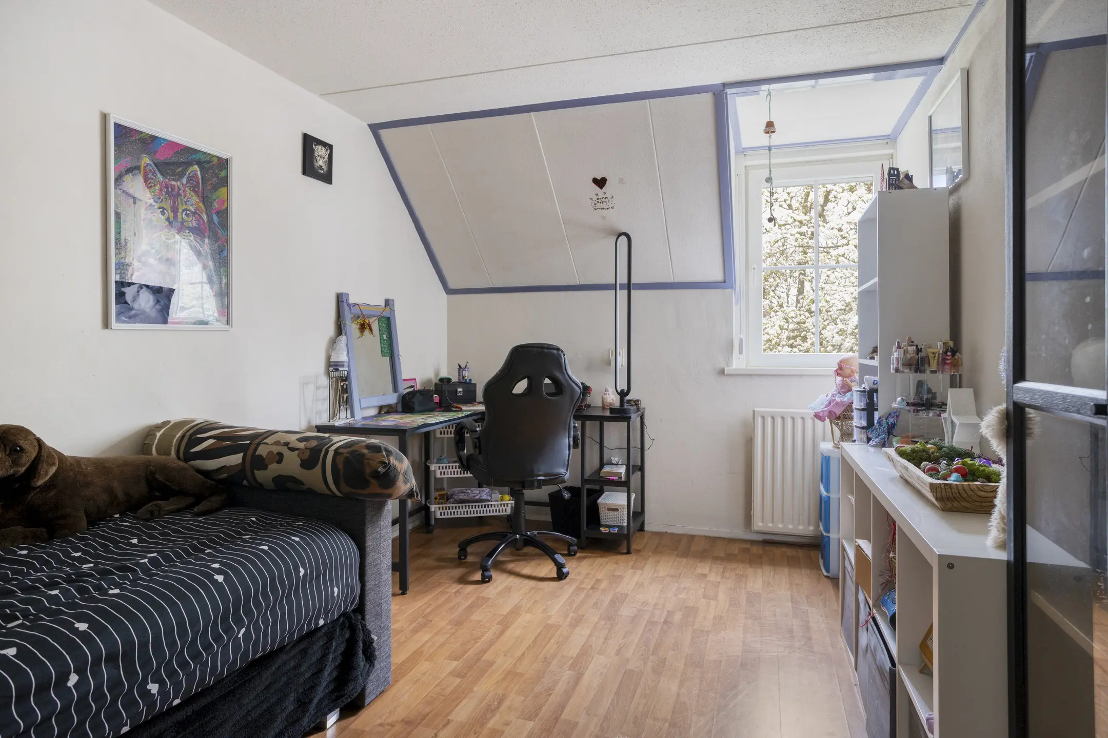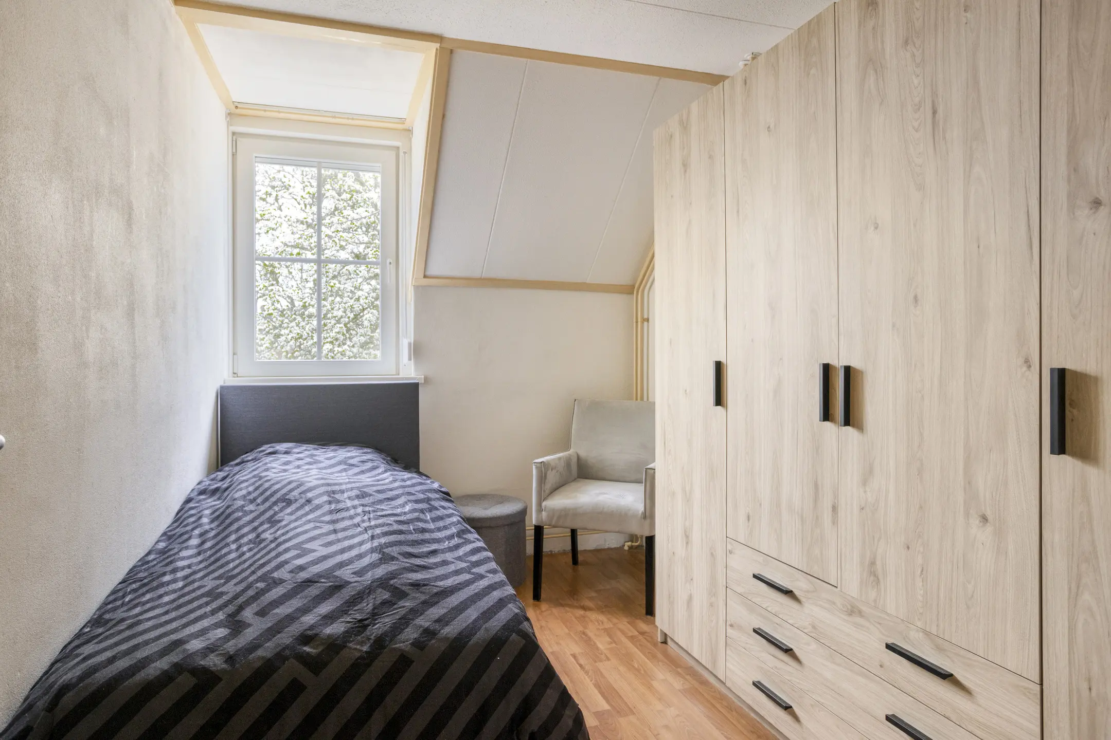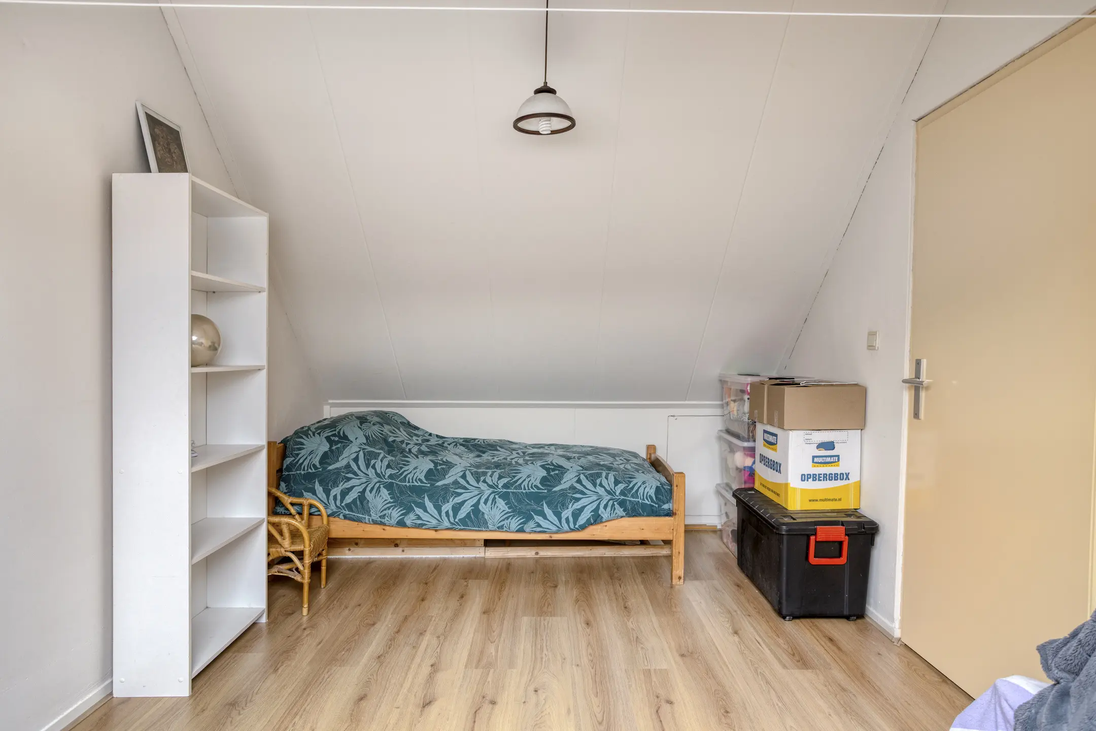 Daarnaast vind je hier de vierde slaapkamer: een fijne extra ruimte, netjes afgewerkt en eveneens voorzien van een nieuw Velux-dakraam en laminaatvloer.