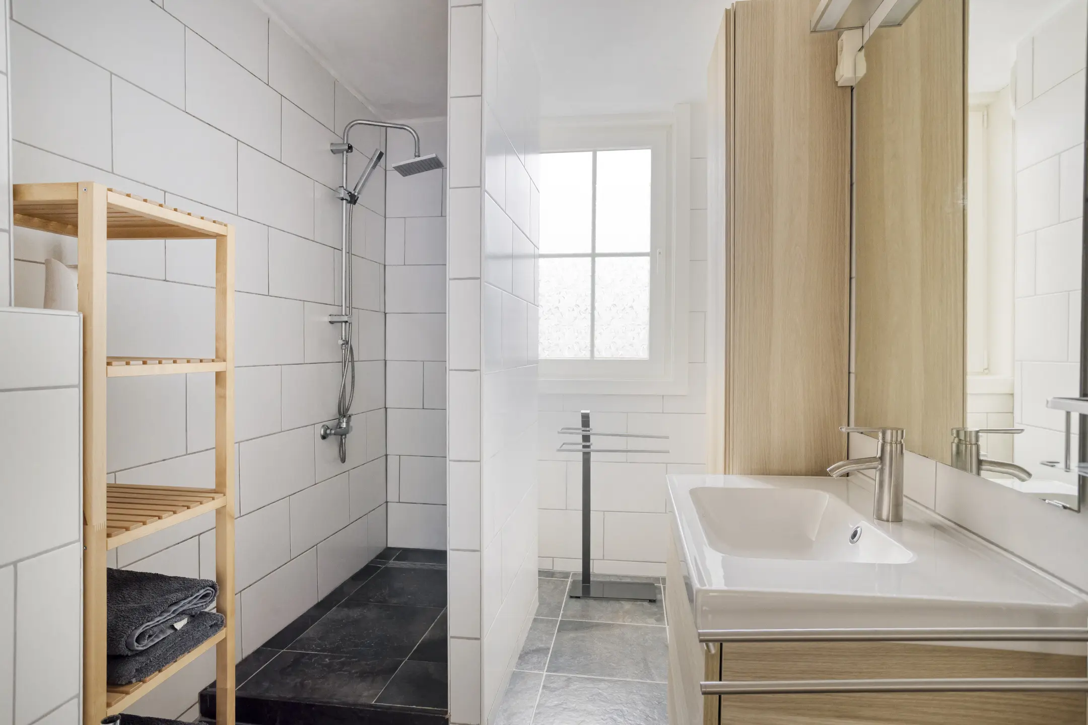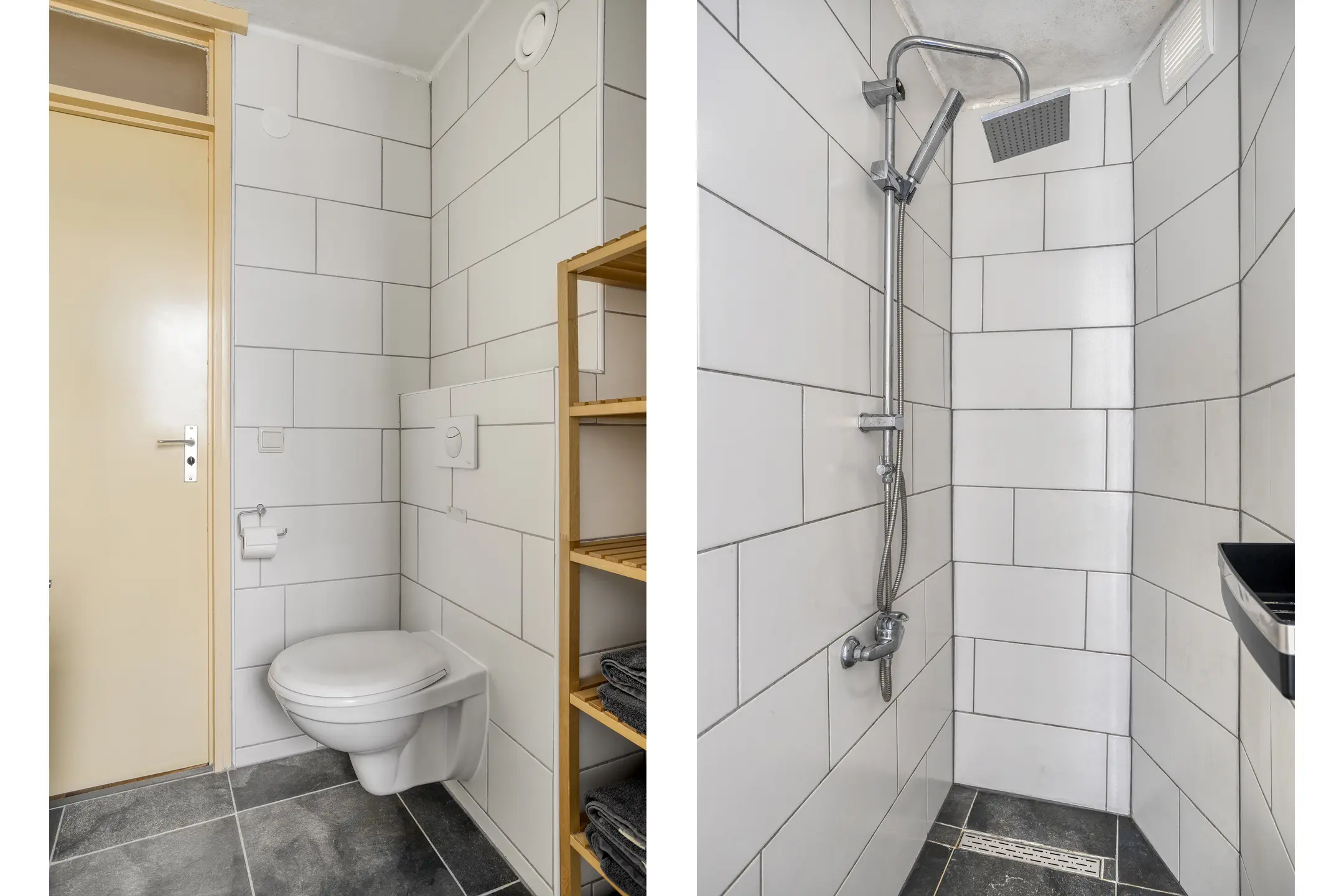De badkamer is uitgevoerd met een inloopdouche, wastafelmeubel en een hangtoilet.