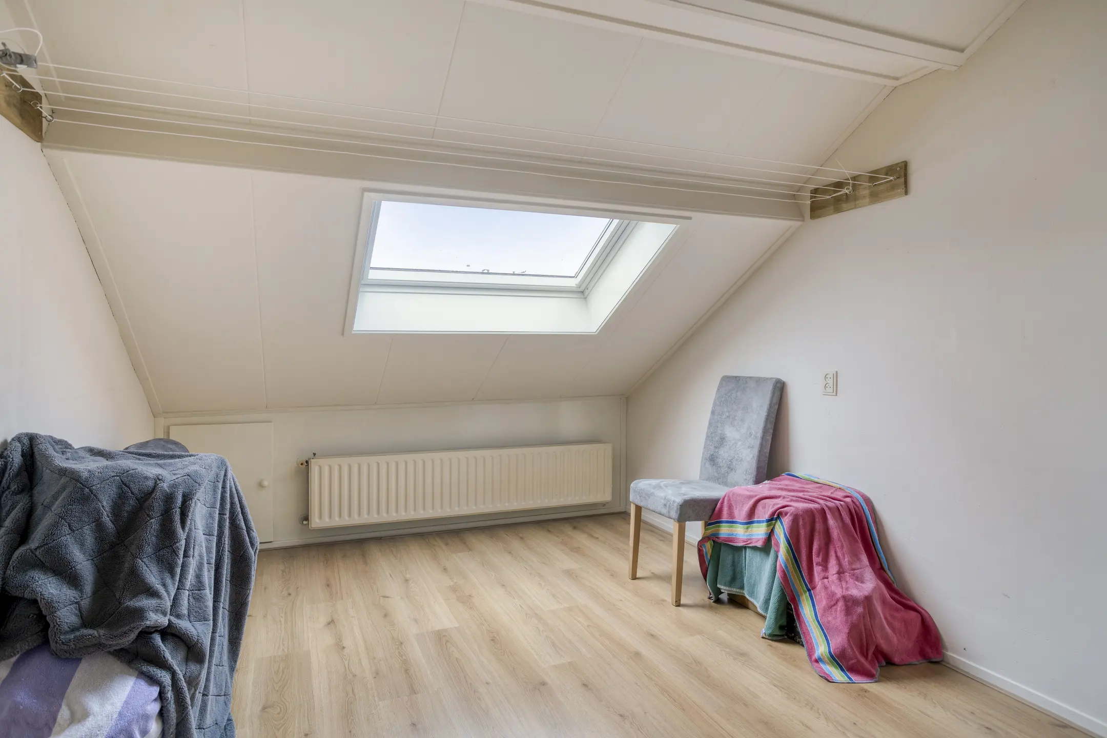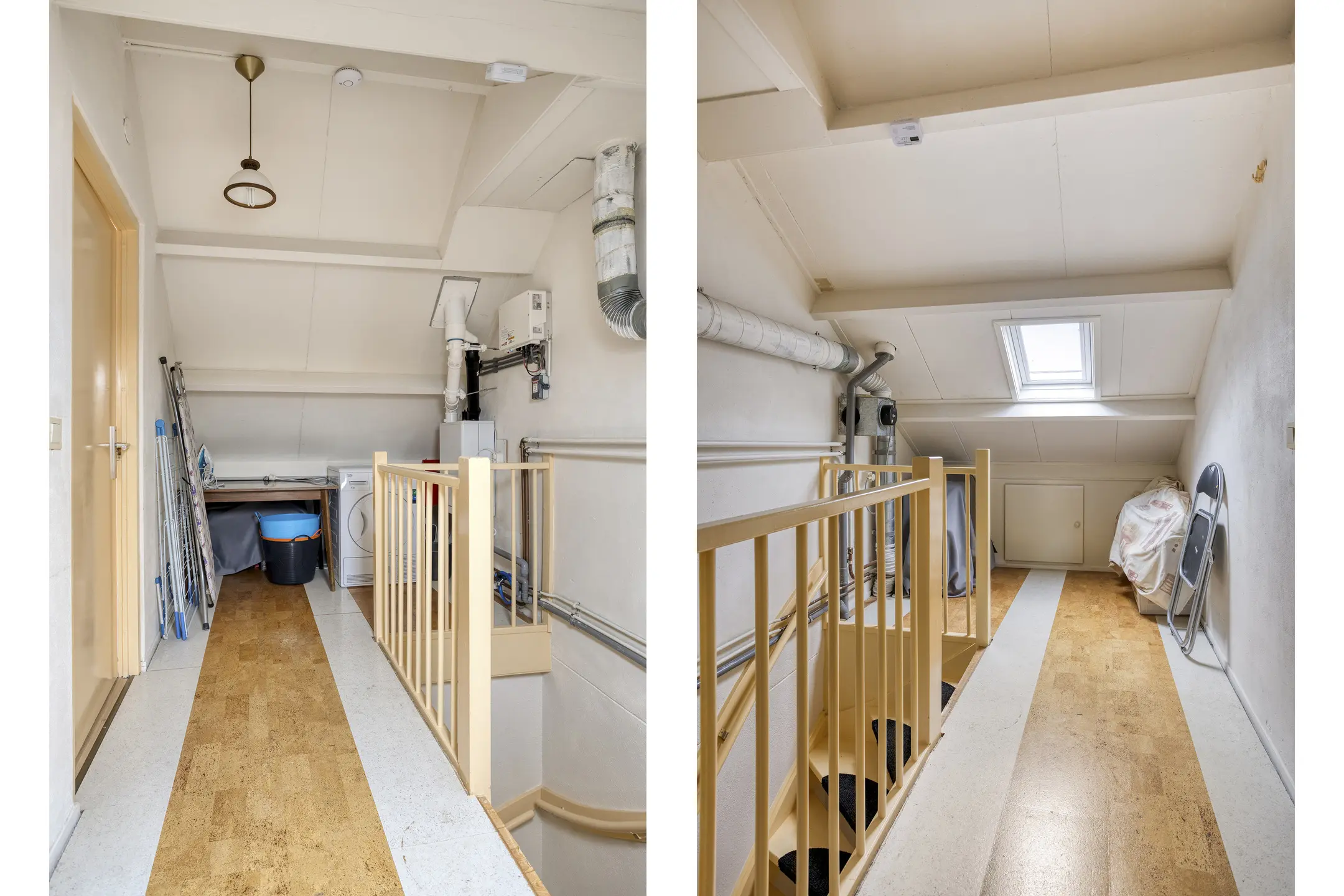 Via de vaste trap bereik je de tweede verdieping. Hier kom je eerst op de overloop met opstelplaats voor de cv-ketel 2025 (huurketel), de mechanische ventilatie en de omvormer van de zonnepanelen. Ook is hier een nieuw Velux-dakraam geplaatst en is er praktische bergruimte achter de knieschotten.