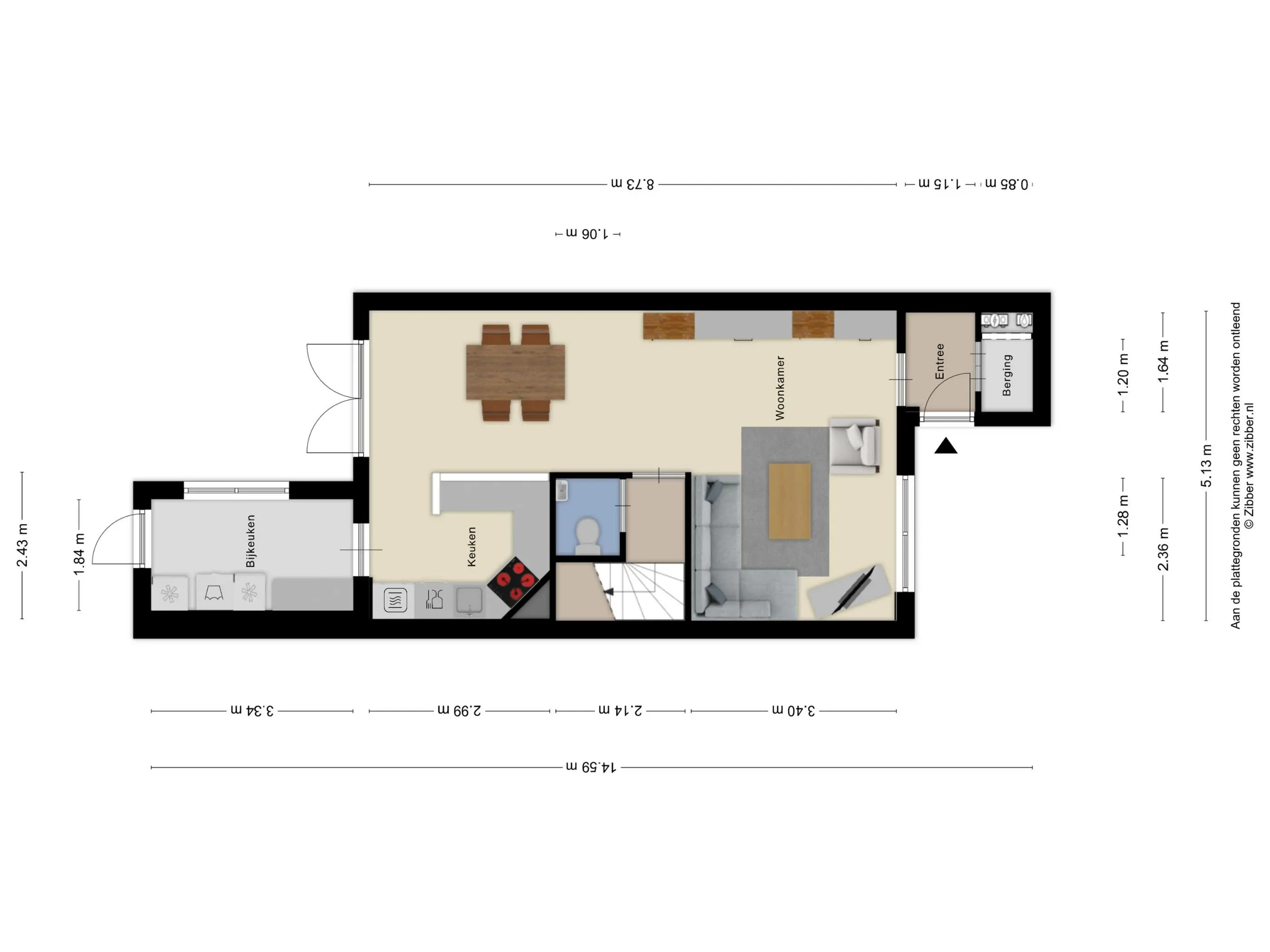 Je komt binnen in de hal met meterkast en praktische garderobe kast. Vanuit hier stap je de woonkamer in, die een prettig en ruimtelijk gevoel geeft. De woonkamer is afgewerkt met een recente laminaatvloer die mooi doorloopt richting de keuken en is voorzien van rolluiken.