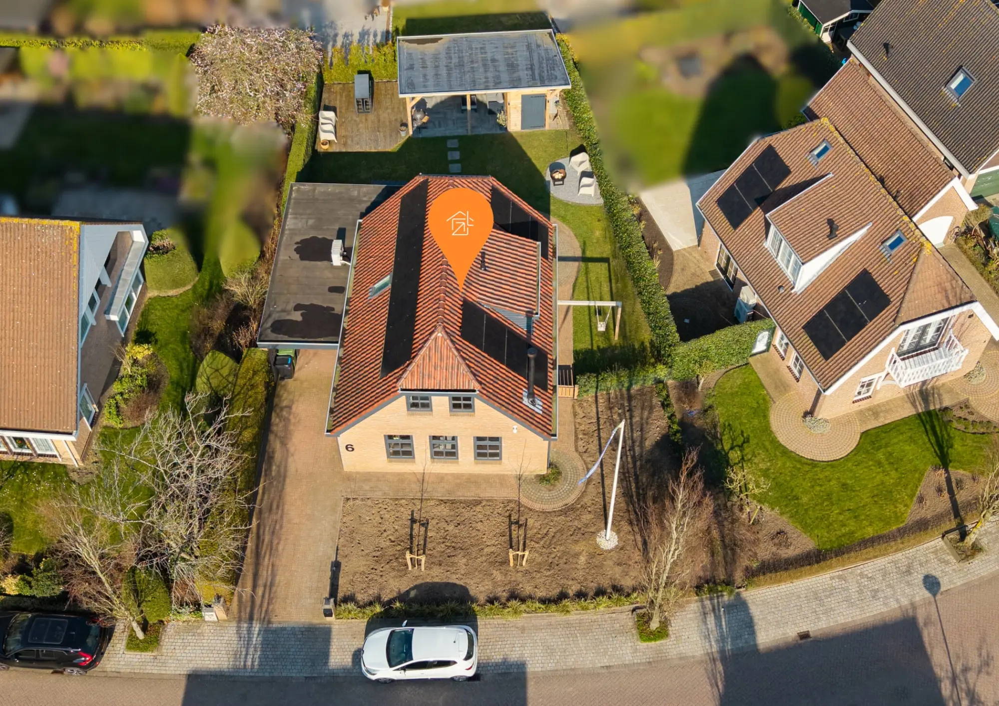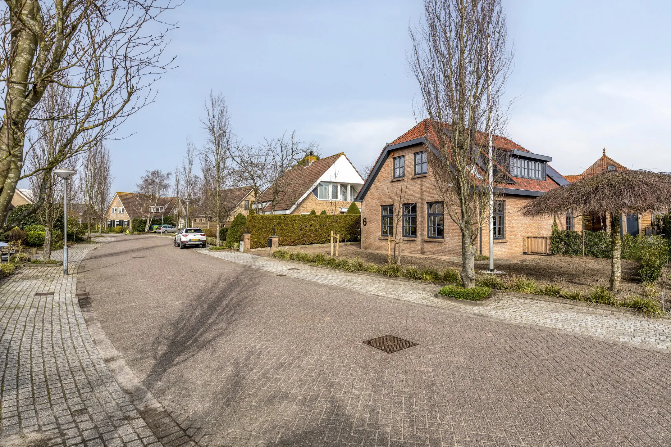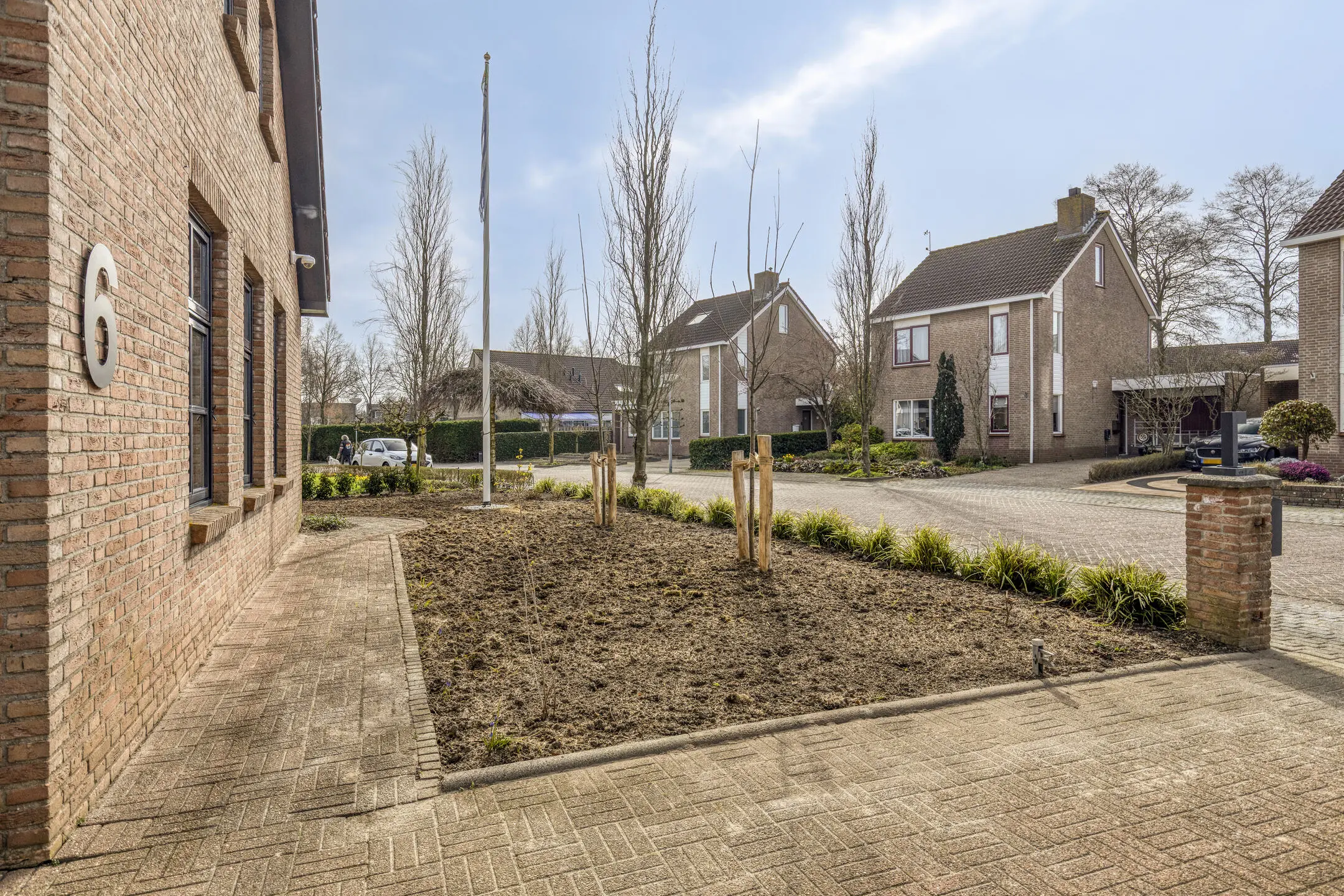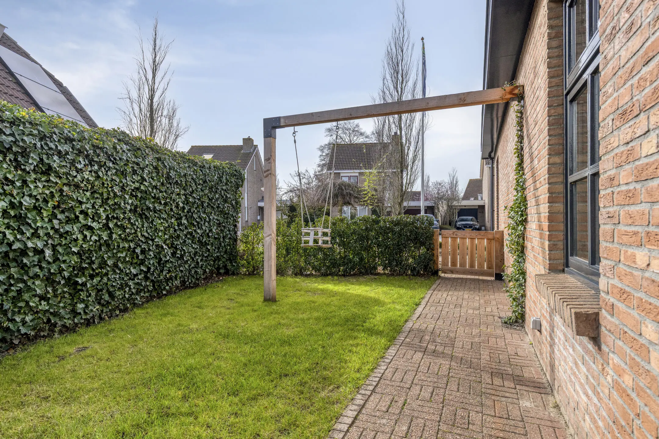 Het gazon loopt door naar de voorzijde van de woning, waar zich ook de oprit naar de garage bevindt.
