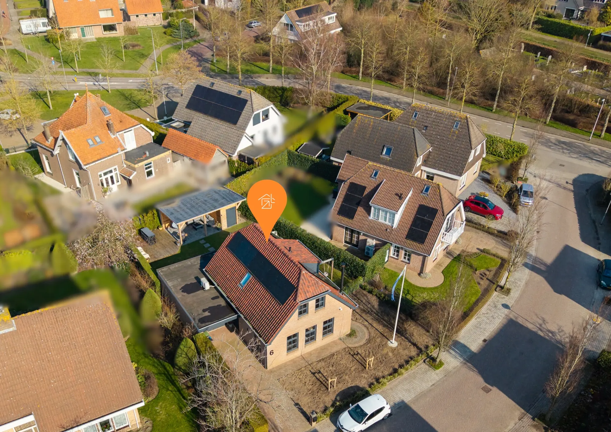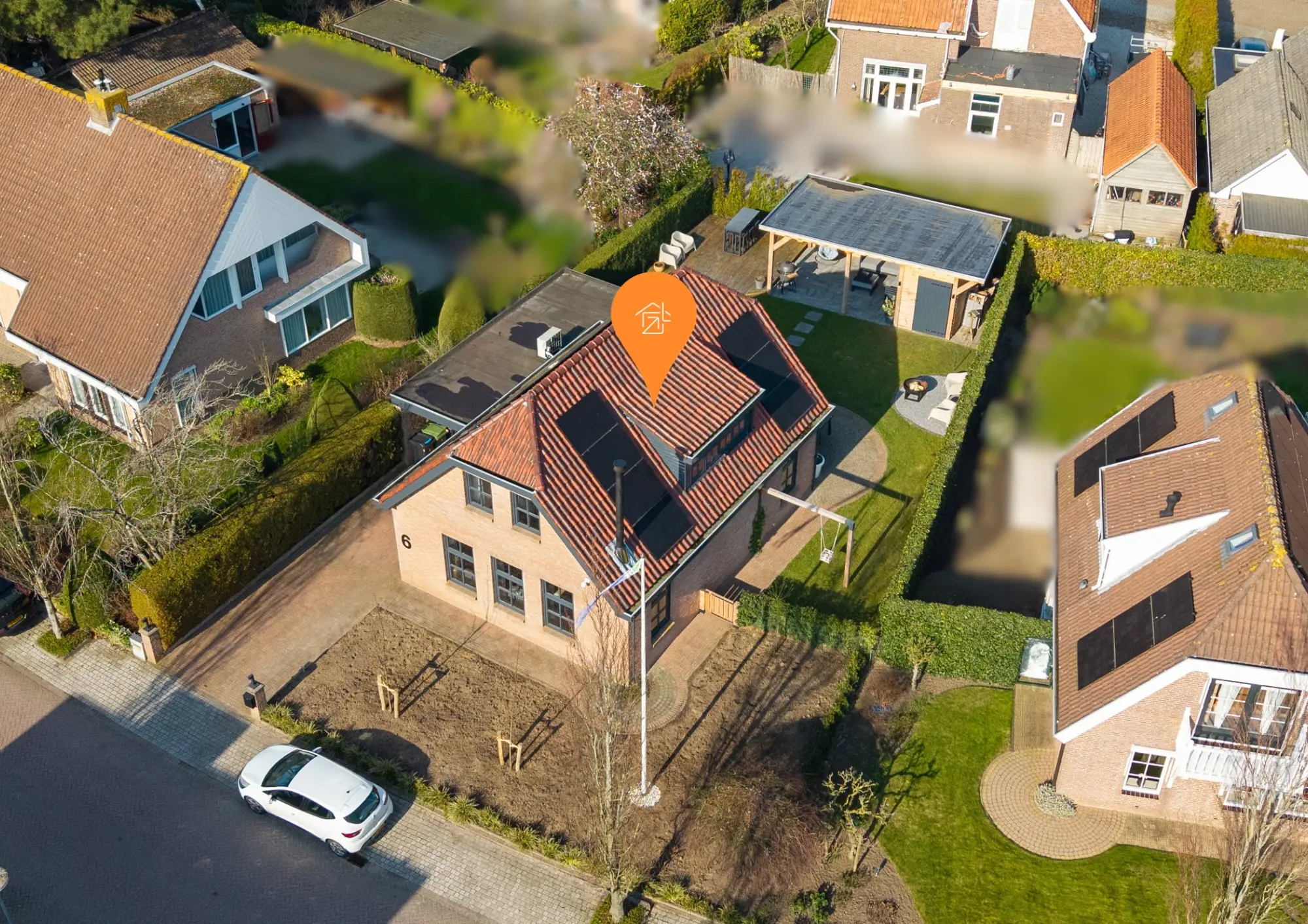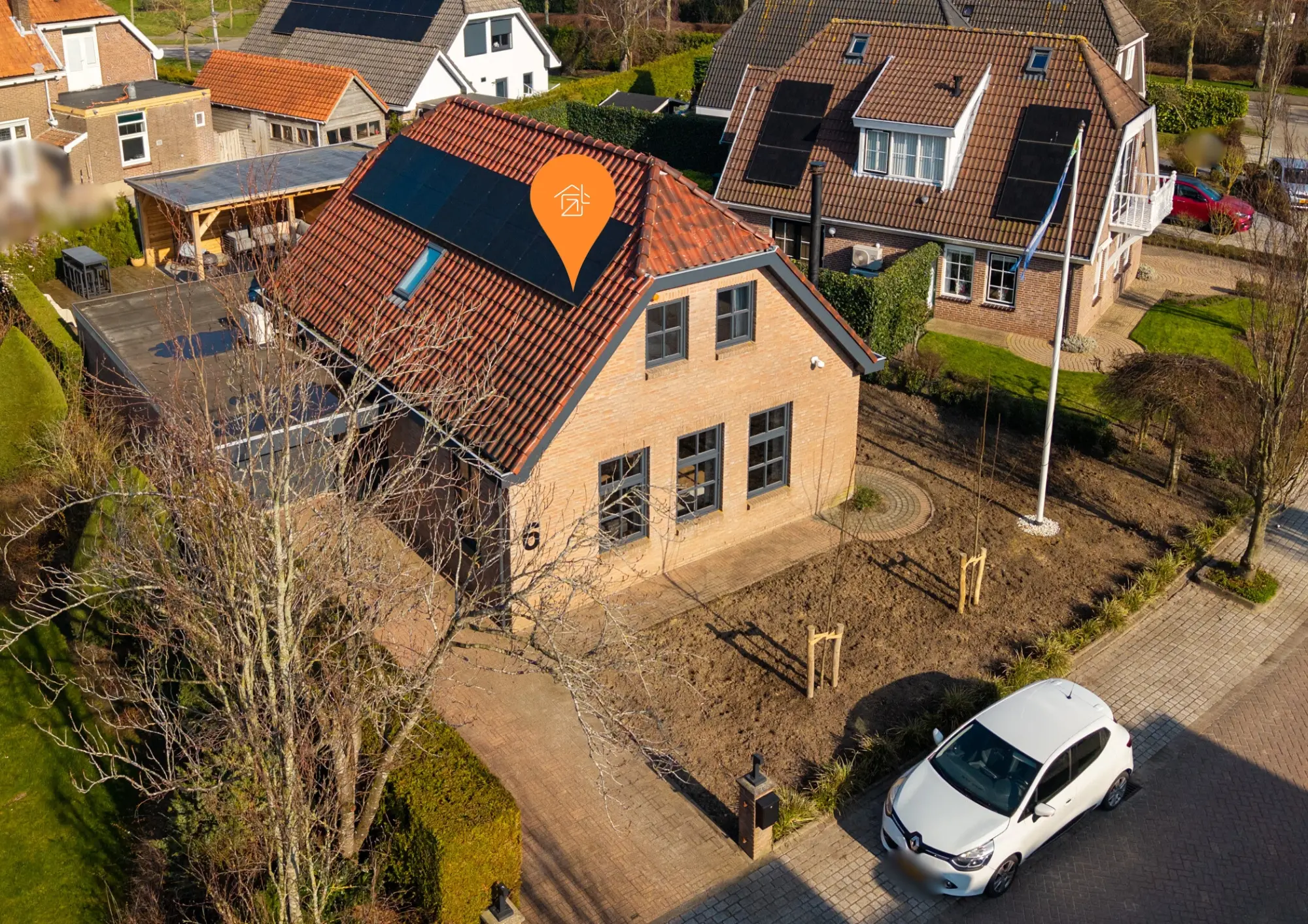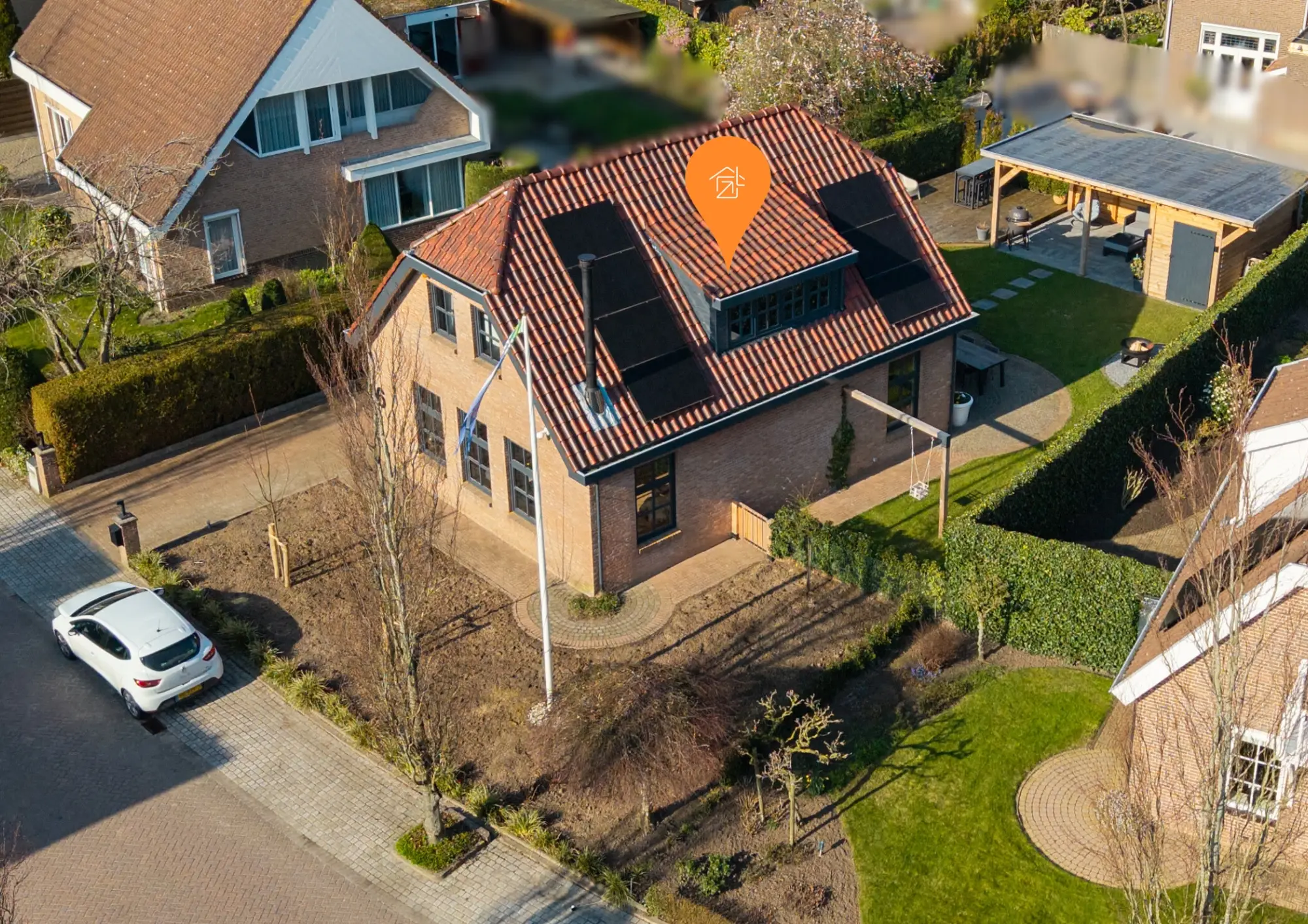 Het gazon loopt door naar de voorzijde van de woning, waar zich ook de oprit naar de garage bevindt.