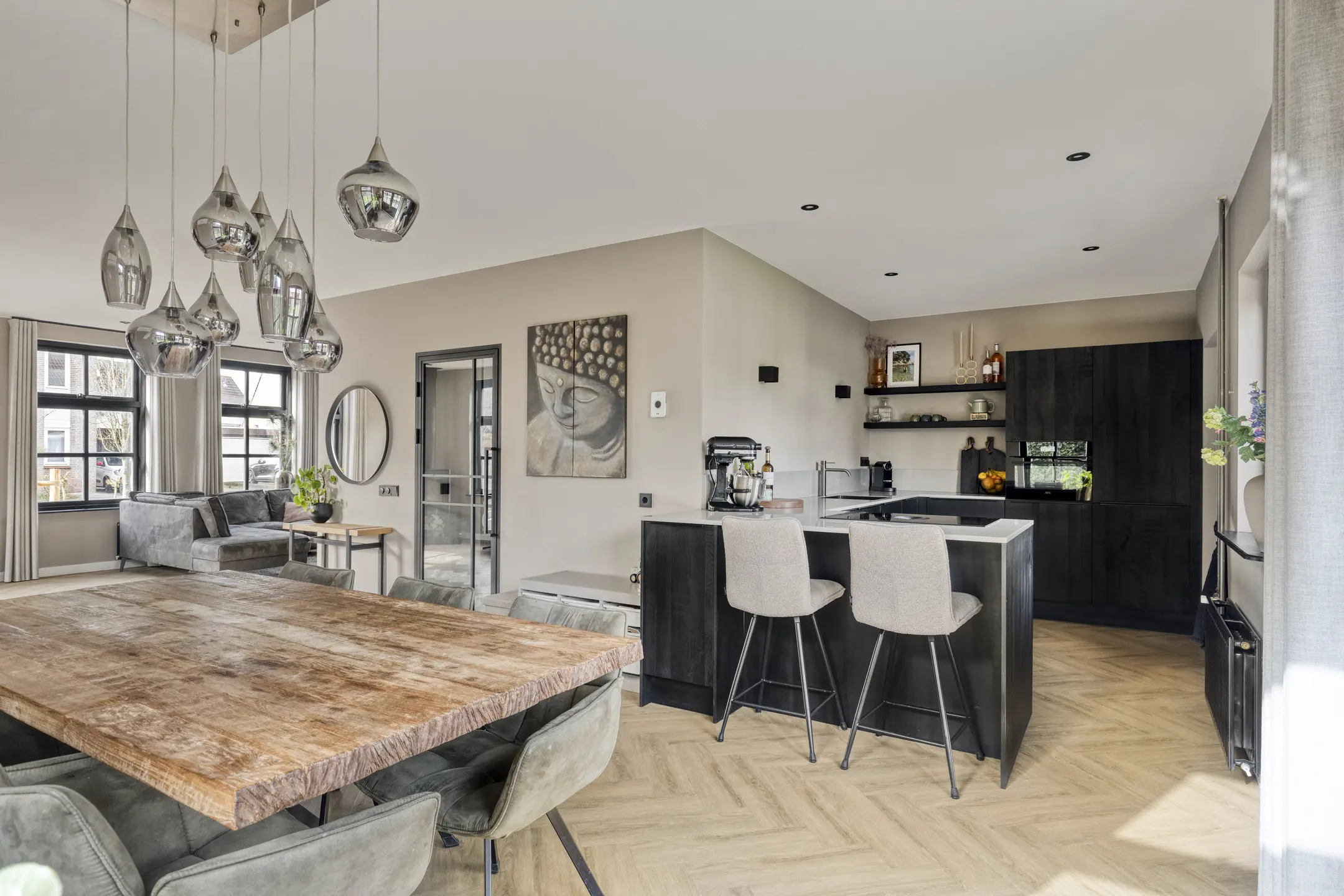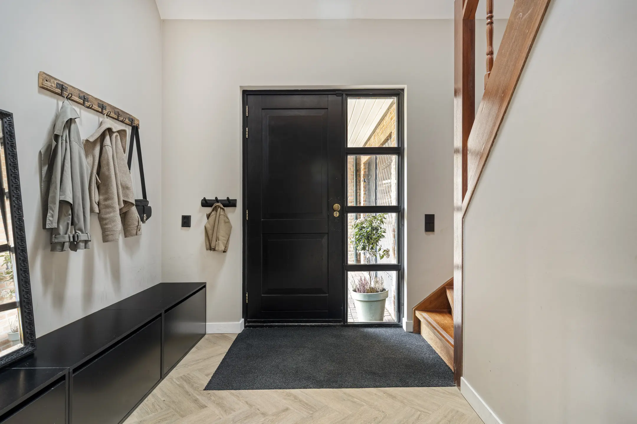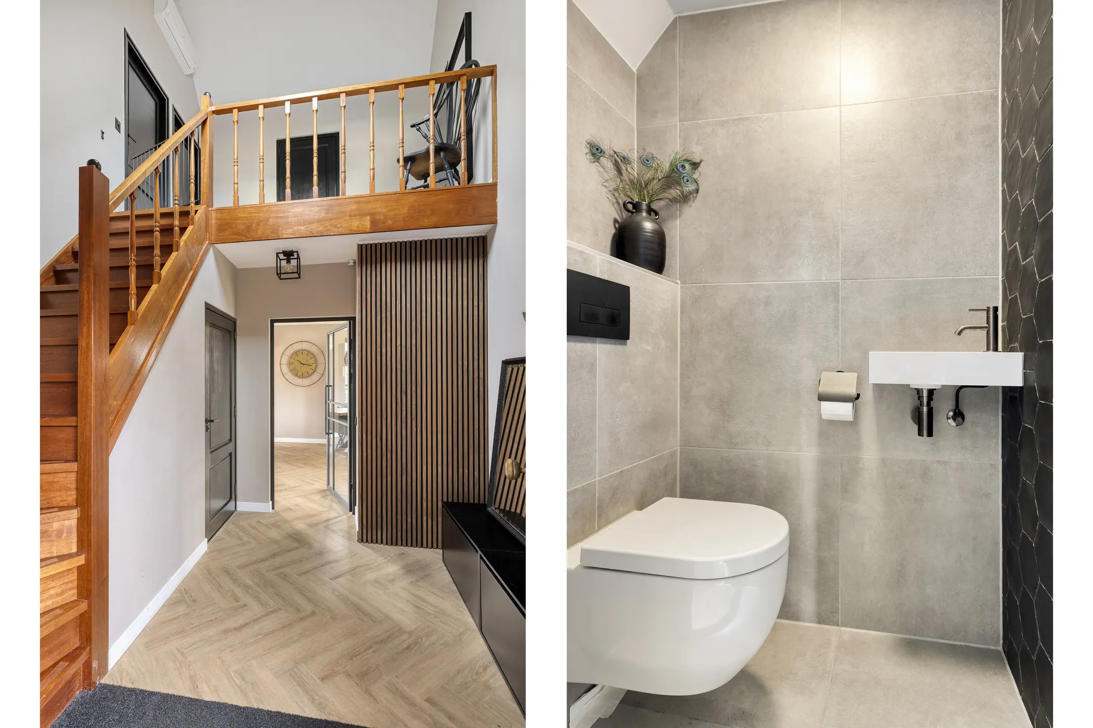De begane grond is met veel oog voor detail afgewerkt, waardoor de woning een verzorgde en eigentijdse uitstraling heeft. Je komt binnen in een ruime en lichte hal waar de vide direct in het oog springt. Dit geeft de entree een open en ruimtelijk karakter. In de hal bevinden zich de meterkast, het moderne (hang)toilet met fonteintje, de trap naar de eerste verdieping en de stijlvolle taatsdeur naar de woonkamer.