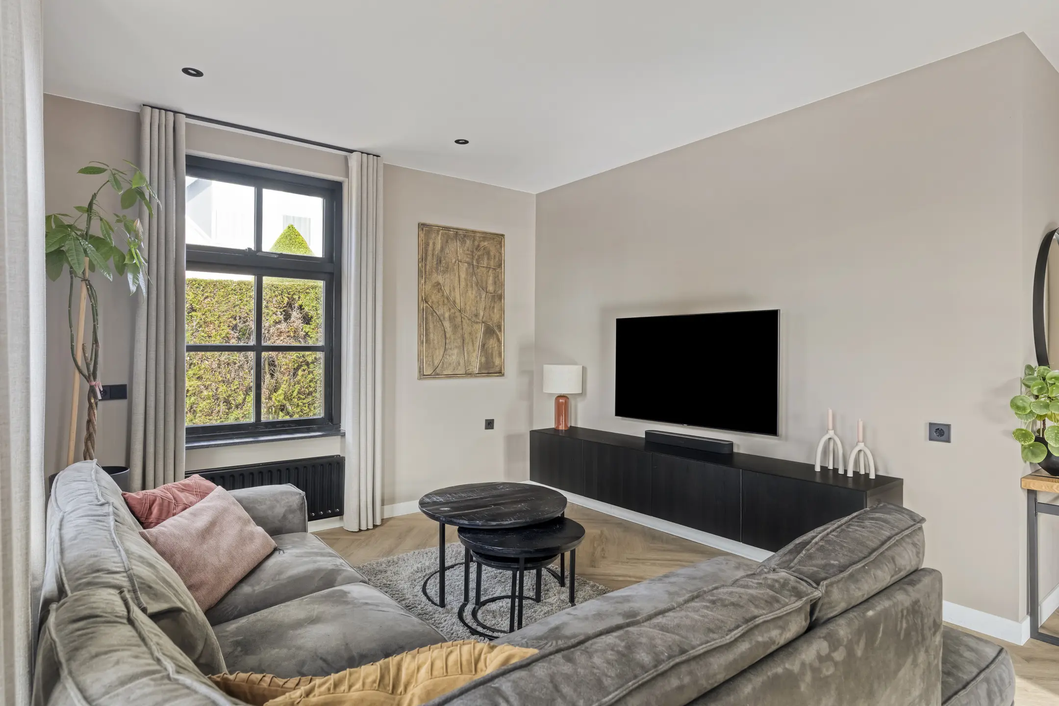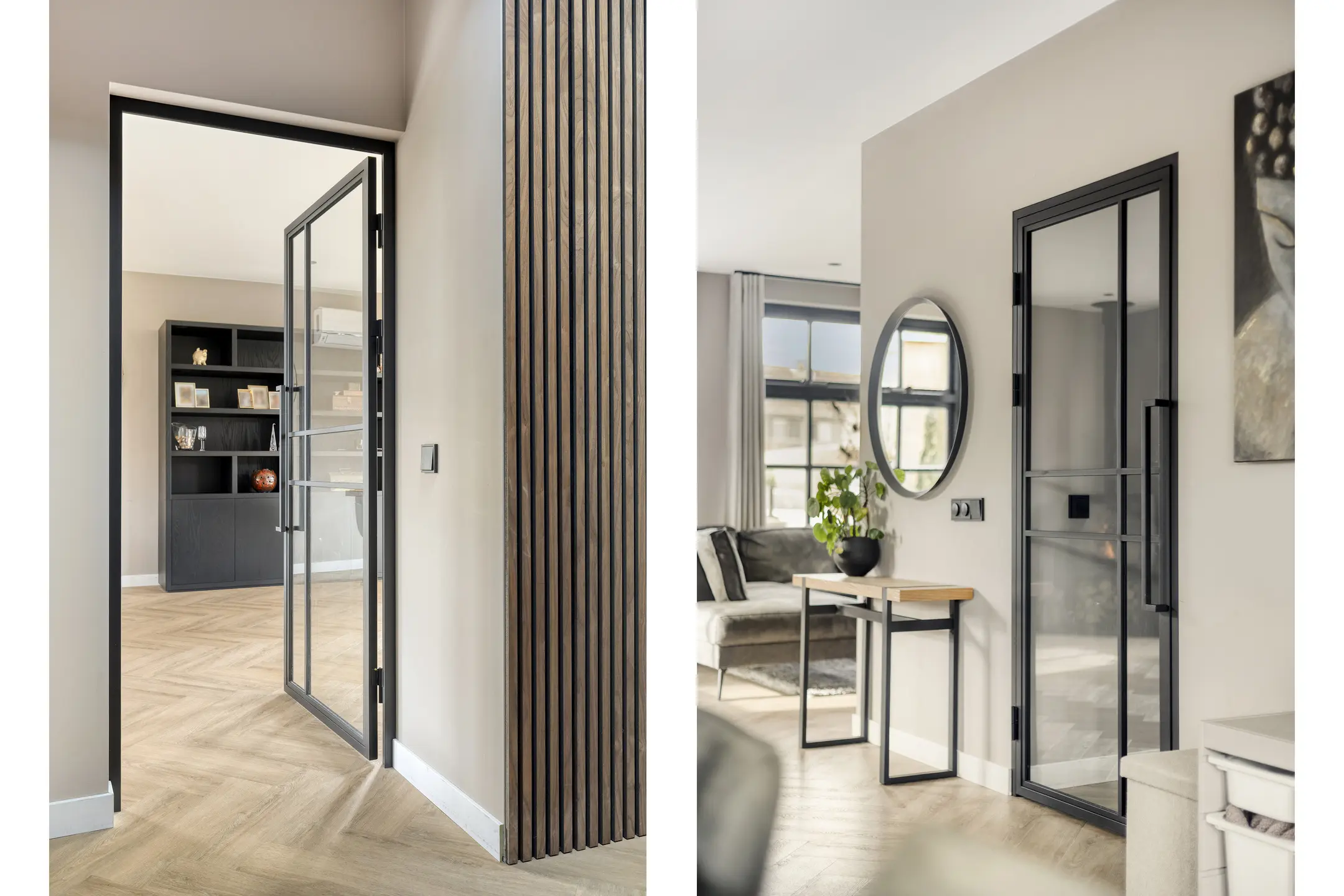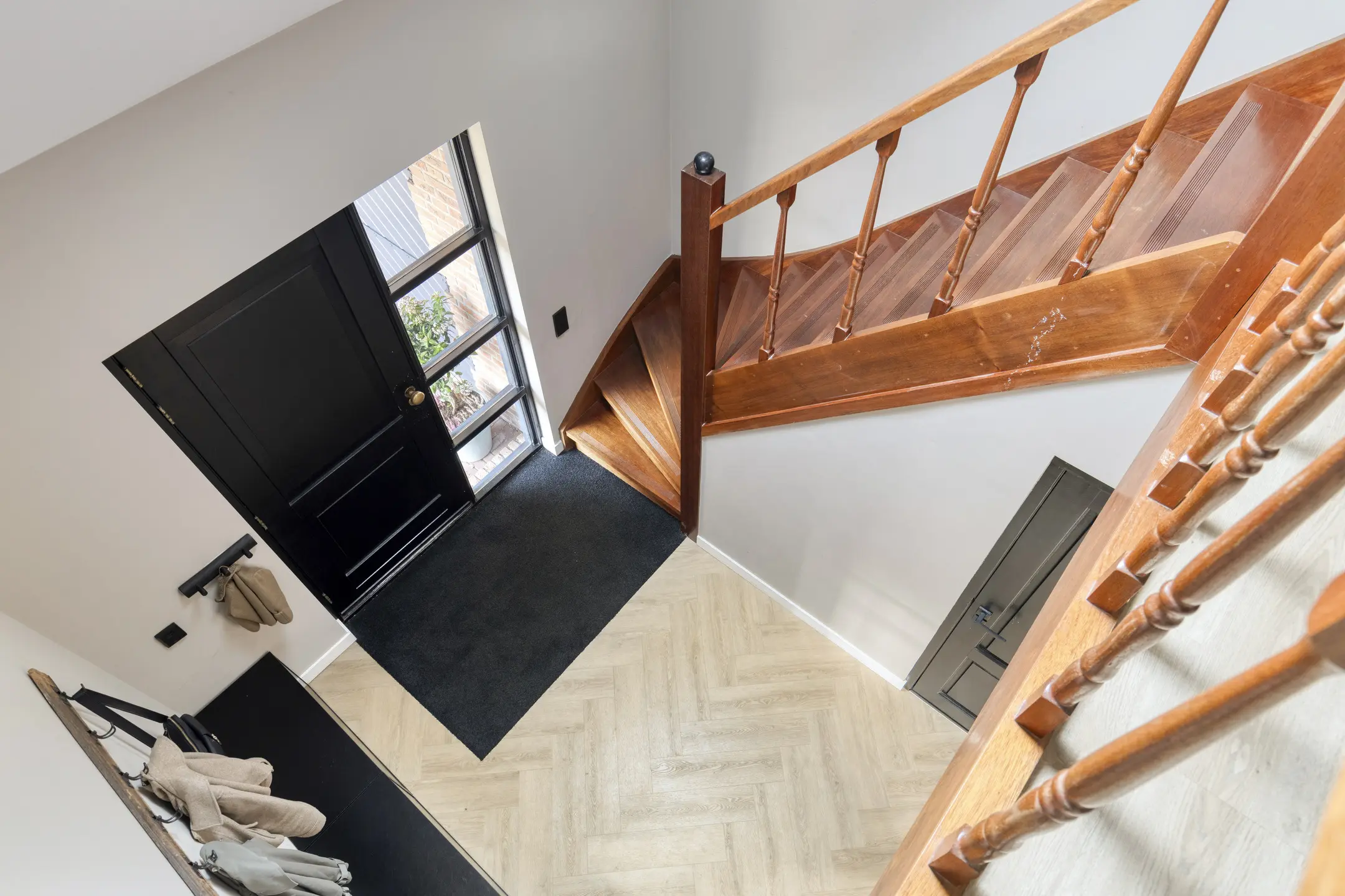 De begane grond is met veel oog voor detail afgewerkt, waardoor de woning een verzorgde en eigentijdse uitstraling heeft. Je komt binnen in een ruime en lichte hal waar de vide direct in het oog springt. Dit geeft de entree een open en ruimtelijk karakter. In de hal bevinden zich de meterkast, het moderne (hang)toilet met fonteintje, de trap naar de eerste verdieping en de stijlvolle taatsdeur naar de woonkamer.