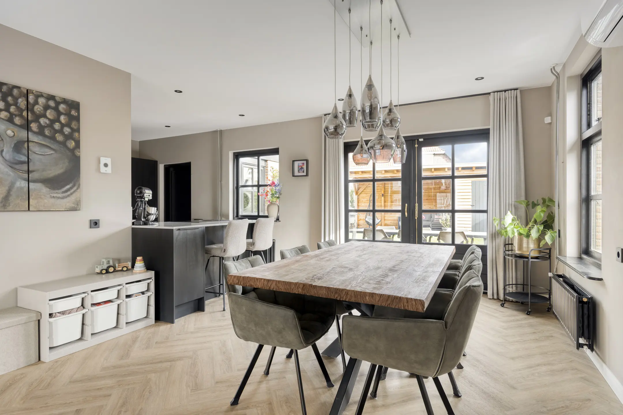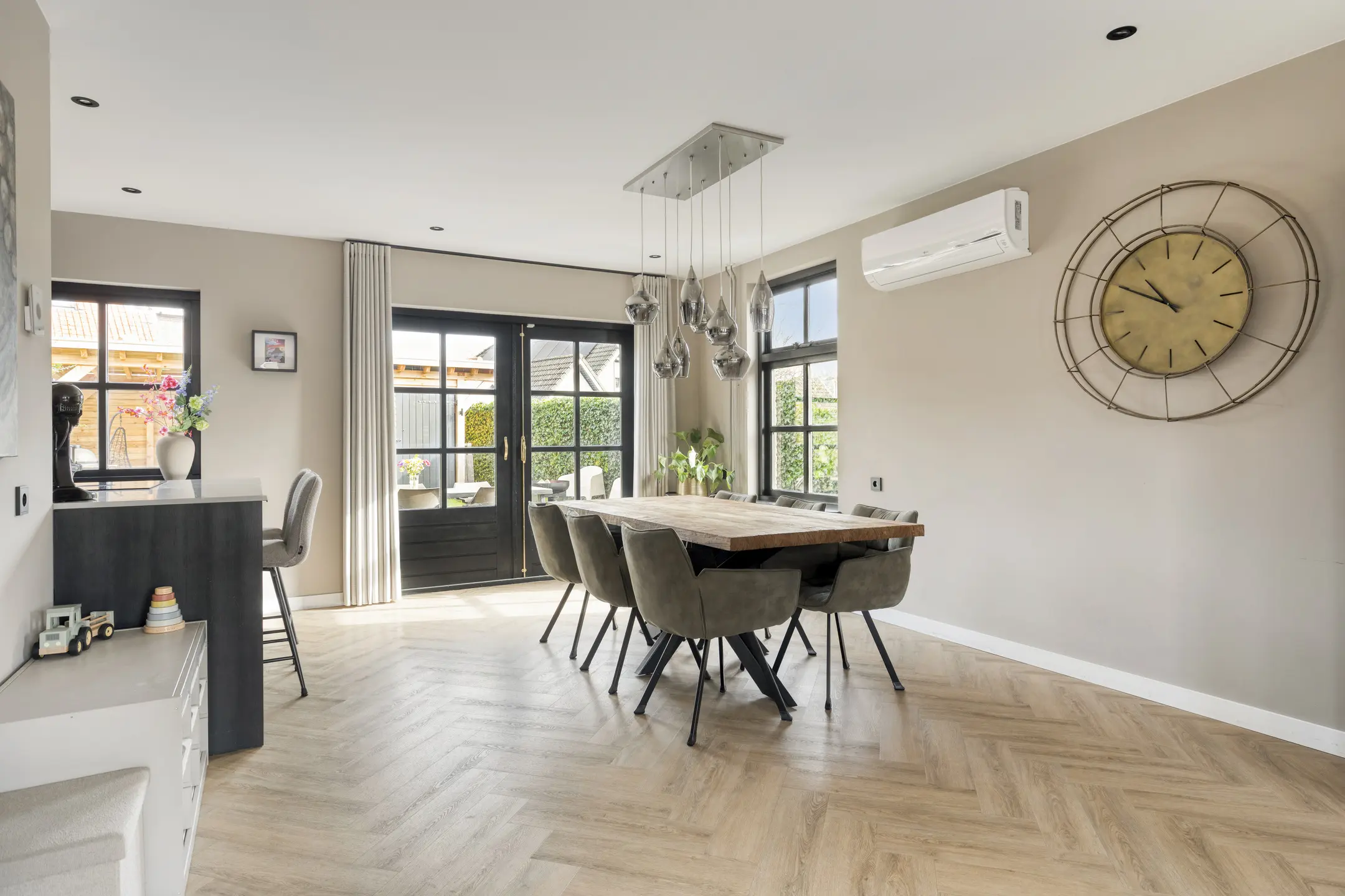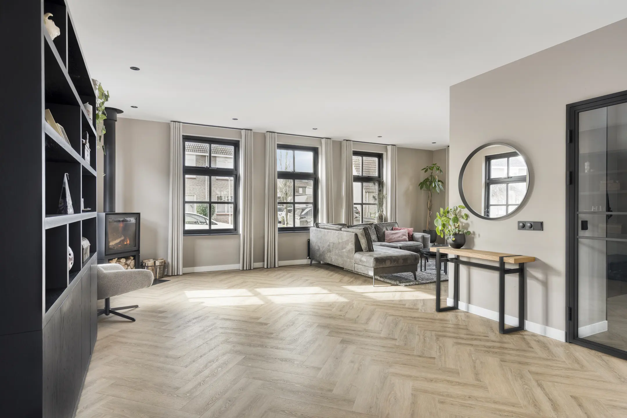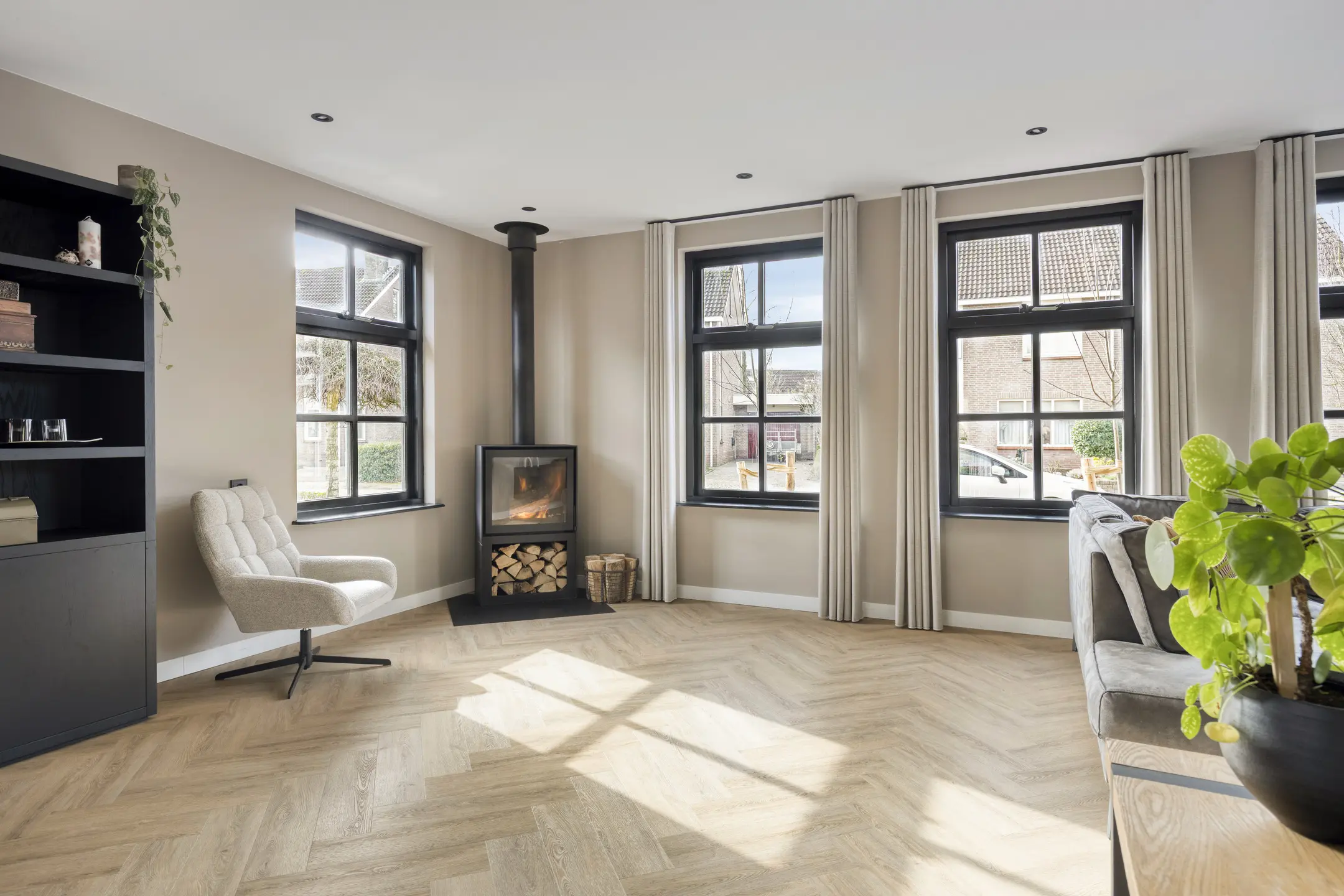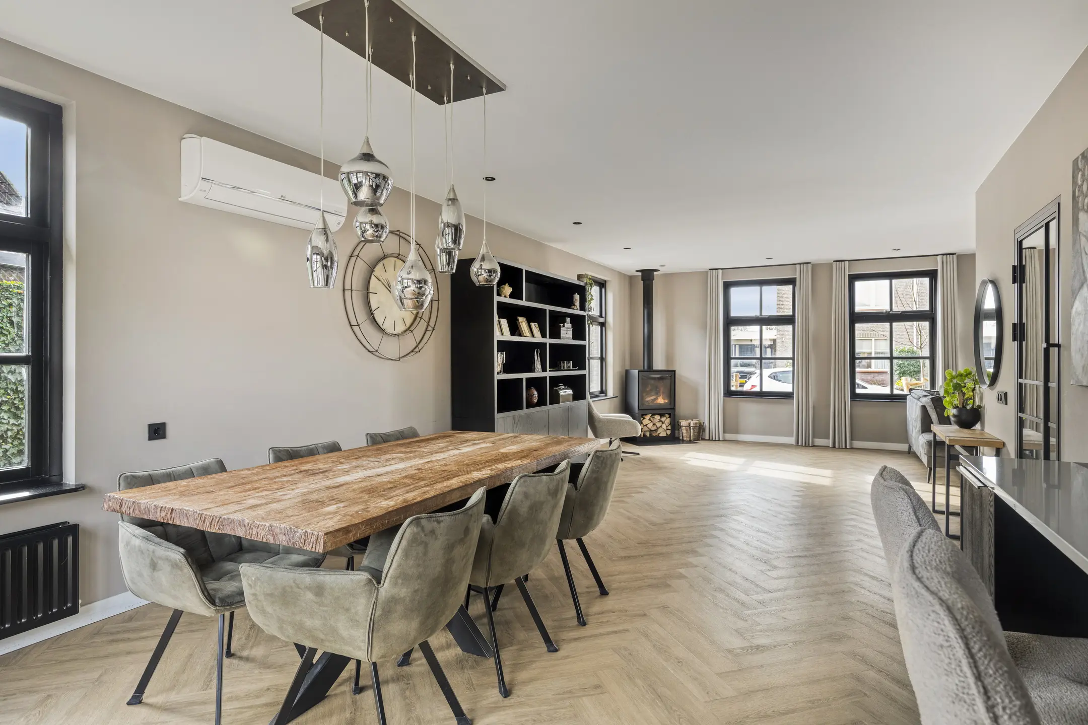 In de woonkamer valt direct de warme sfeer en het ruimtelijke karakter op. De ruimte is afgewerkt met een fraaie PVC visgraatvloer, strakke wandafwerking en inbouwspots in het plafond. De aanwezige airco (koelen en verwarmen) zorgt hier voor extra comfort. Aan de voorzijde van de woning is de gezellige zithoek gesitueerd bij de houtkachel. Er is daarnaast meer dan voldoende ruimte voor bijvoorbeeld een speelhoek voor de kinderen en een ruime eethoek.