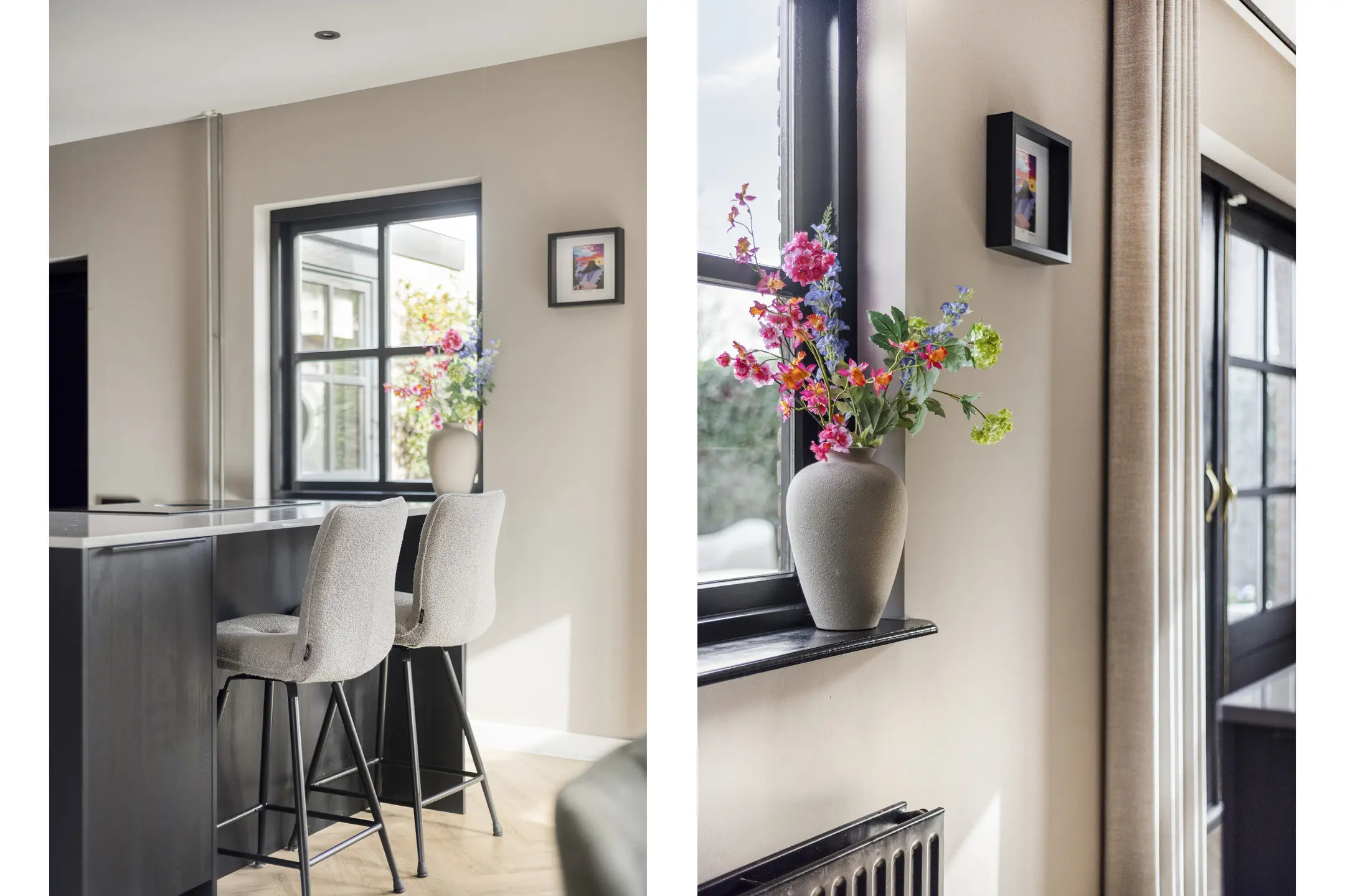 Aan de achterzijde van de woning, bij de openslaande tuindeuren, bevindt zich de moderne woonkeuken. De keuken is uitgevoerd in een praktische U-opstelling, waardoor de ruimte optimaal wordt benut. Aan het bar gedeelte kun je bovendien gezellig aanschuiven voor een kop koffie of een snelle maaltijd.