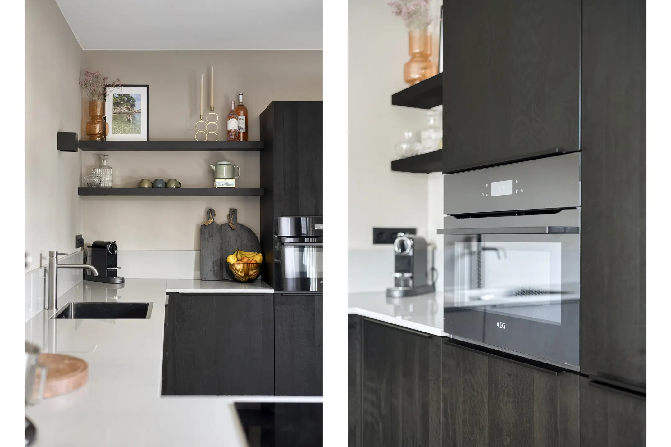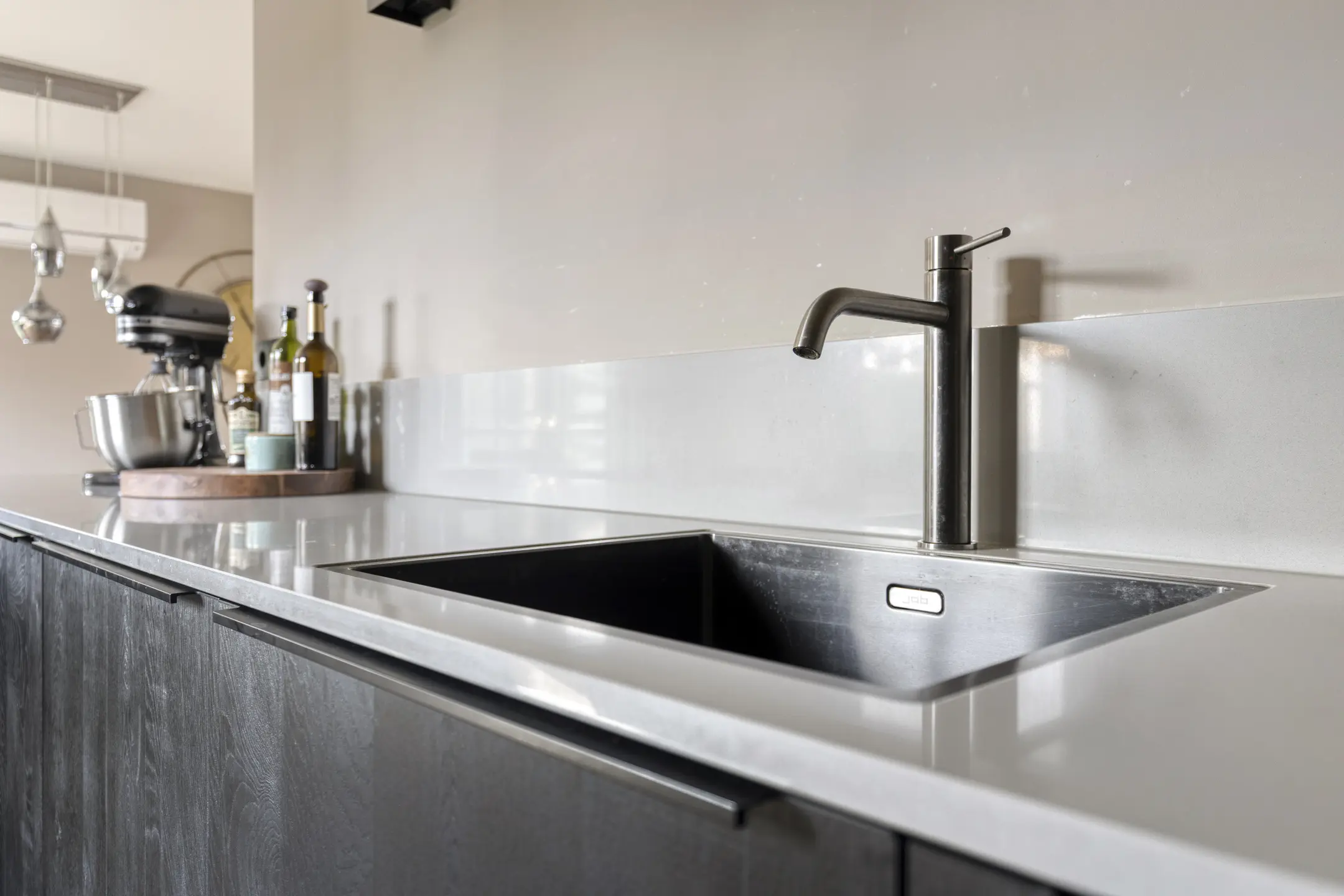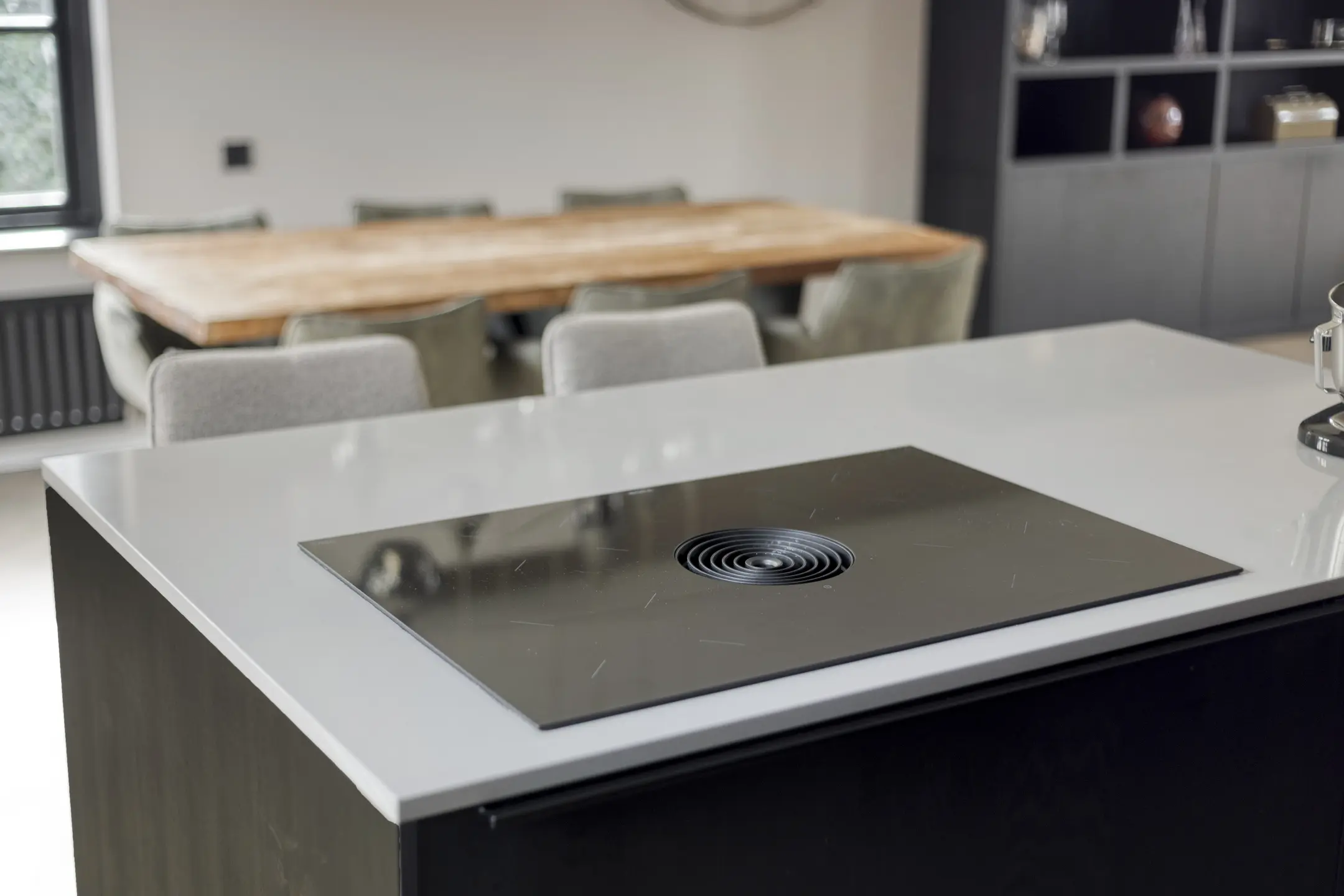 De keuken is afgewerkt met een composiet werkblad en voorzien van een koelkast, vaatwasser, combi-oven en een 4-pits inductiekookplaat met geïntegreerde afzuiging. Het raam zorgt hier voor een fijne lichtinval.