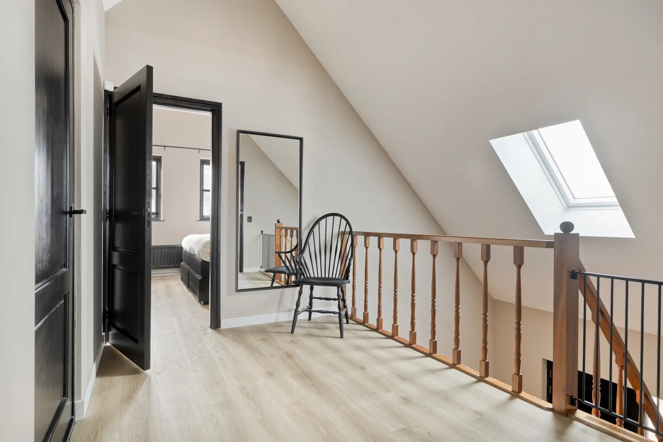 Ook de eerste verdieping is netjes afgewerkt met een PVC vloer en biedt toegang tot 3 slaapkamers en de badkamer. Dankzij het Velux dakraam is de overloop aangenaam licht. Hier hangt tevens een airco die de volledige bovenverdieping kan koelen of extra kan verwarmen.