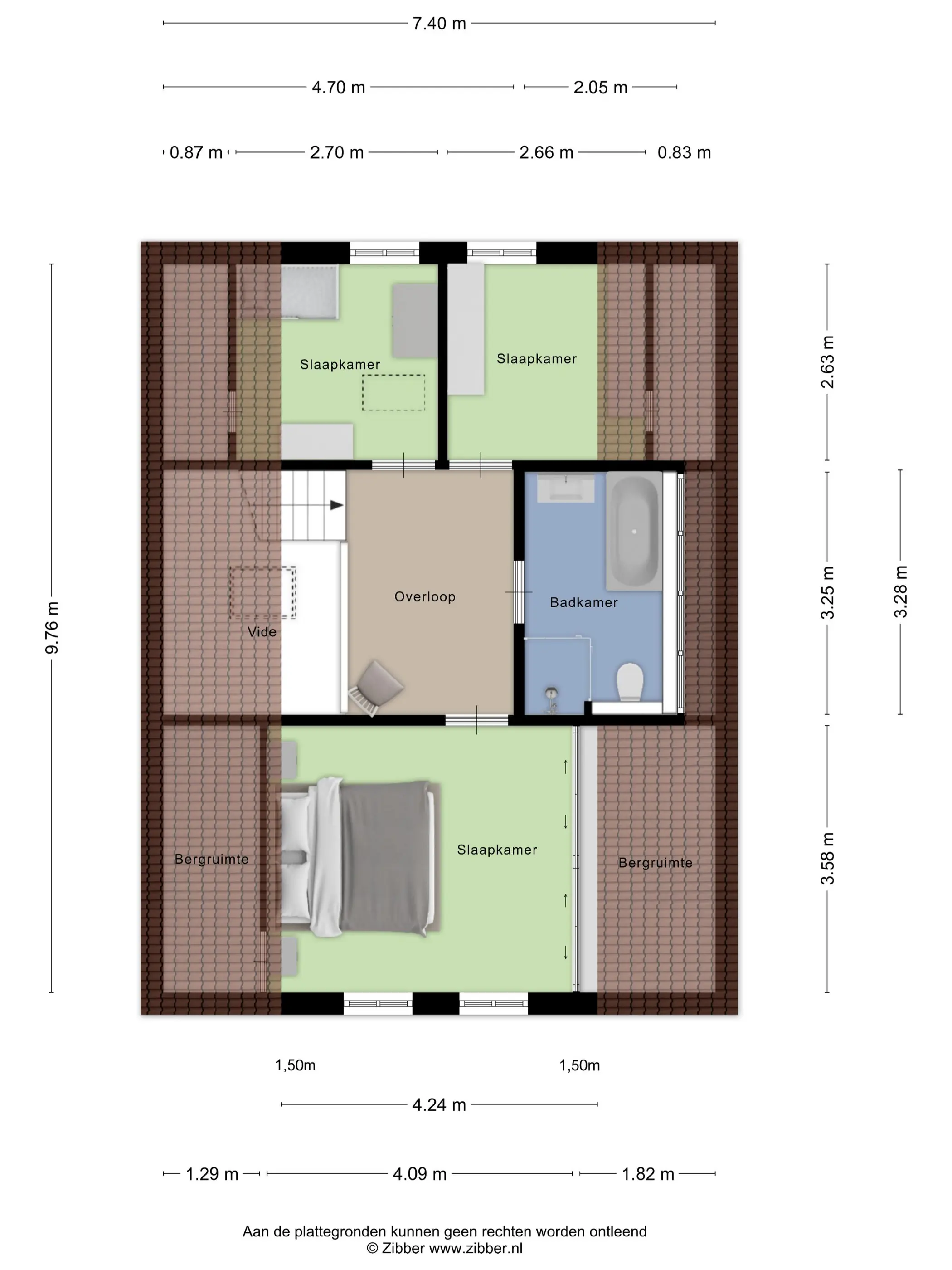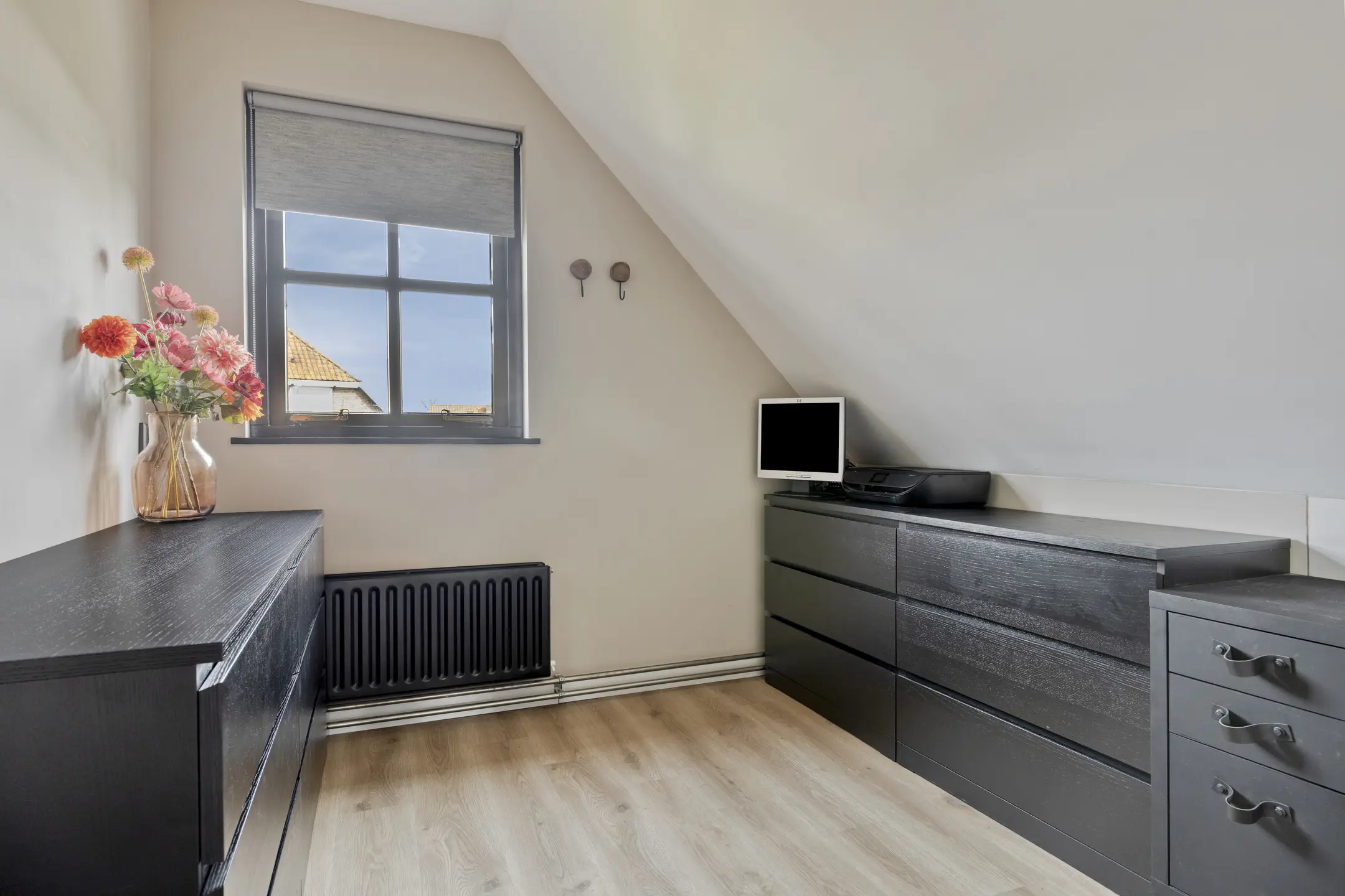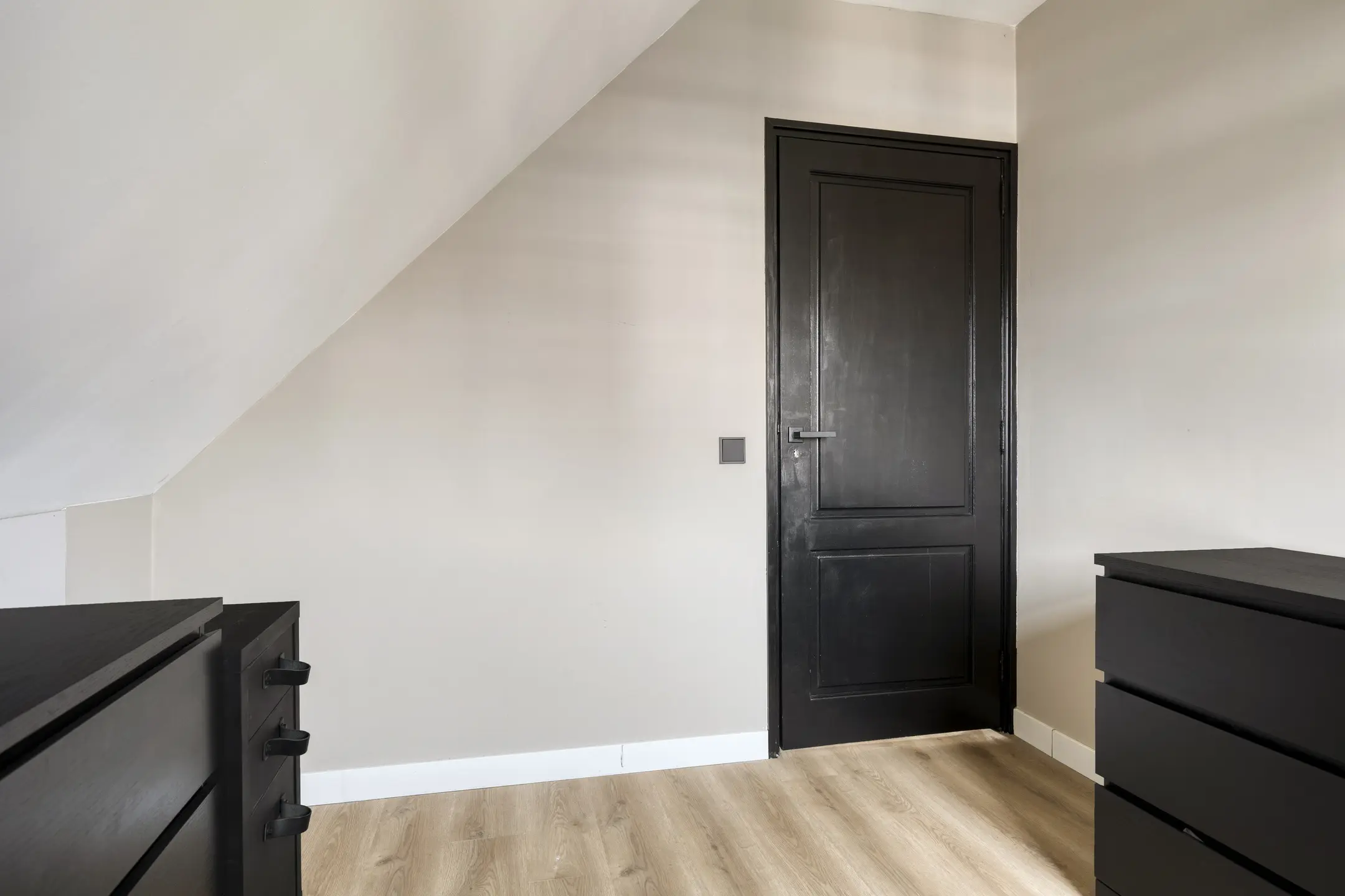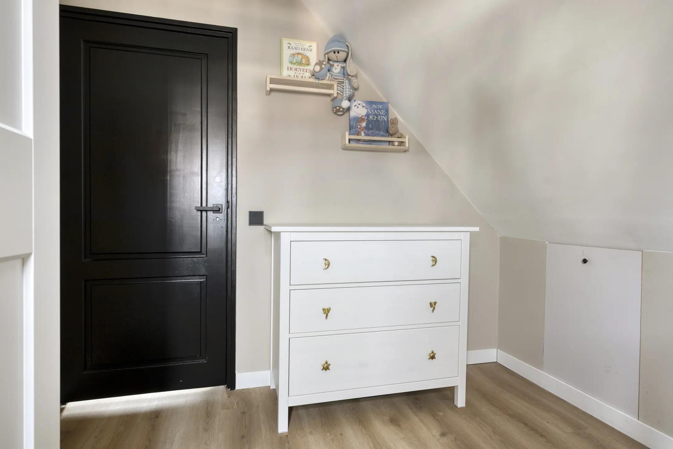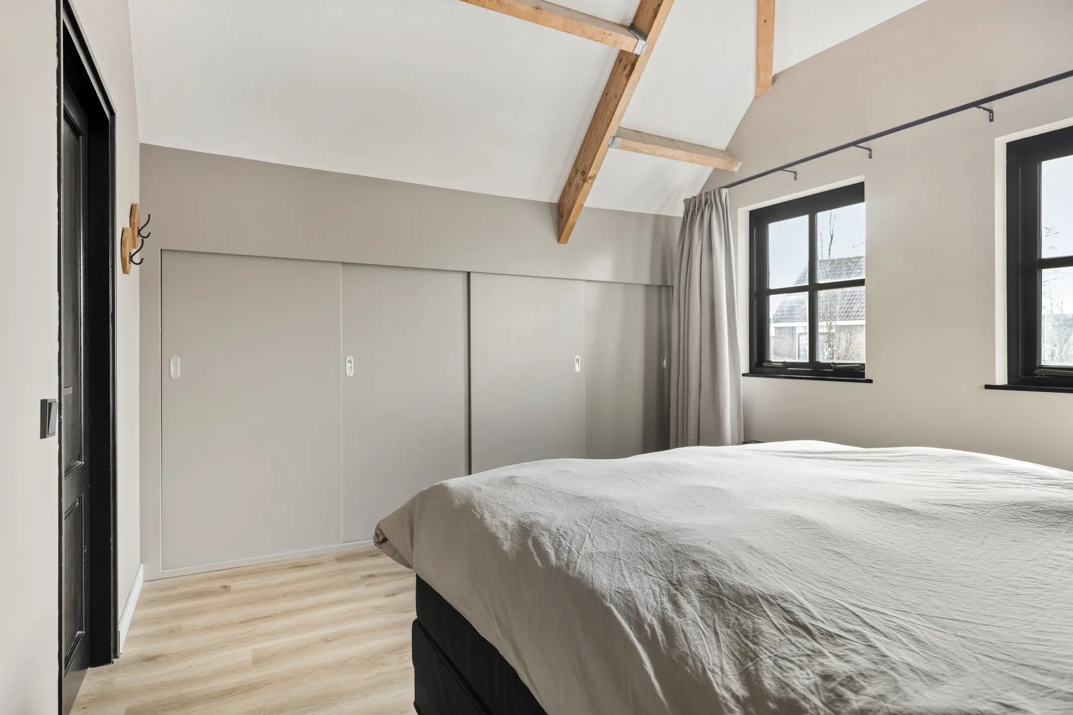 De slaapkamer aan de voorzijde is de grootste kamer, waar de spanten mooi in het zicht zijn. Daarnaast is er een handige vaste kast voor kleding en een lager knieschot voor extra bergruimte. De twee slaapkamers aan de achterzijde hebben een praktisch formaat en zijn bijvoorbeeld ook goed te gebruiken als kinder-, logeer- of werkkamer. Eén van deze kamers beschikt over een luik naar de bergzolder, waar zich onder andere de omvormer van de zonnepanelen bevindt.