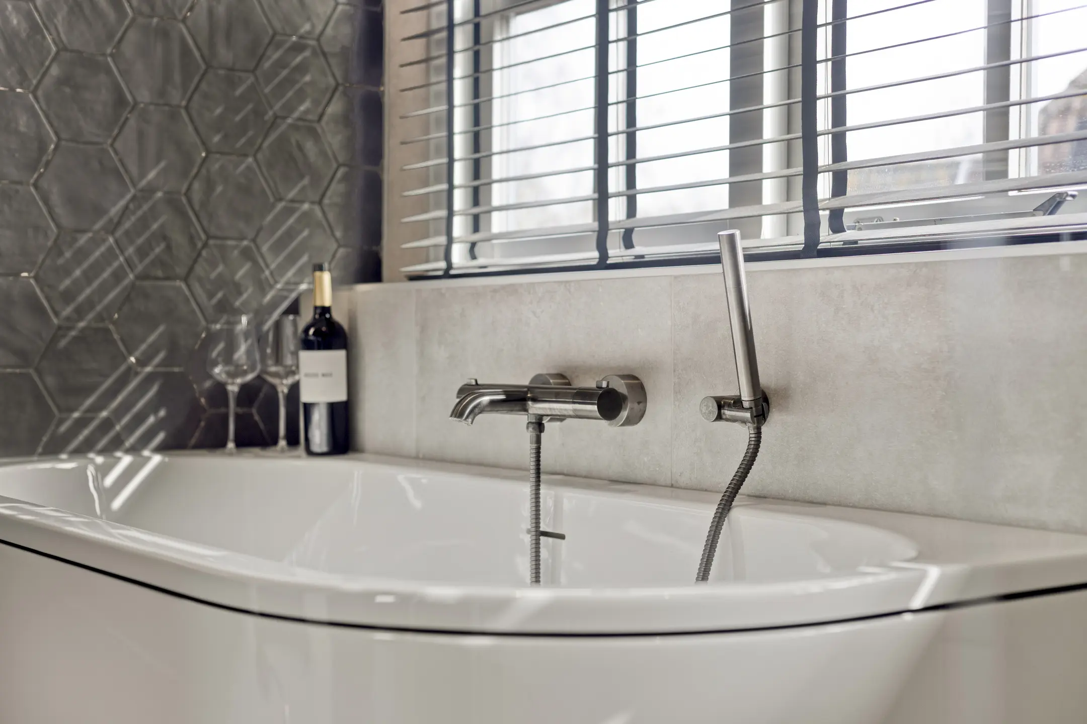De complete badkamer is strak en modern uitgevoerd en voorzien van stijlvolle gunmetal kranen en accessoires. De ruimte beschikt over een hangtoilet, inloopdouche, ligbad, wastafel met badmeubel, designradiator en mechanische ventilatie. Het grote raam in de dakkapel zorgt voor prettig daglicht.