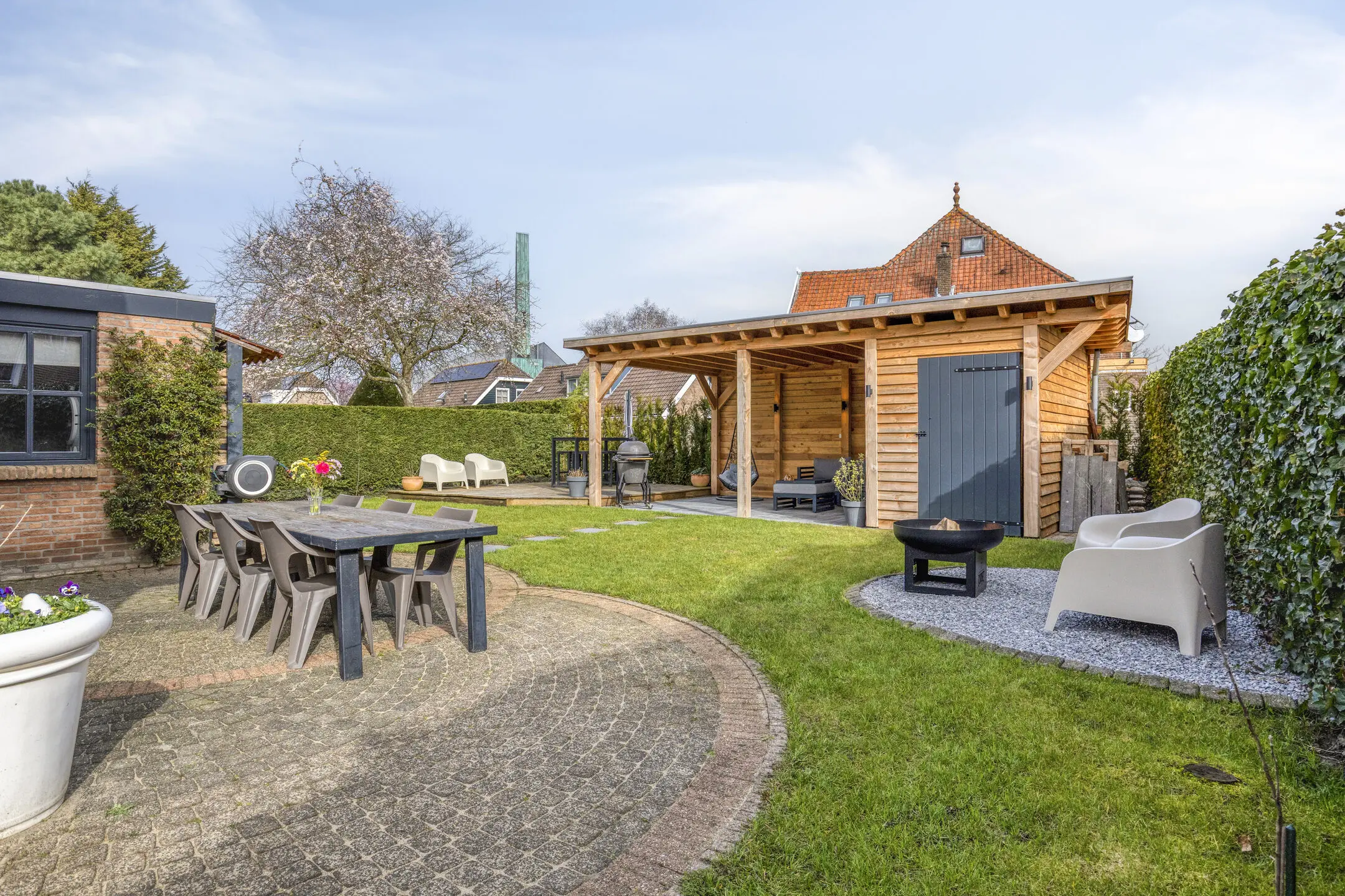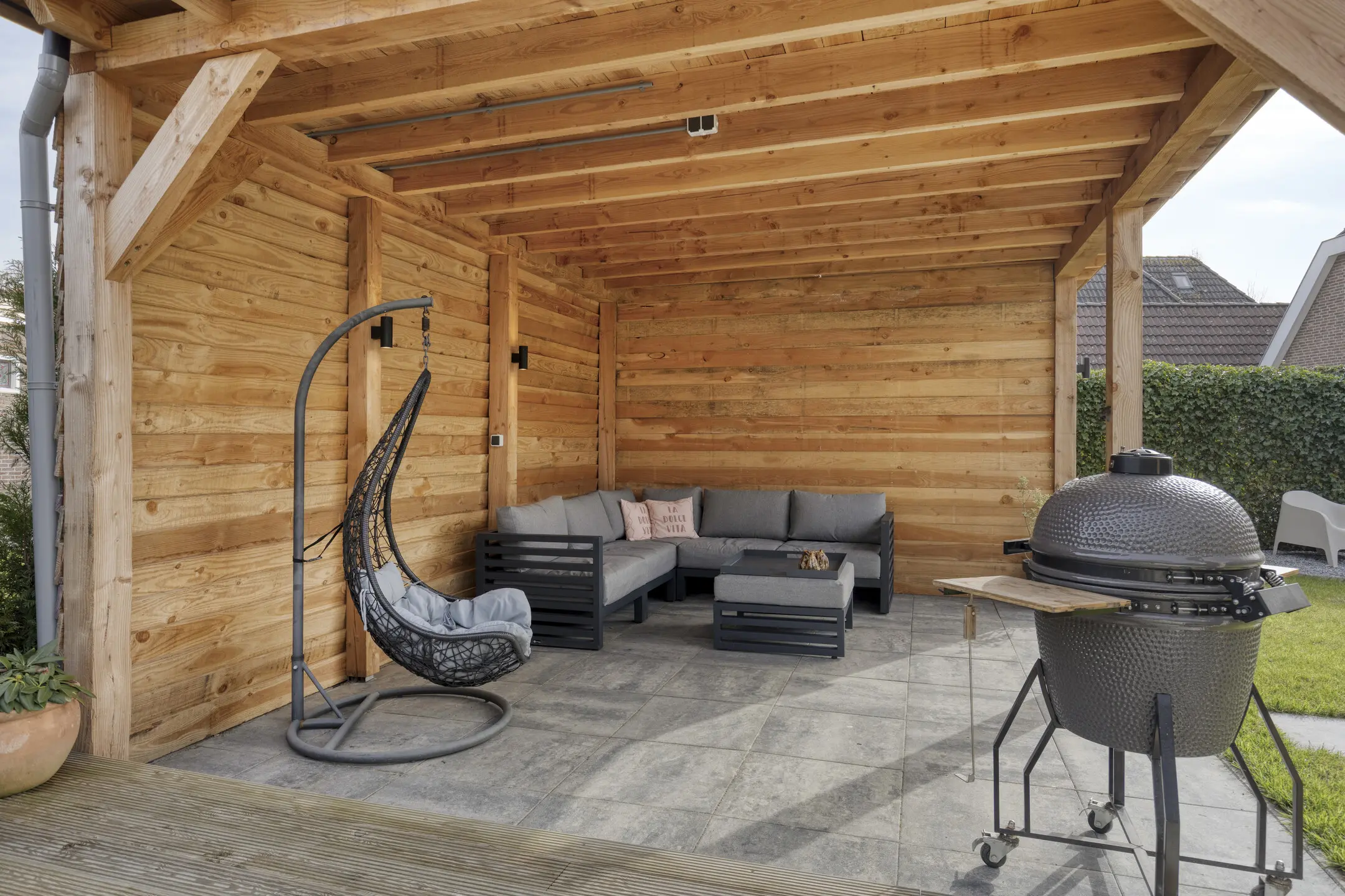 De achtertuin is een heerlijke plek gelegen op het noord-oosten en biedt verschillende terrassen en zitjes, met daarnaast voldoende ruimte voor bijvoorbeeld een speeltoestel voor de kinderen. Achterin de tuin staat een sfeervolle overkapping met berging, waar je beschut kunt zitten en optimaal kunt genieten van het buitenleven.