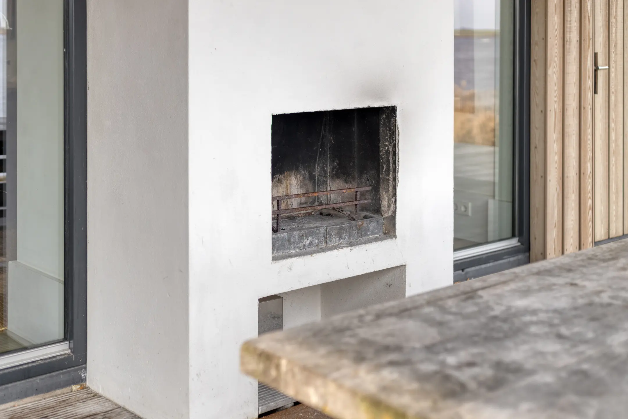 Hier zorgt de open haard voor warmte en ambiance tijdens alle seizoenen.