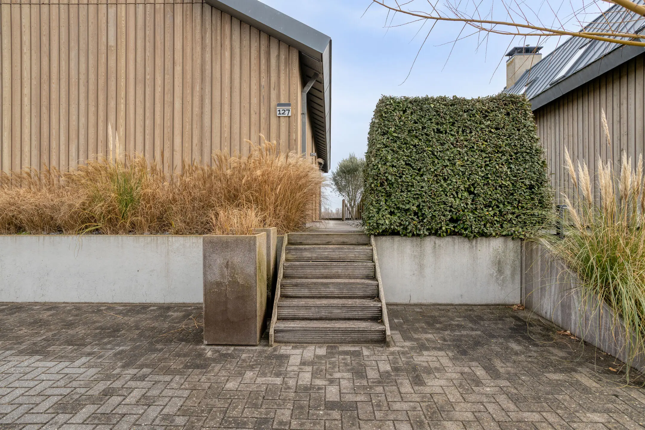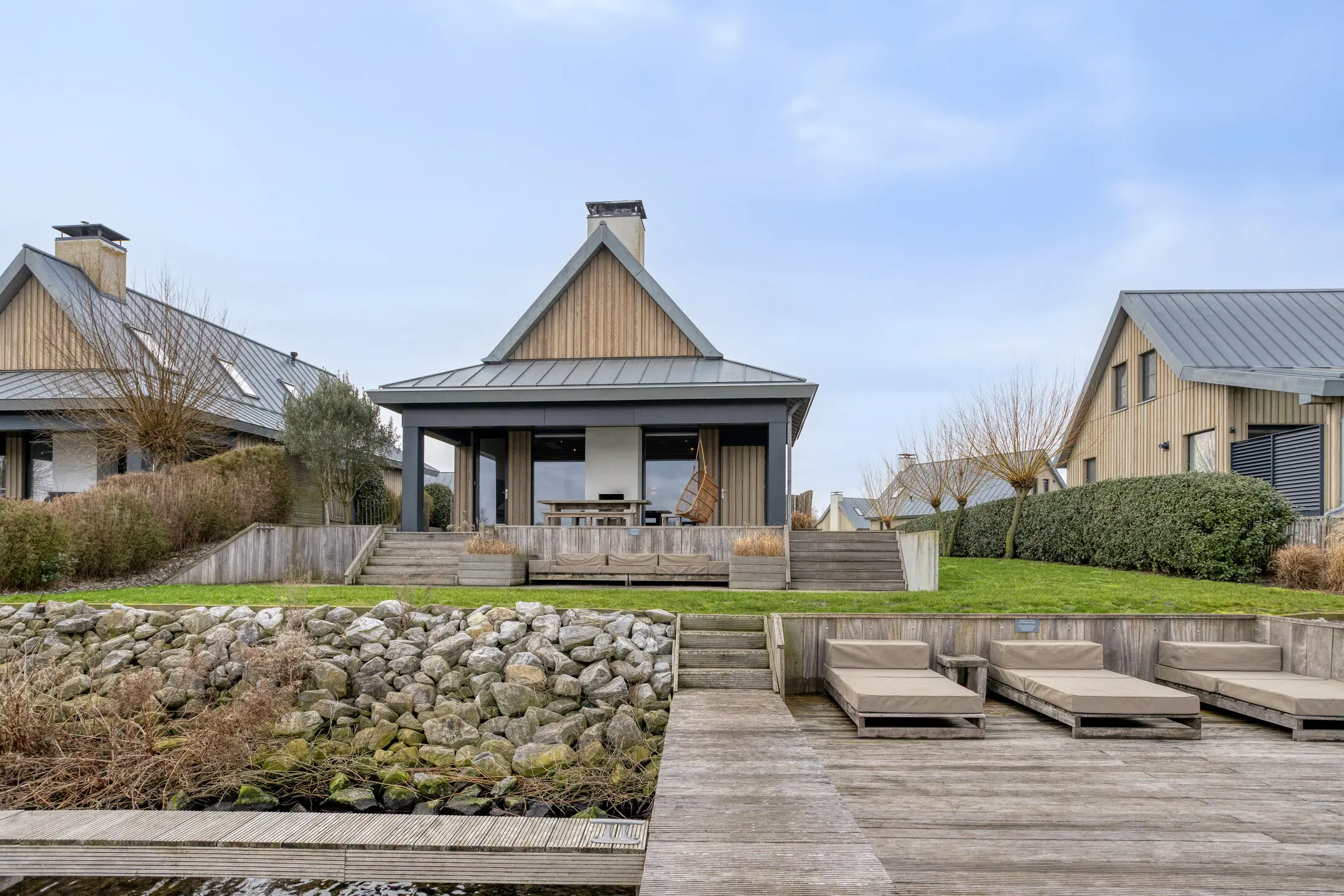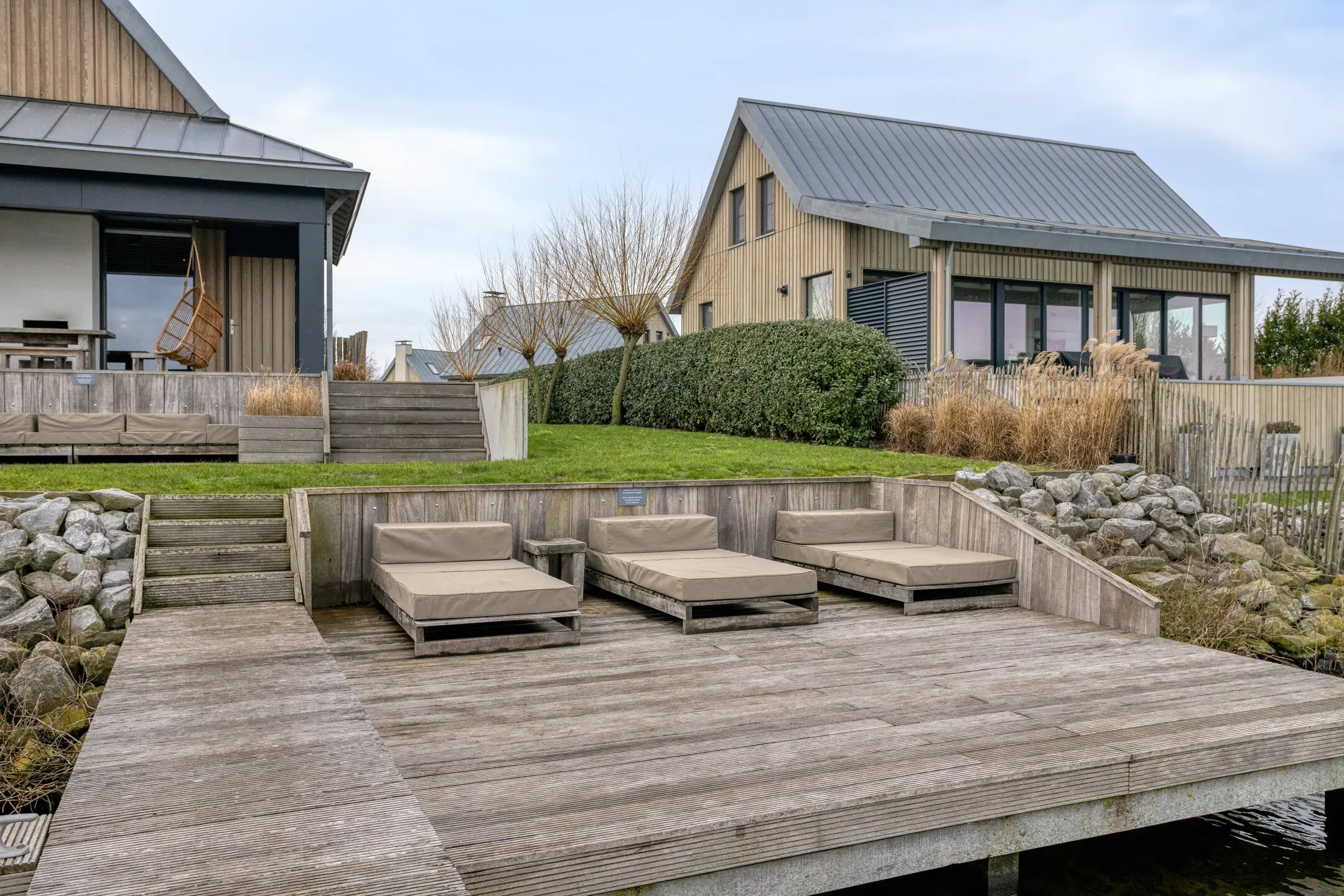 Via trappen bereikt u de verschillende terrassen en uw privé steiger.