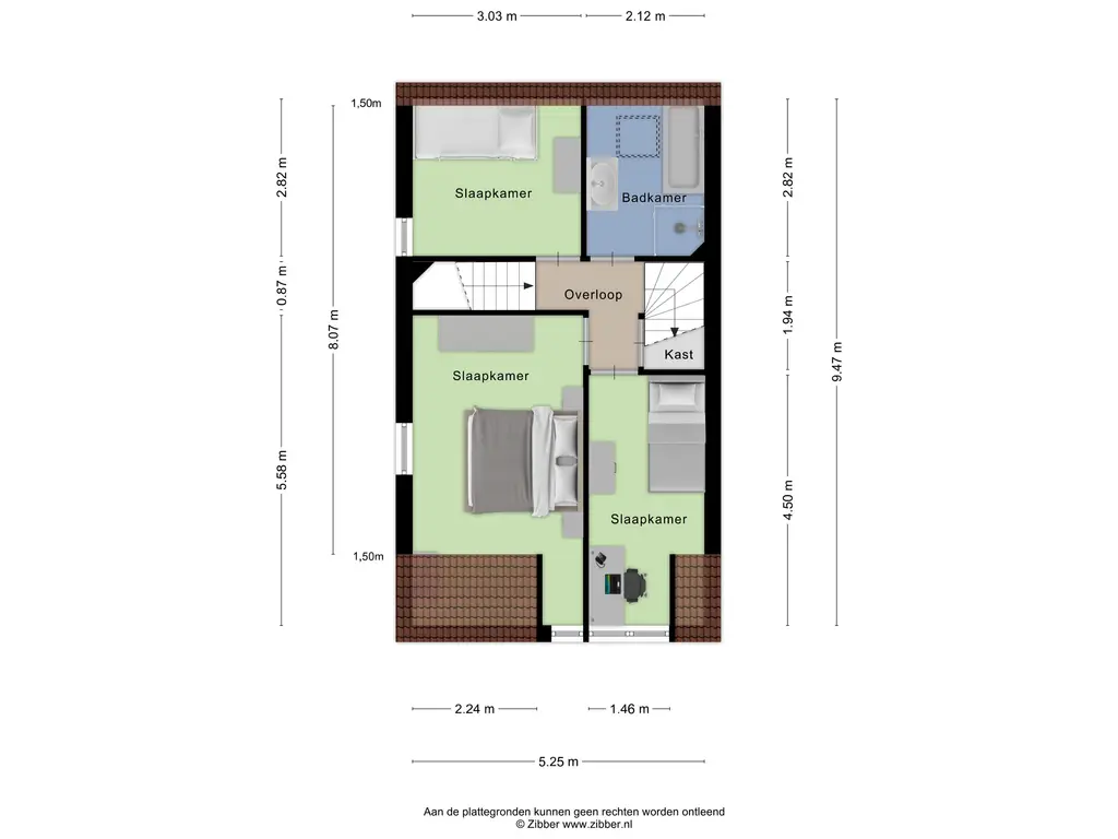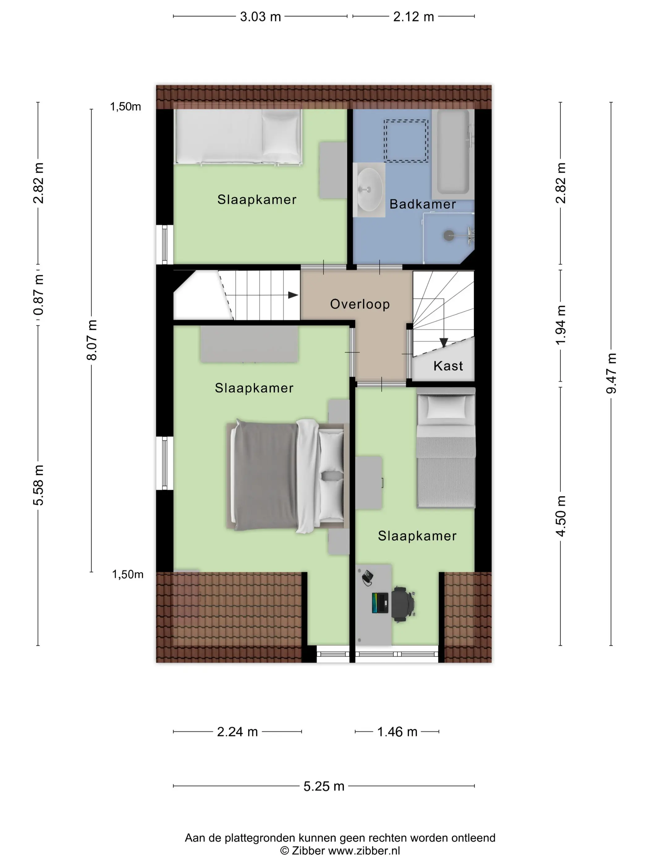 Op de overloop krijg je toegang tot maar liefst drie slaapkamers en de badkamer. Daarnaast is er een handige vaste kast voor extra bergruimte, en vanaf hier bereik je via de vaste trap ook de tweede verdieping. Alle drie de slaapkamers zijn praktisch ingedeeld, lekker licht en voorzien van comfortabele vloerbedekking.