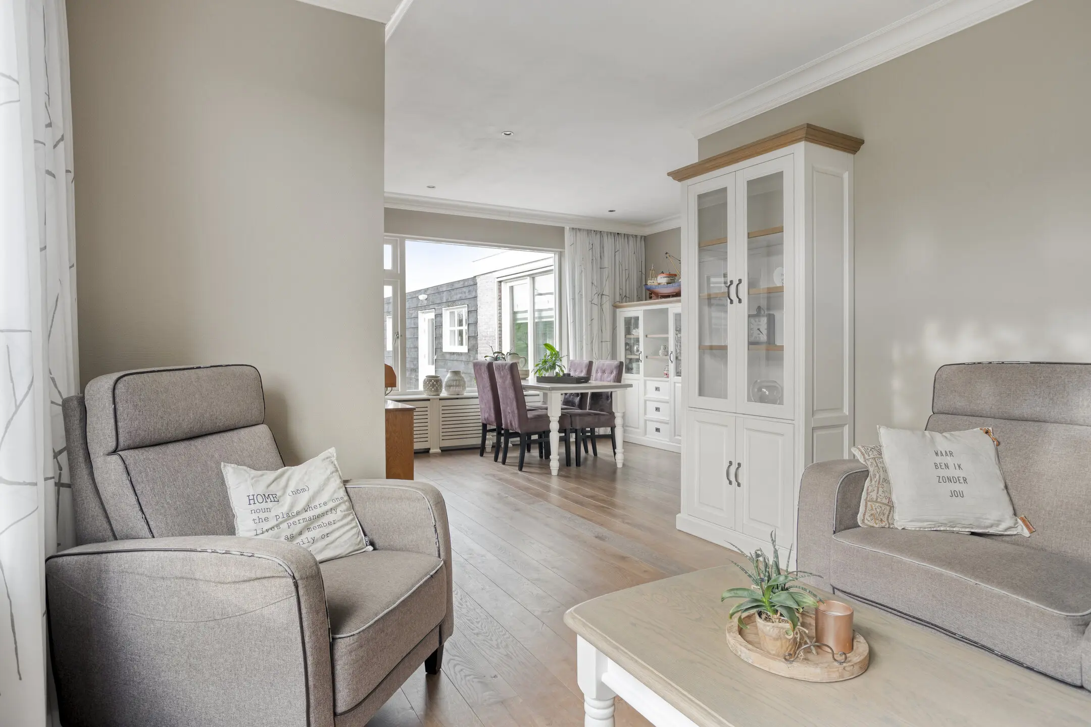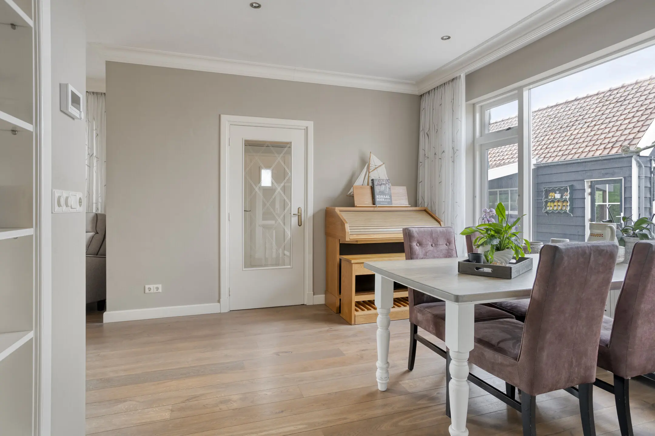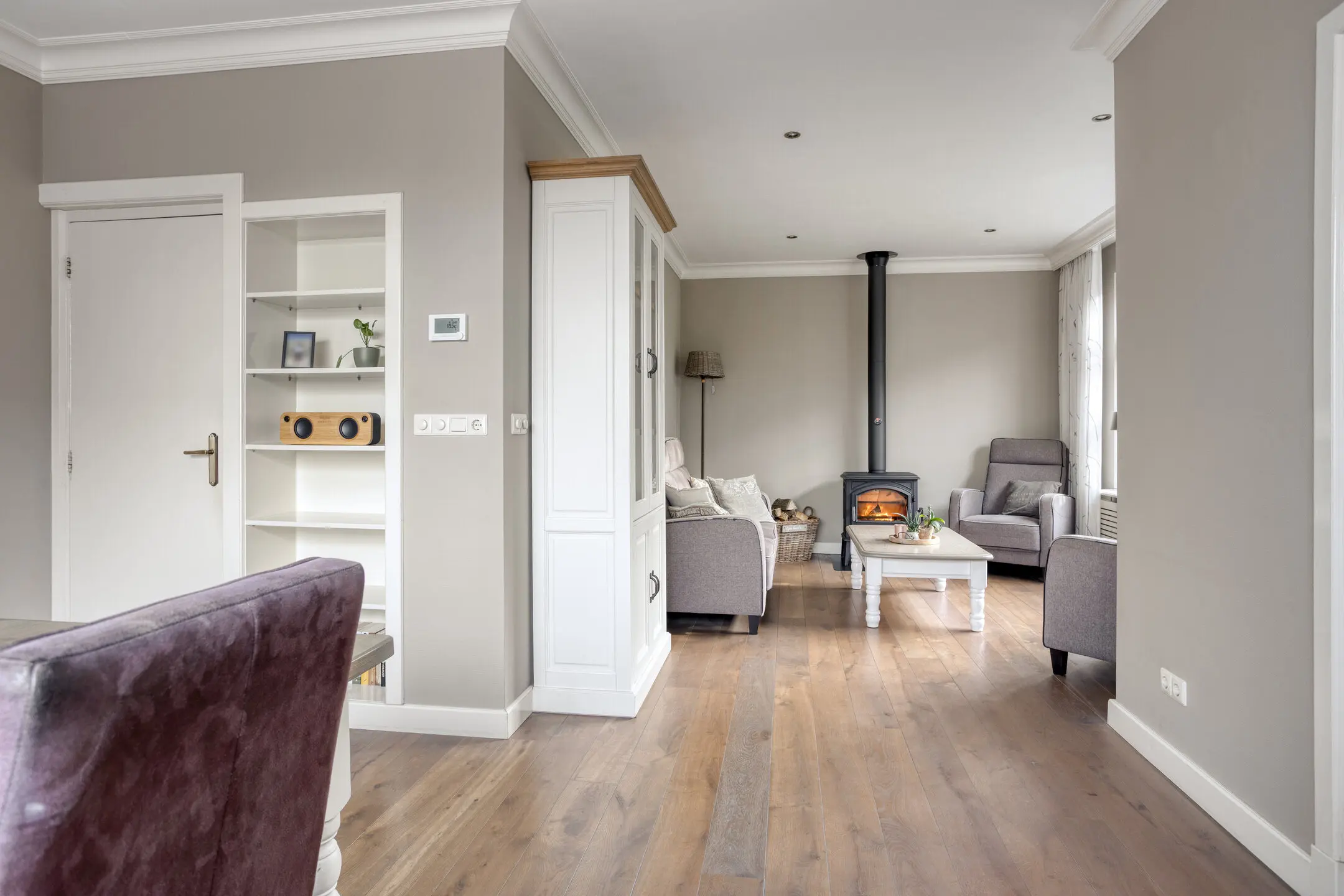Dit is zo’n huis waar de voordeur er vooral voor de sier is — de meeste mensen komen hier gezellig achterom binnen en ploffen neer aan de keukentafel, zoals het hoort in de polder. Maar voor het gemak beginnen we onze rondleiding toch even bij de voordeur. Via de hal — met meterkast, handige vaste kast en de deur naar de woonkamer — kom je in een fijne leefruimte met eiken vloerdelen. De zithoek rond de open haard is een plek waar het dagelijks goed toeven is. Richting de keuken is volop ruimte voor een eettafel; dankzij de markiezen blijft het er in de zomer heerlijk koel en sfeervol.