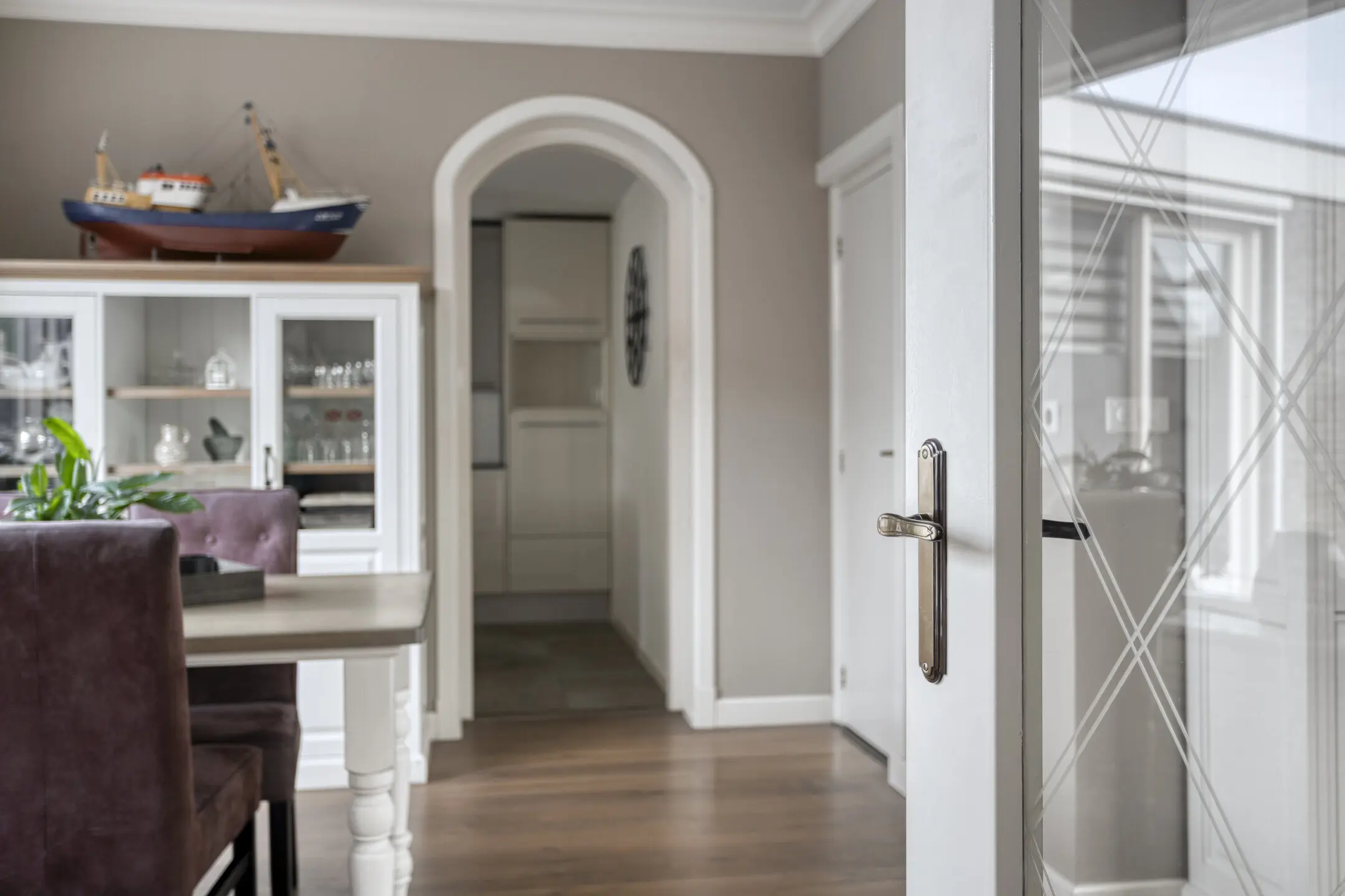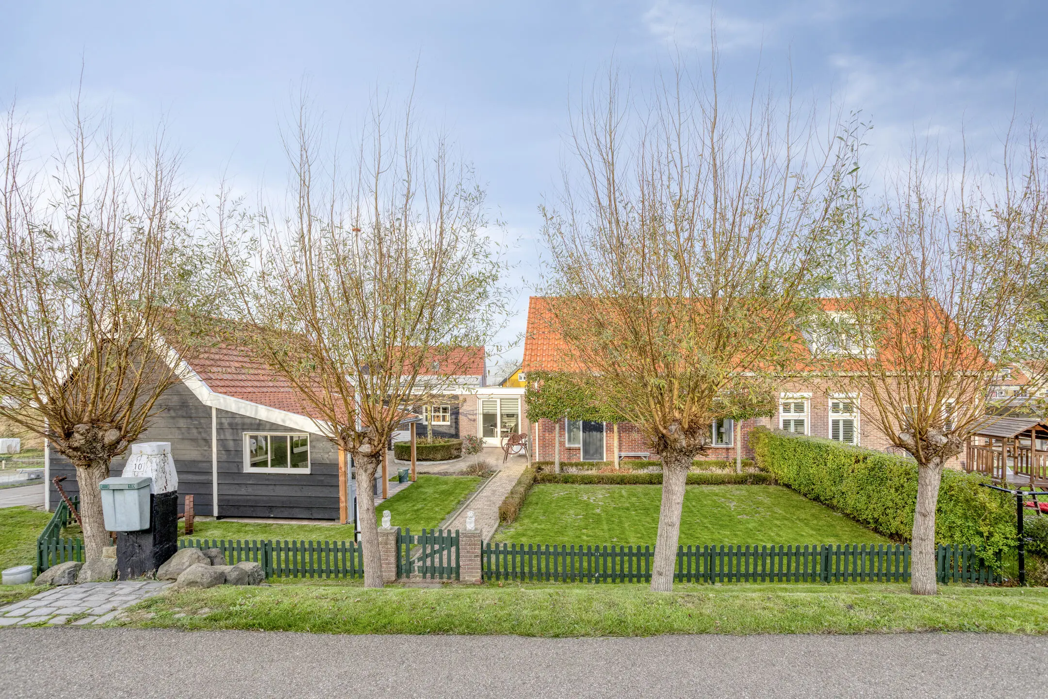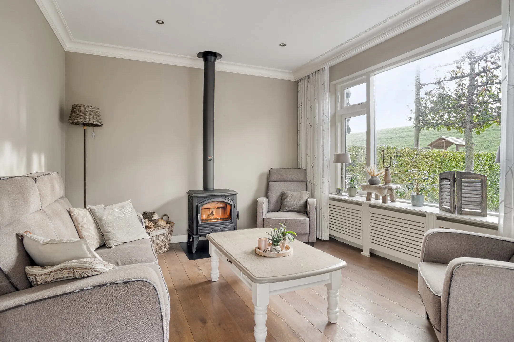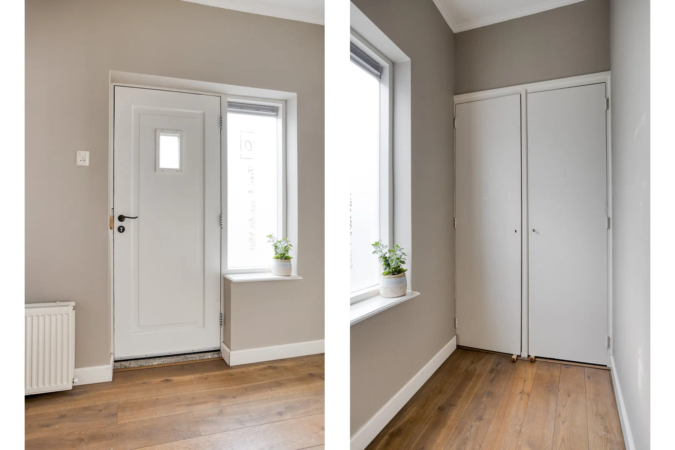 Dit is zo’n huis waar de voordeur er vooral voor de sier is — de meeste mensen komen hier gezellig achterom binnen en ploffen neer aan de keukentafel, zoals het hoort in de polder. Maar voor het gemak beginnen we onze rondleiding toch even bij de voordeur. Via de hal — met meterkast, handige vaste kast en de deur naar de woonkamer — kom je in een fijne leefruimte met eiken vloerdelen. De zithoek rond de open haard is een plek waar het dagelijks goed toeven is. Richting de keuken is volop ruimte voor een eettafel; dankzij de markiezen blijft het er in de zomer heerlijk koel en sfeervol.
