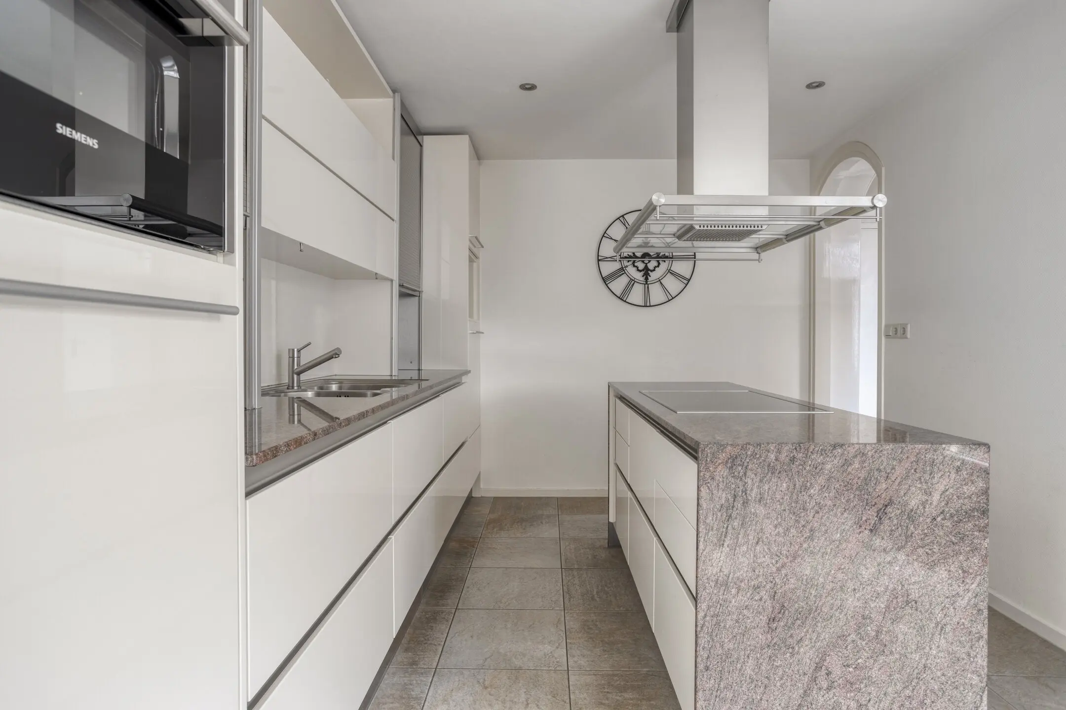 Door de boogdoorgang stap je de gezellige leefkeuken binnen. Deze werd in 2015 vernieuwd en is van alle gemakken voorzien. Het royale kookeiland biedt volop opbergruimte en een 4-pits inductiekookplaat met afzuigkap. In de achterwand vind je niet alleen de koelkast, vriezer en combi-magnetron, maar ook veel extra kastruimte — ideaal voor al je keukenspullen. De plavuizen vloer met vloerverwarming maakt het er extra comfortabel. En met de grote kunststof schuifpui open, loopt binnen naadloos over in buiten.