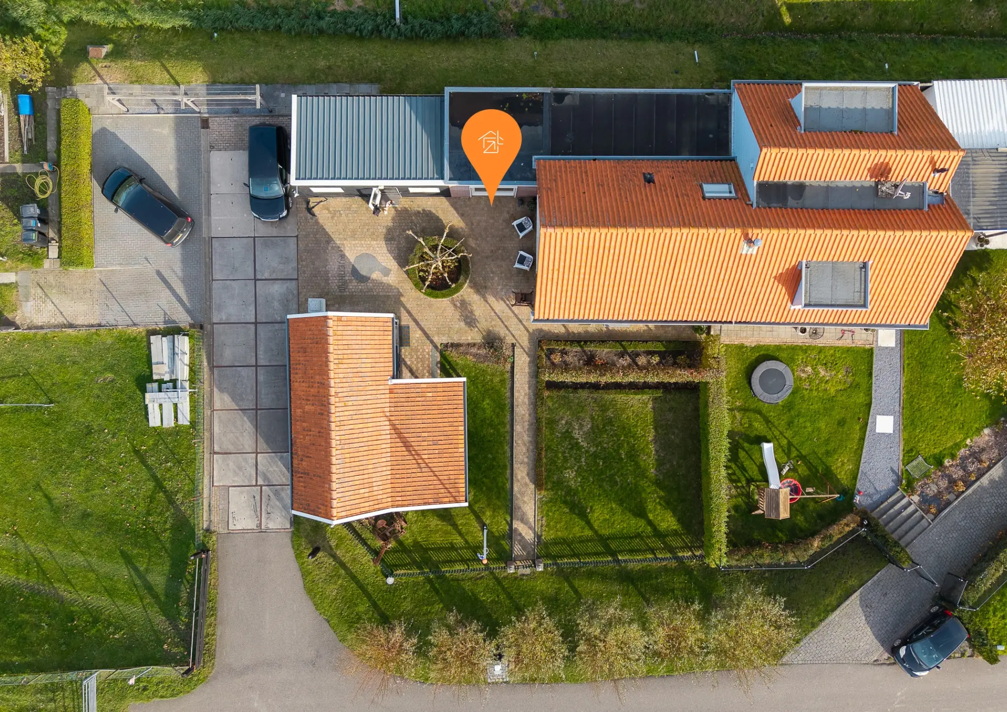 De tuin zit vol karakter — elk hoekje heeft wel iets eigens. Van het hekwerk tot de mooie bestrating en de stijlvolle afwerking van de schuur: overal zie je dat hier met liefde aan is gewerkt. Het is een heerlijke plek om te ontspannen en te genieten van het buitenleven. Dankzij de combinatie van beplanting, een gazon en meerdere terrassen is er altijd wel een fijn plekje in de zon of juist in de schaduw te vinden. Aan de schuur is een overkapping geplaatst: een beschutte plek waar je, uit de wind, lekker kunt zitten met een kop koffie of een goed boek.