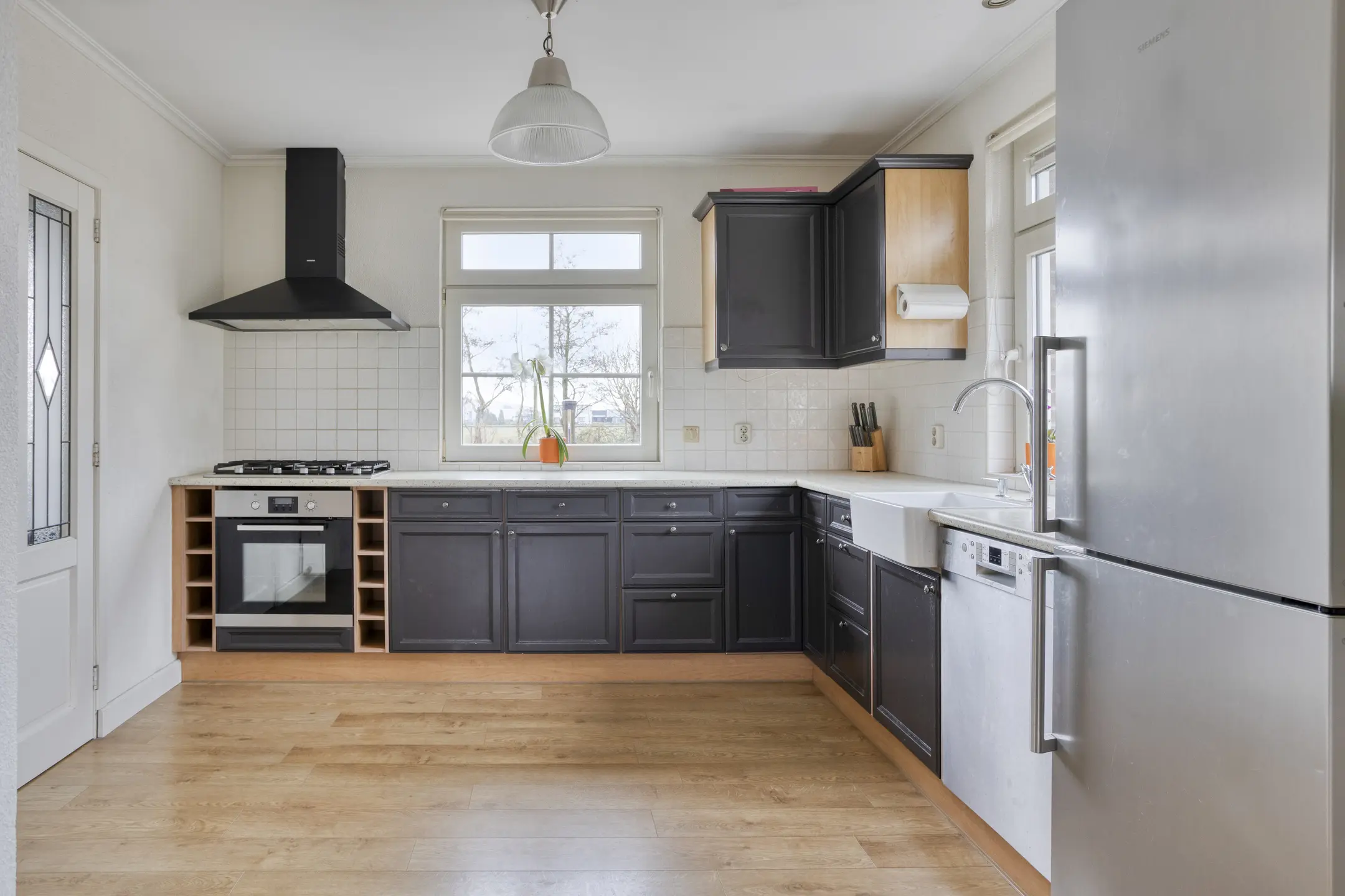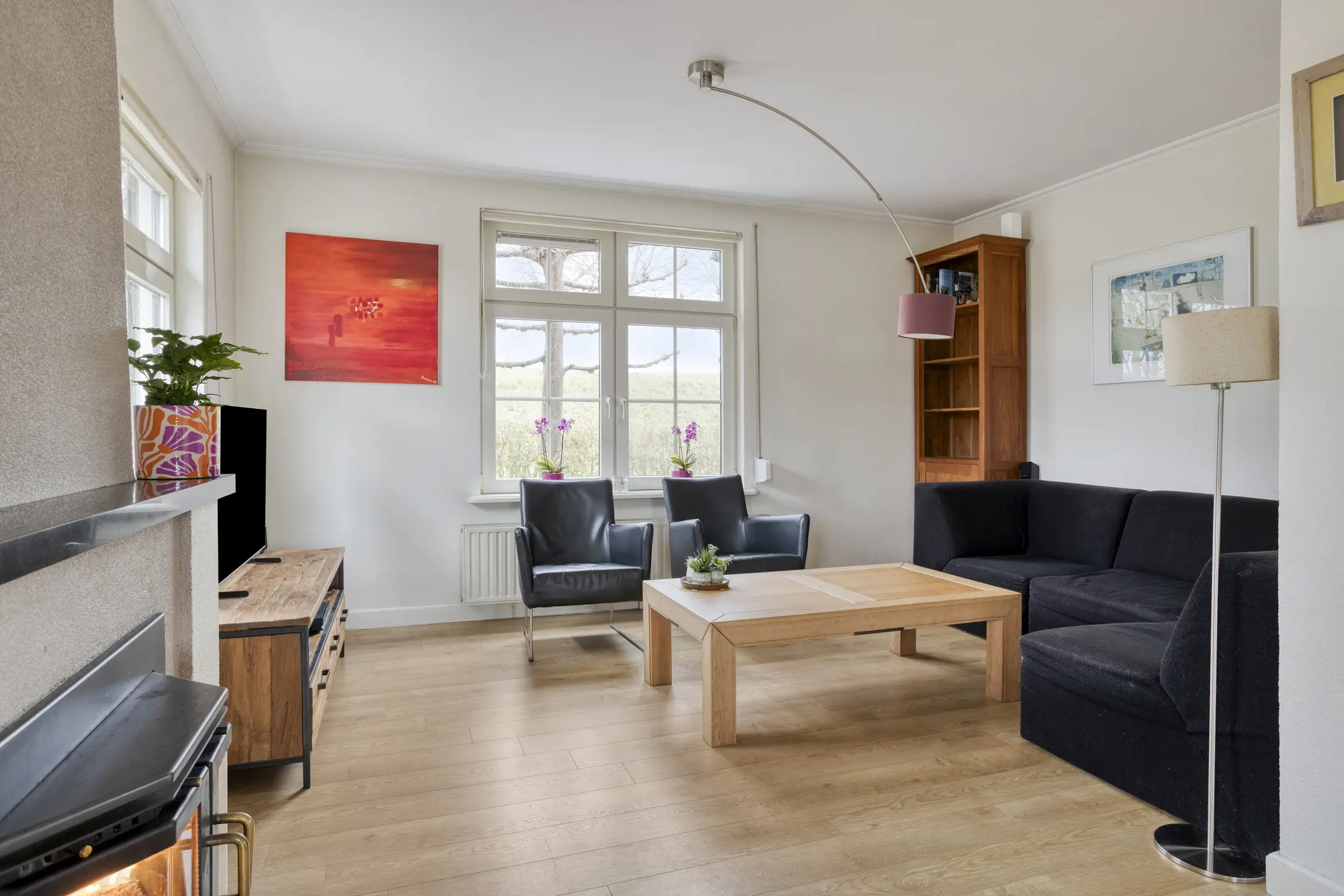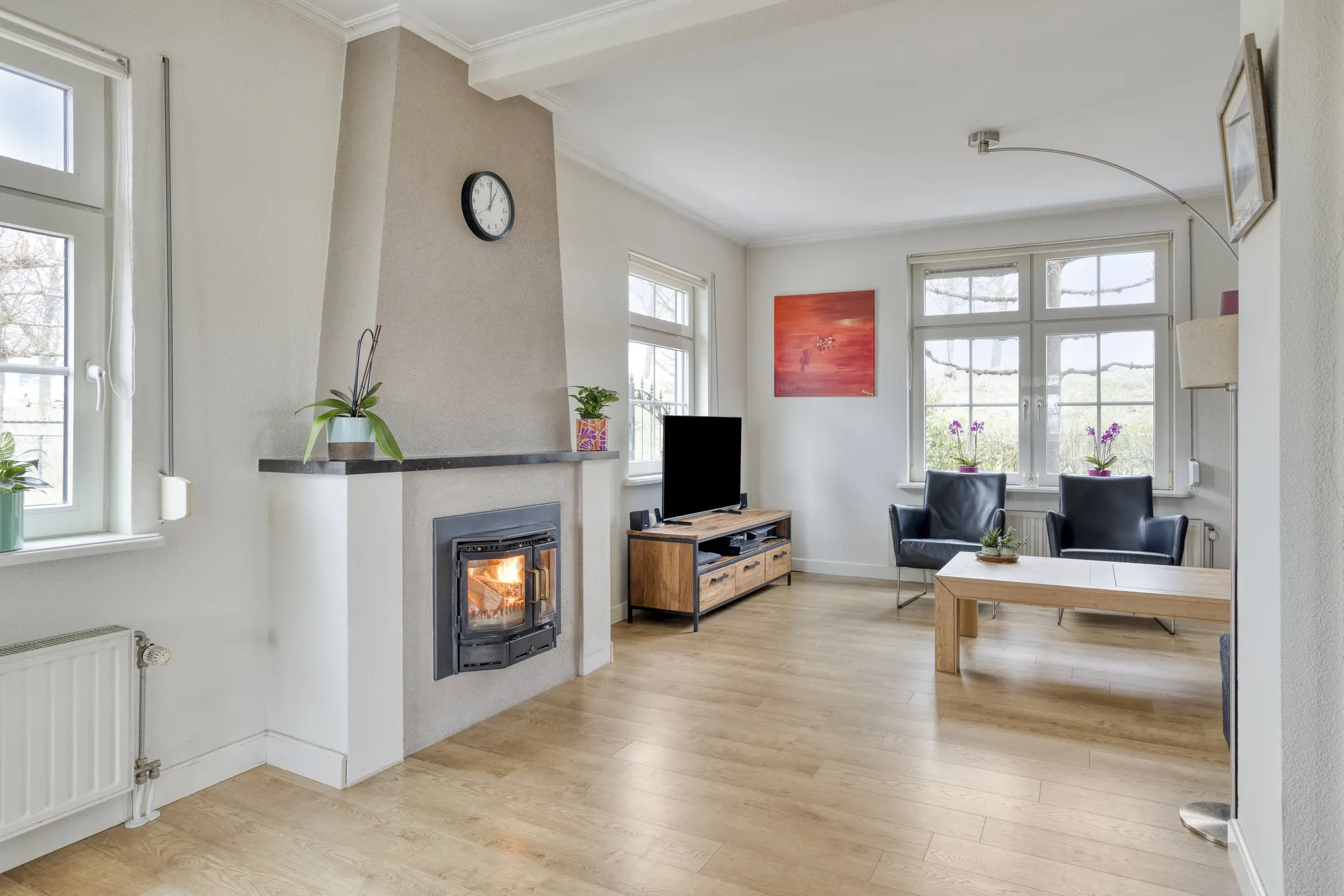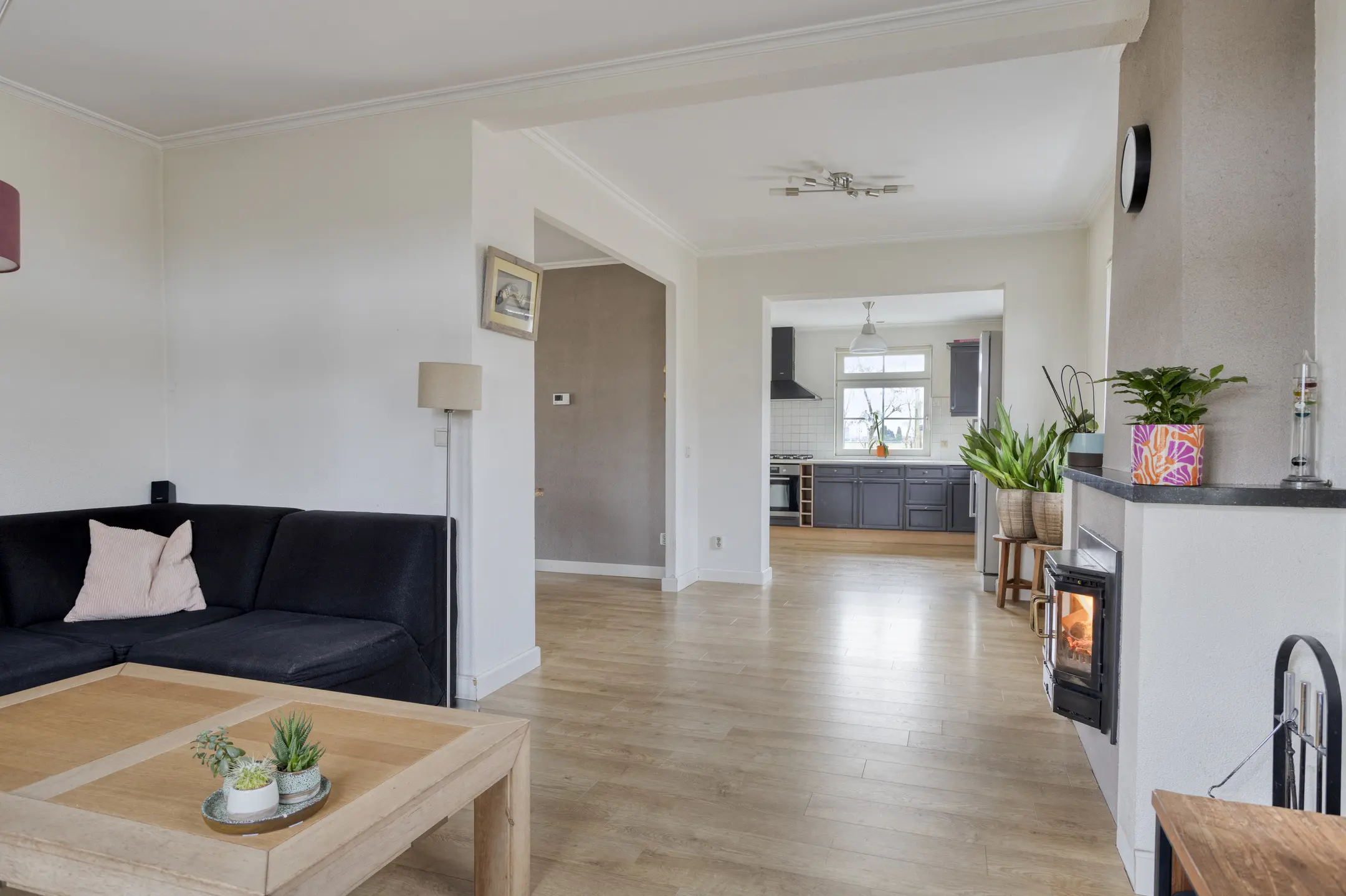 De ruime living is een fijne plek om te ontspannen en kenmerkt zich door veel daglicht en een sfeervolle schouw met houtkachel. Achter de keuken bevindt zich een praktische gang met toegang tot de achterdeur, het toilet en de stookruimte met wasmachineaansluiting. Tevens is hier de nette en royale badkamer gesitueerd, voorzien van een ligbad, douche en wastafelmeubel.