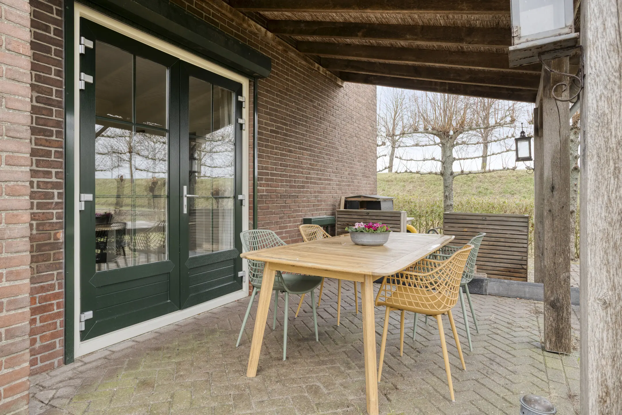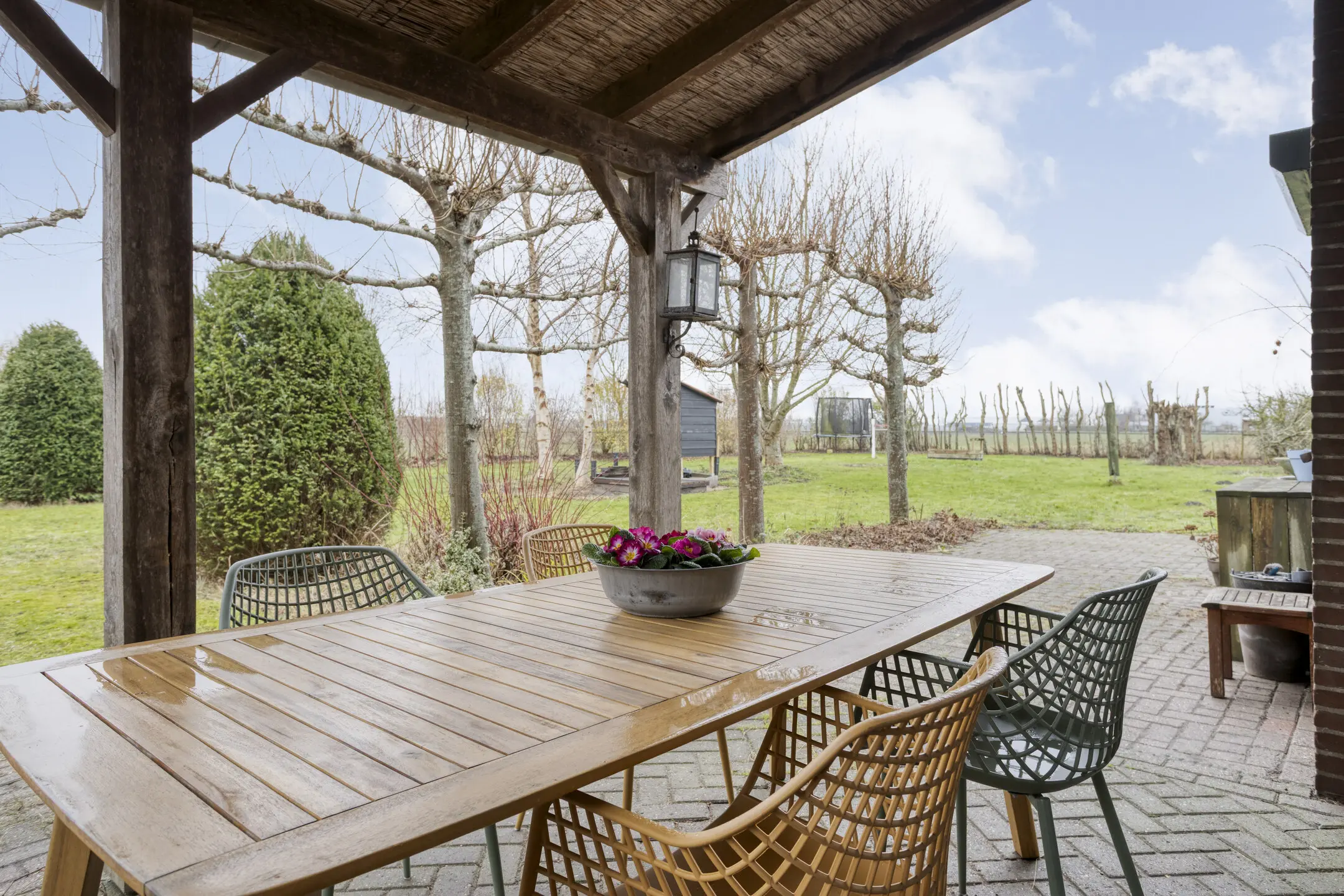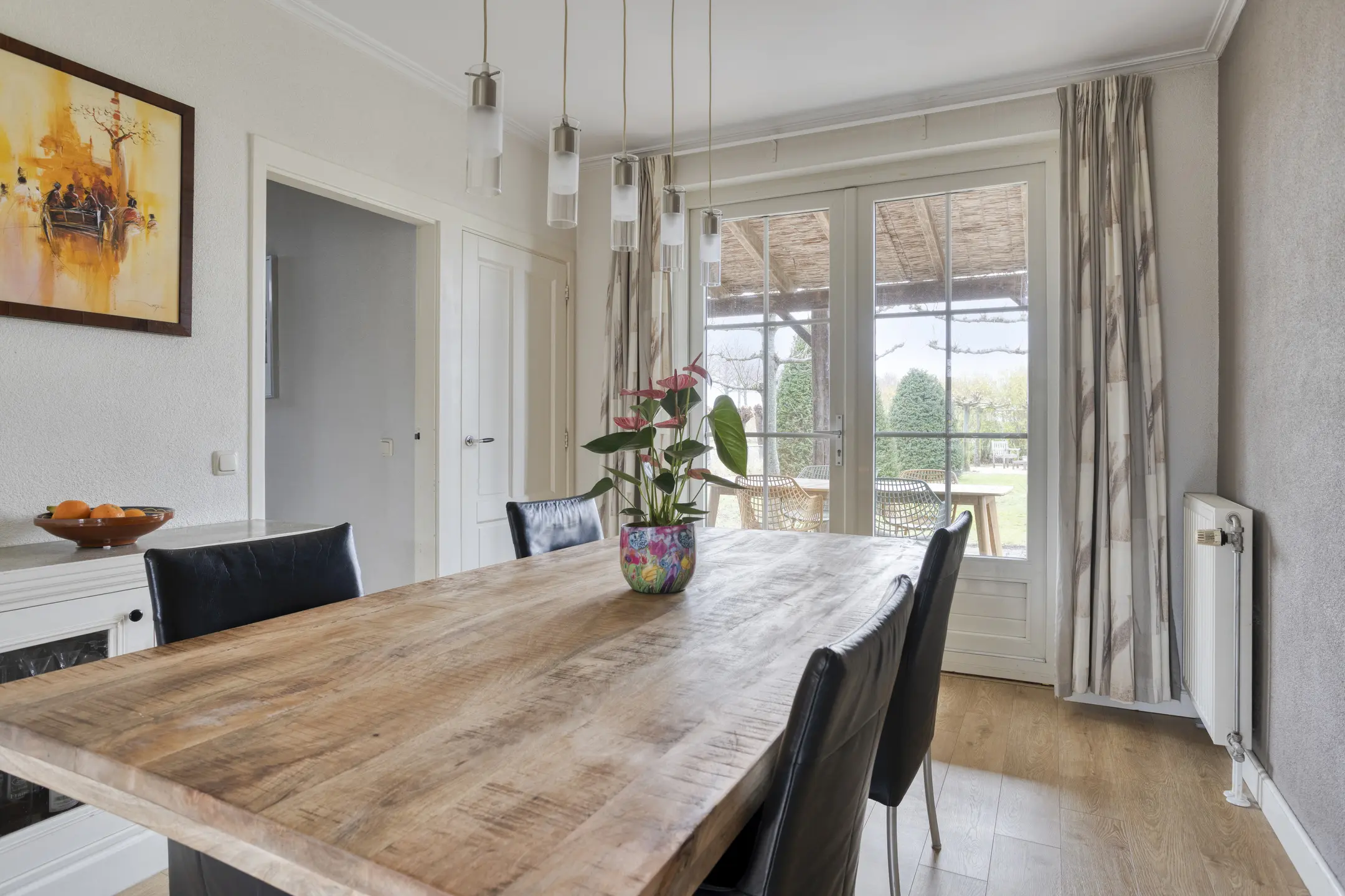 Vanuit de eetkamer is er toegang tot een ruime overkapping aan de zijkant van de woning: een heerlijke plek om beschut buiten te zitten. Via de achterdeur bereik je de achtertuin met een royaal terras en de oprit, waar zich tevens de laadpaal bevindt.