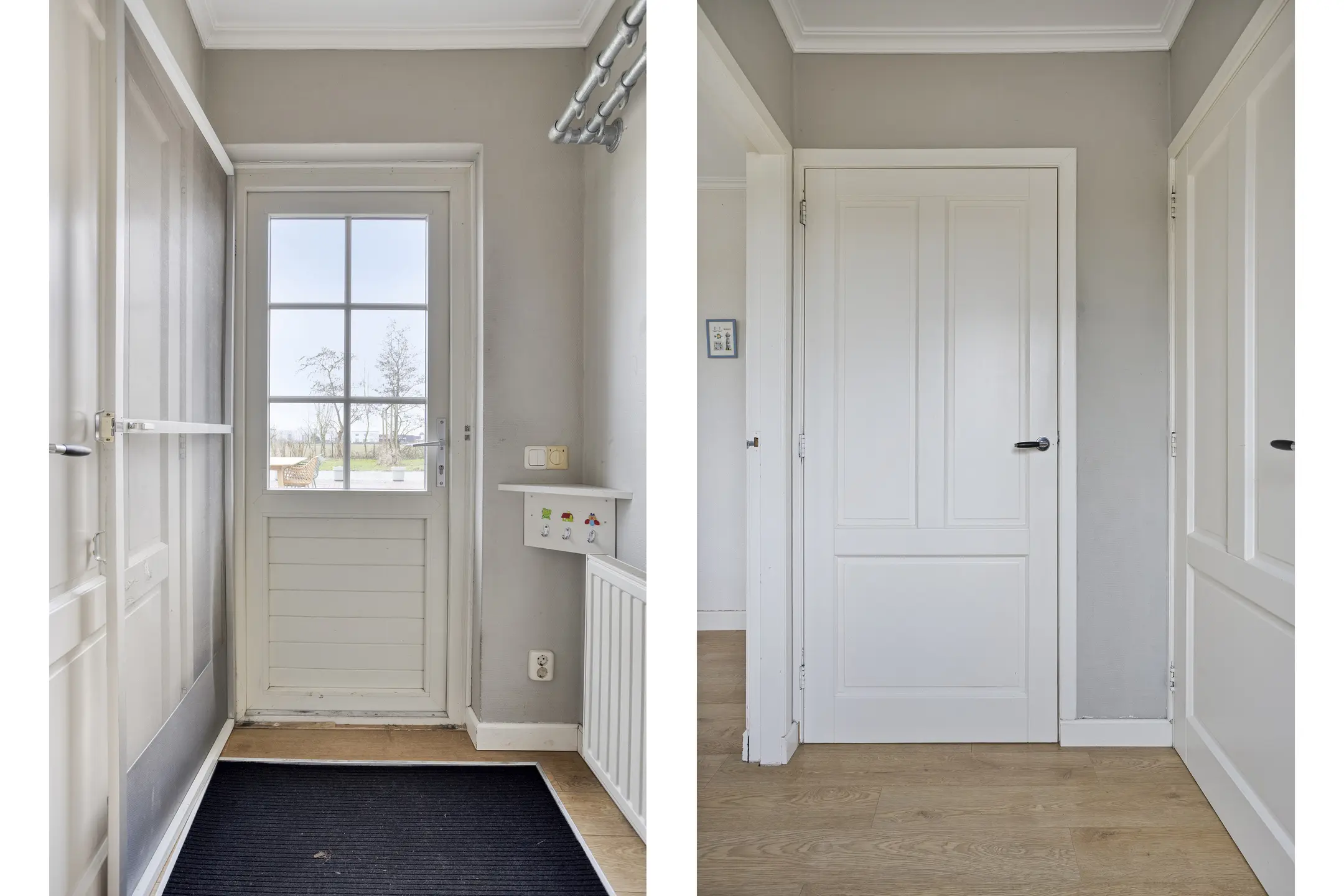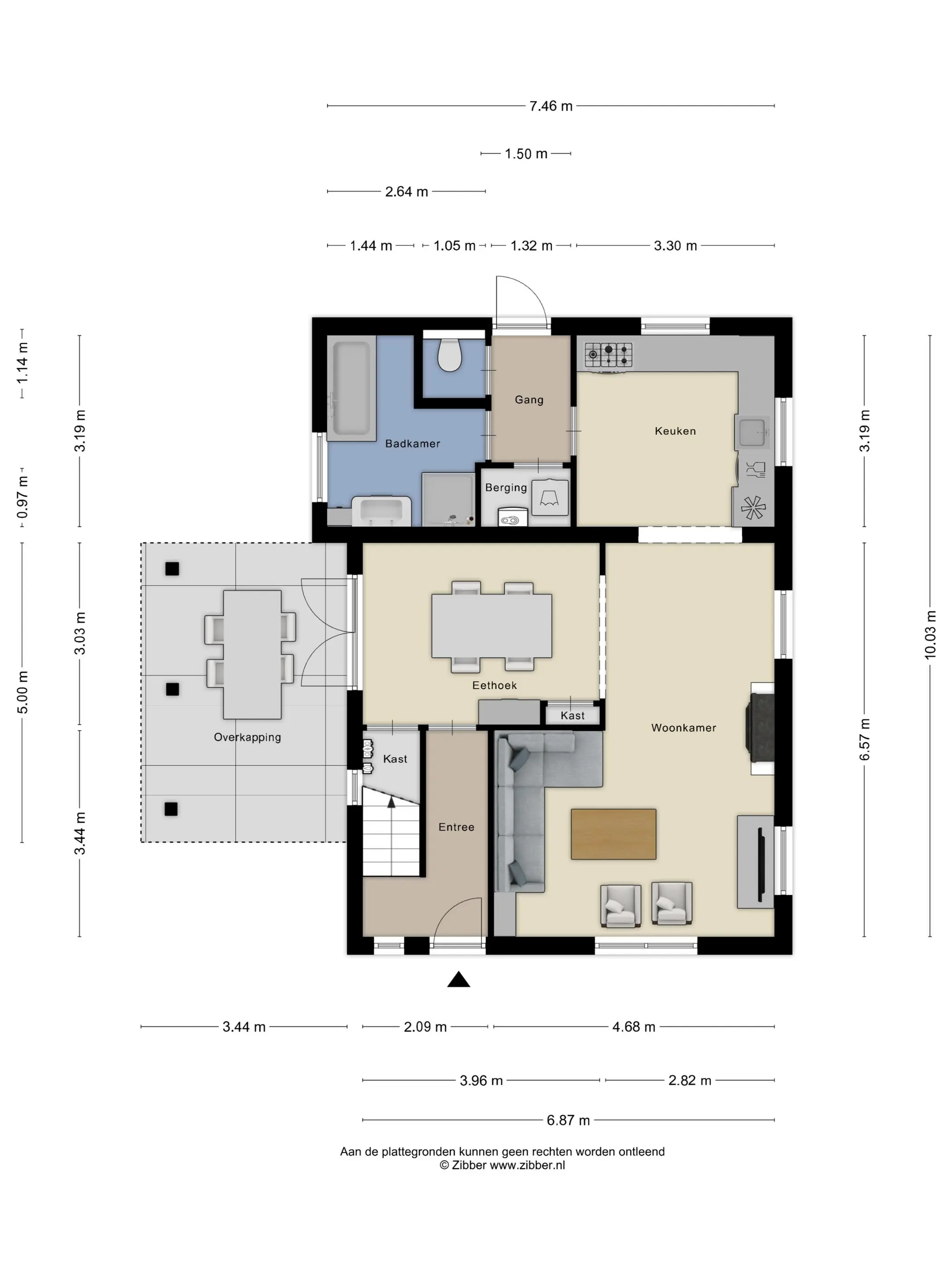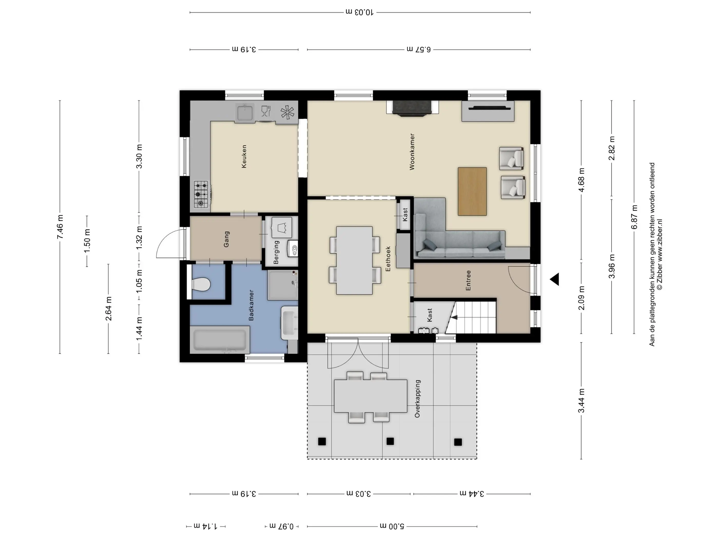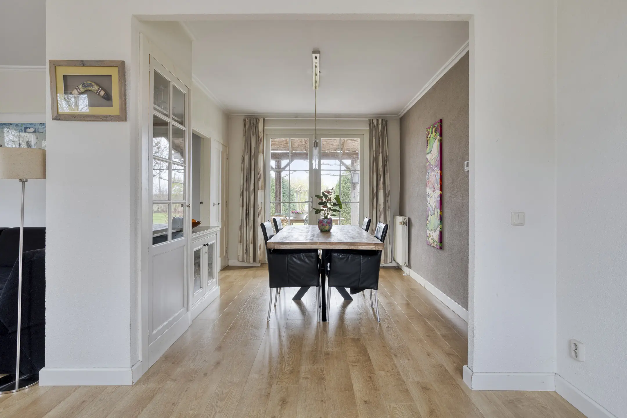 Vanuit de eetkamer is er toegang tot een ruime overkapping aan de zijkant van de woning: een heerlijke plek om beschut buiten te zitten. Via de achterdeur bereik je de achtertuin met een royaal terras en de oprit, waar zich tevens de laadpaal bevindt.