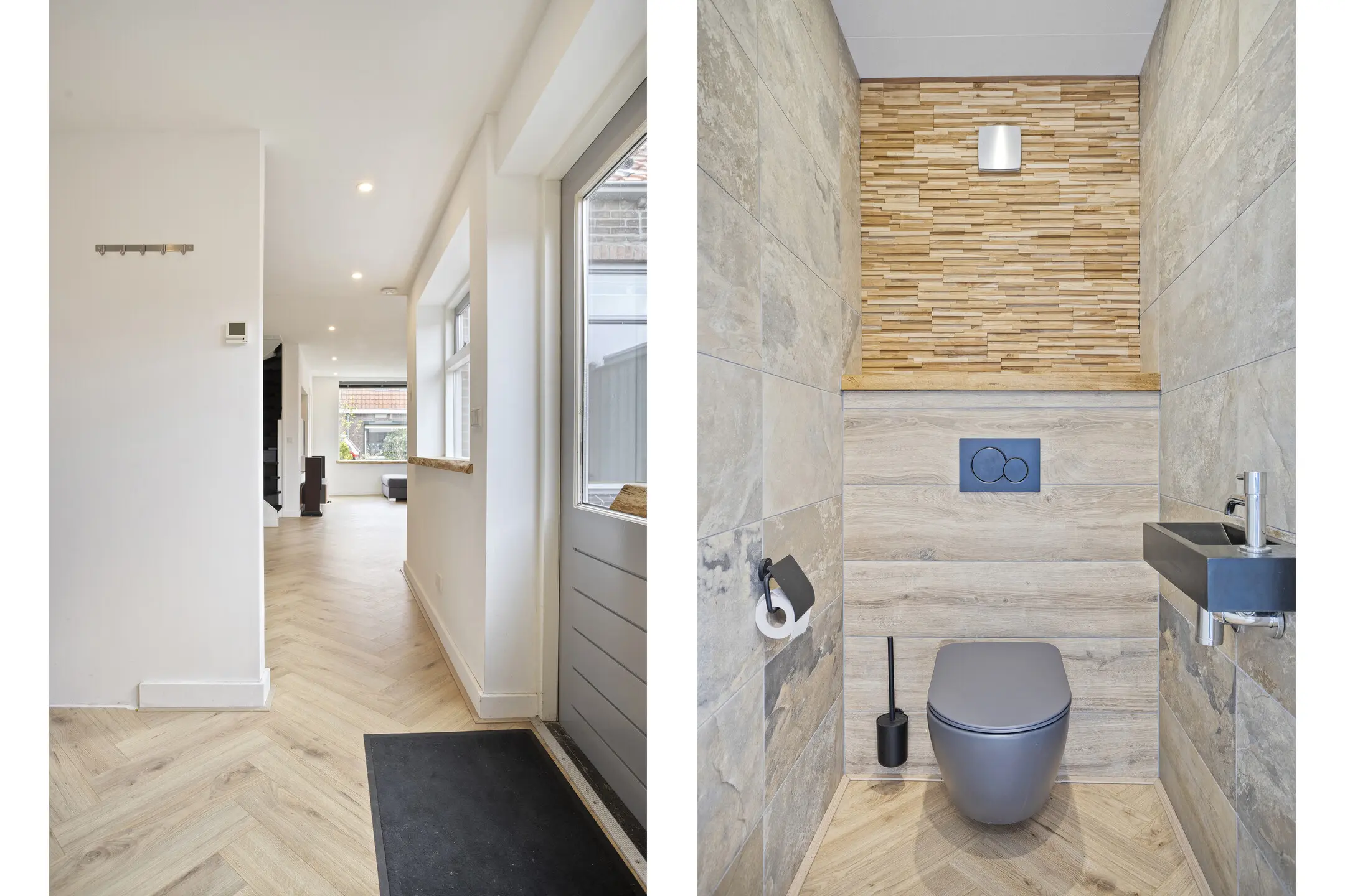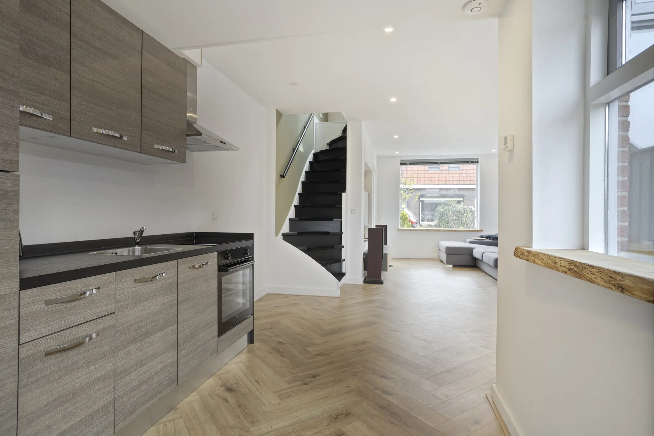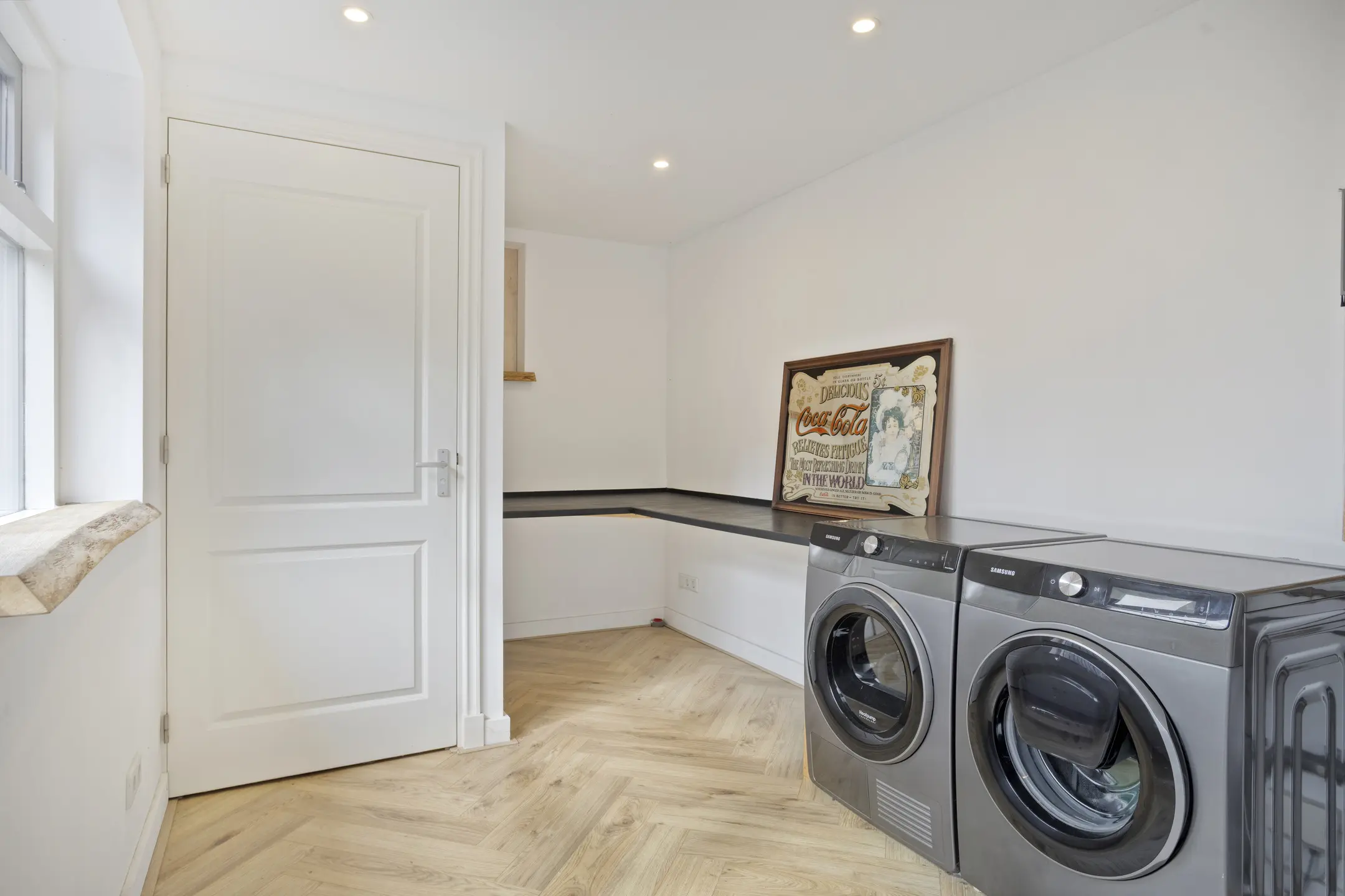 Aan de achterzijde bevindt zich de moderne open keuken (2021), uitgerust met diverse inbouwapparatuur en een eigentijdse uitstraling. Aansluitend vind je de praktische bijkeuken, met aansluitingen voor witgoed, ruimte voor een thuiswerkplek of kantoor en een boiler (50 liter) voor warm water. Vanuit hier heb je direct toegang tot de tuin. Het toilet is voorzien van natuurlijke ventilatie.