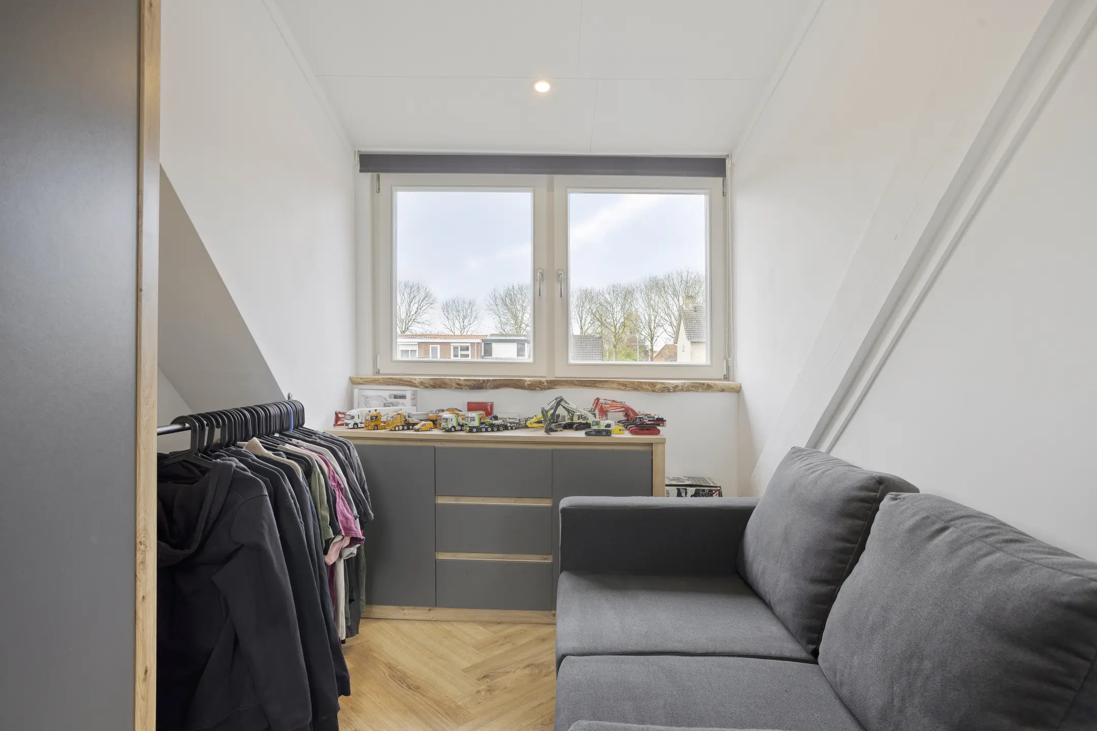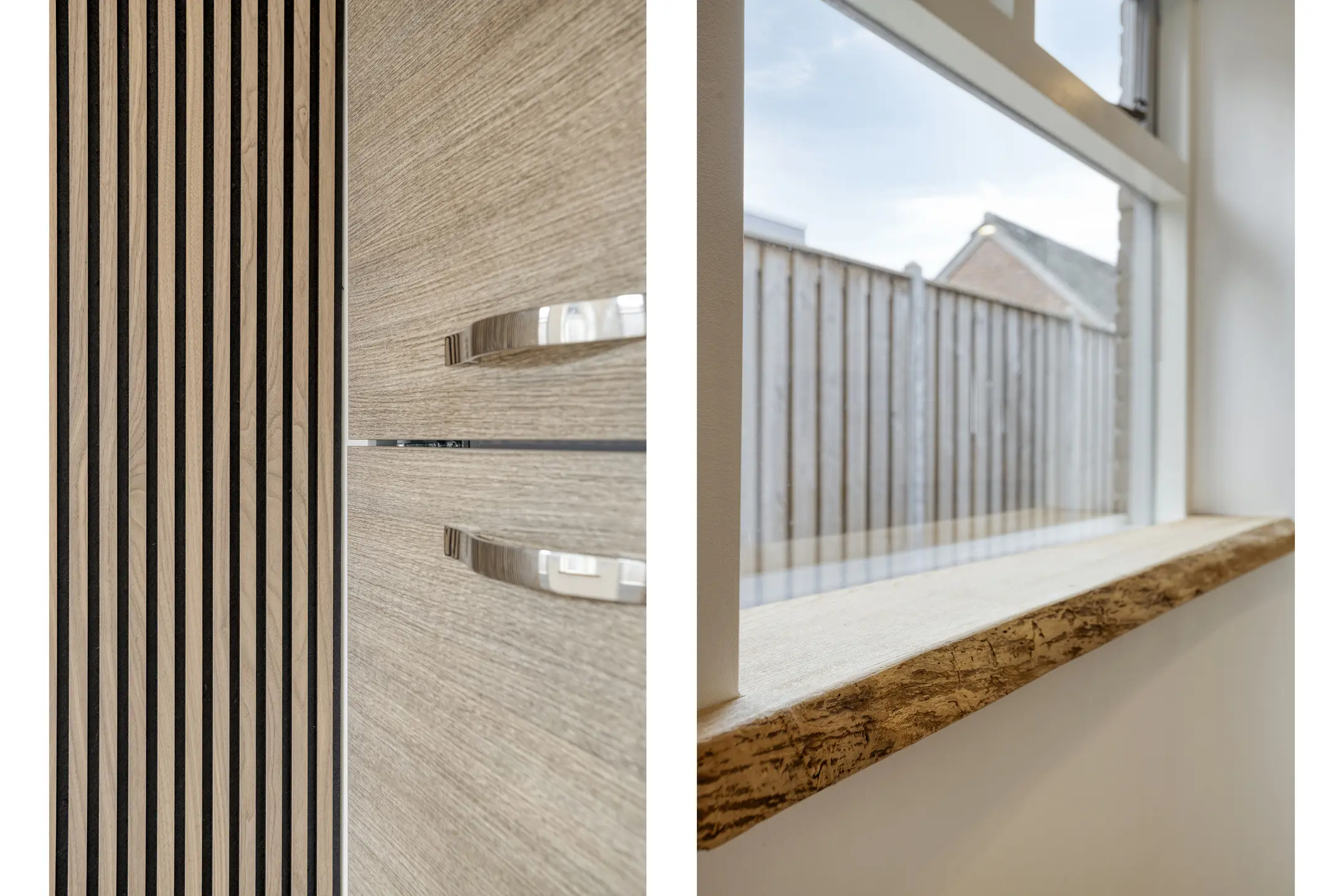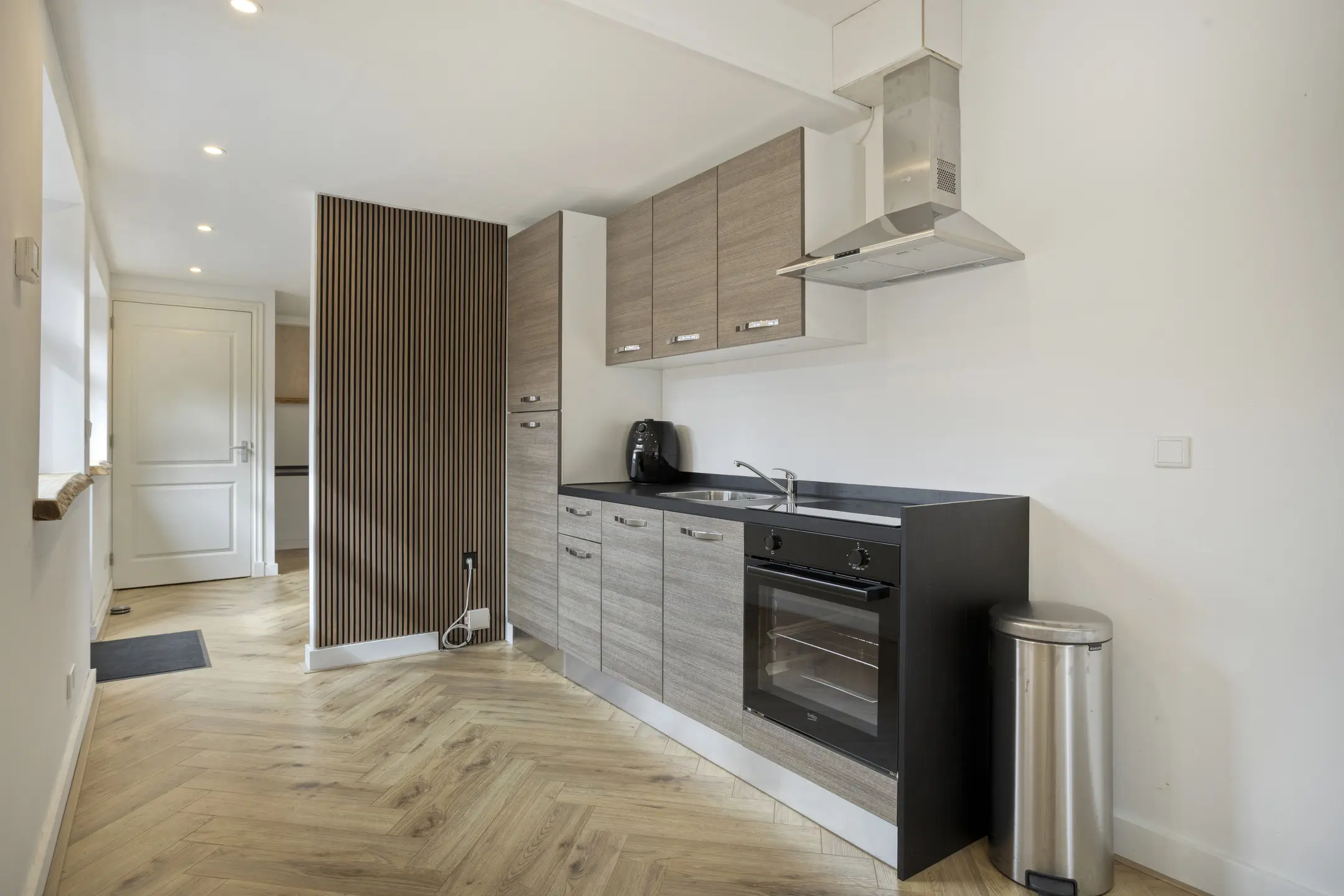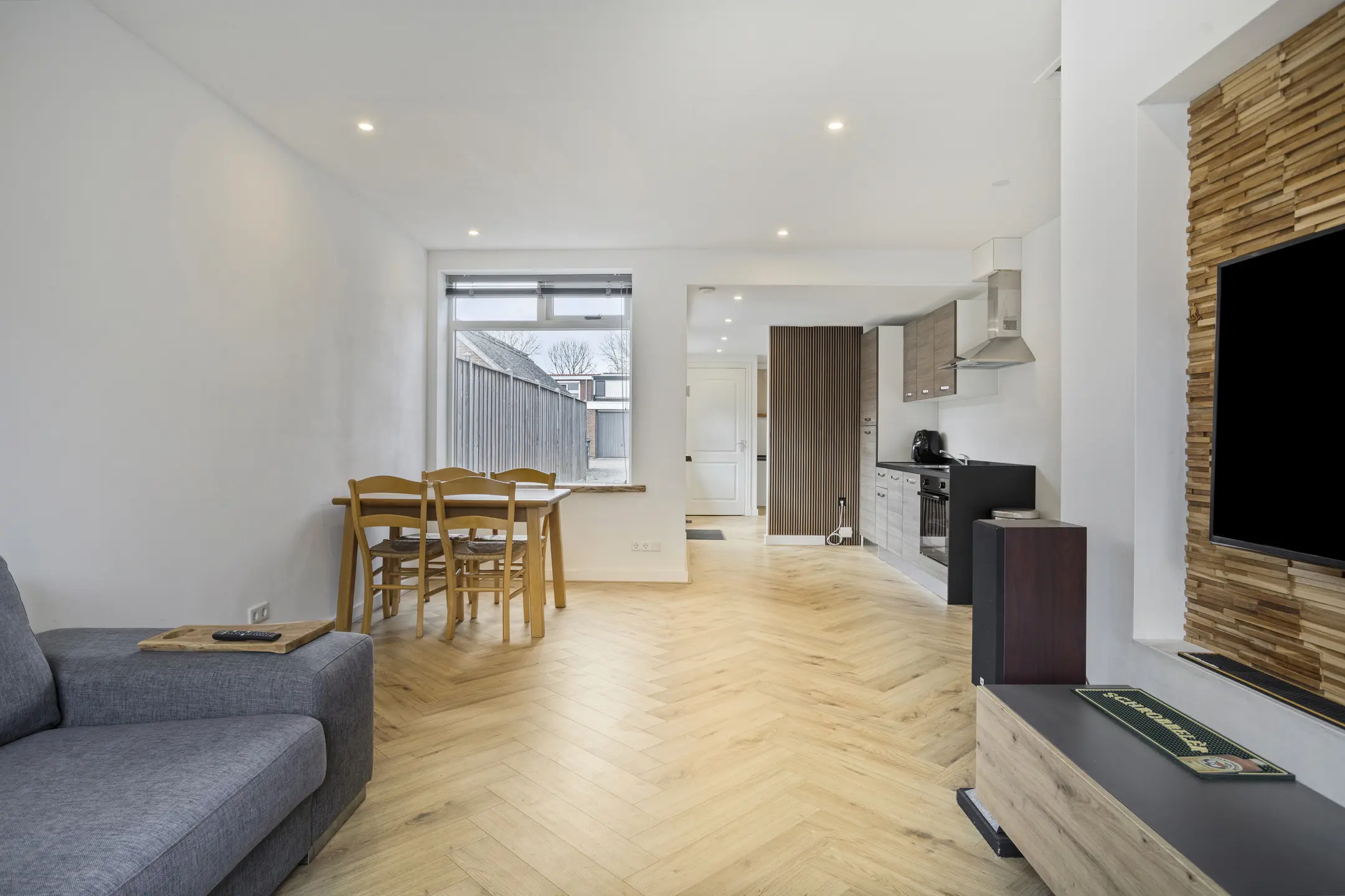 Aan de achterzijde bevindt zich de moderne open keuken (2021), uitgerust met diverse inbouwapparatuur en een eigentijdse uitstraling. Aansluitend vind je de praktische bijkeuken, met aansluitingen voor witgoed, ruimte voor een thuiswerkplek of kantoor en een boiler (50 liter) voor warm water. Vanuit hier heb je direct toegang tot de tuin. Het toilet is voorzien van natuurlijke ventilatie.