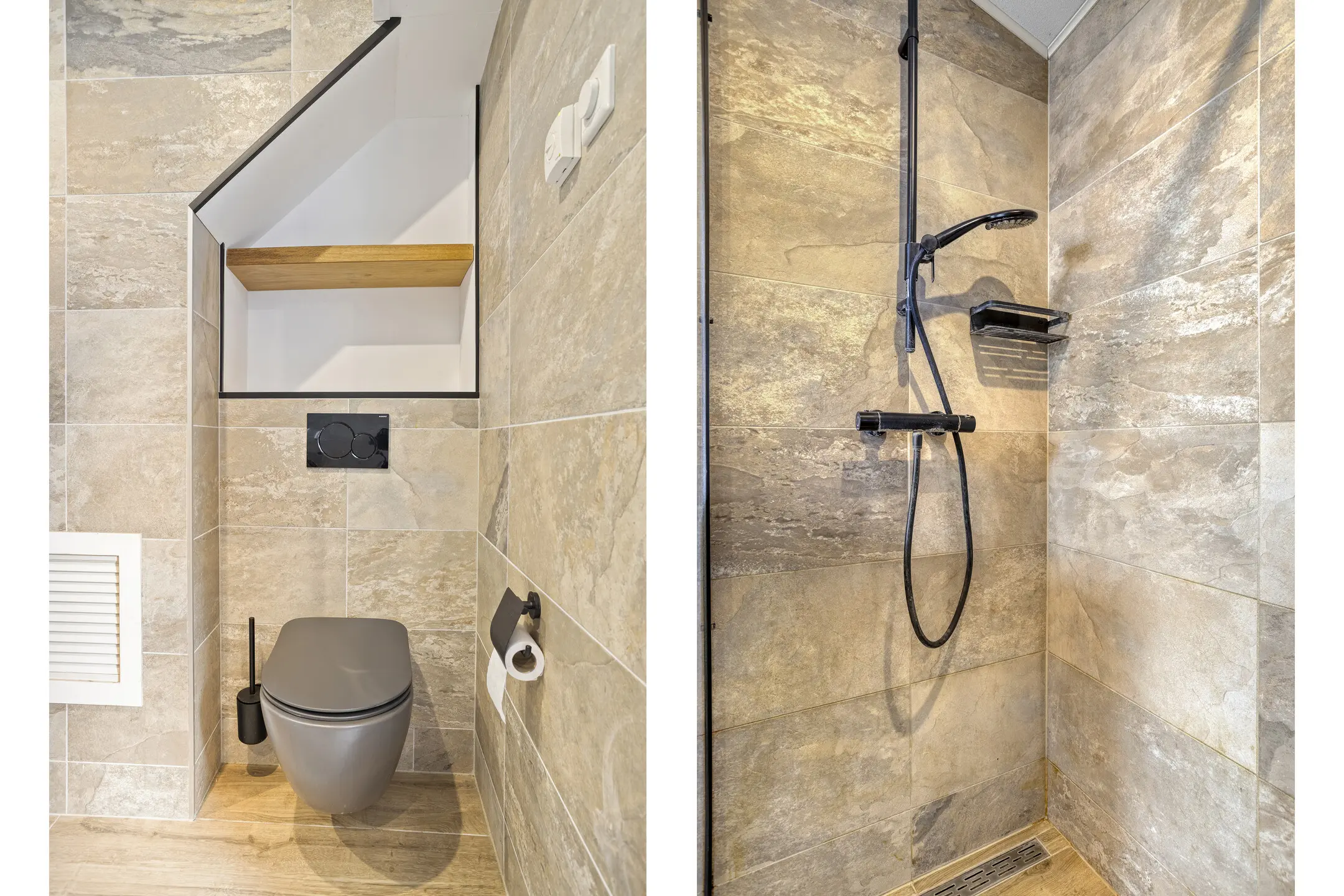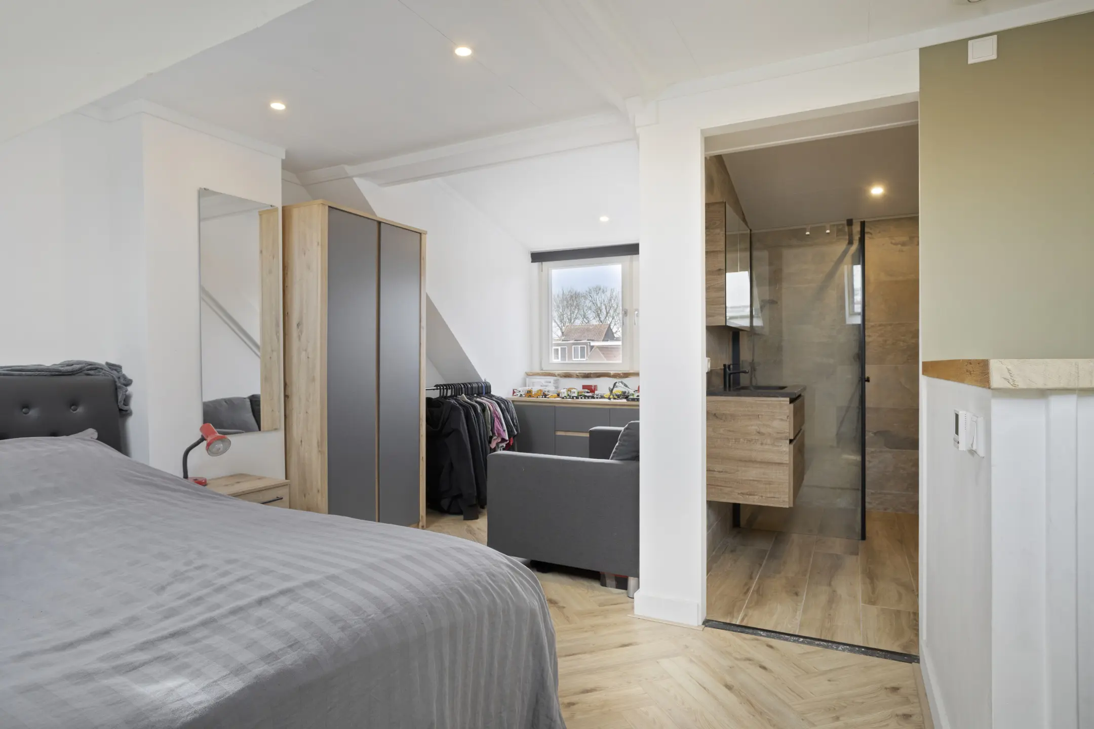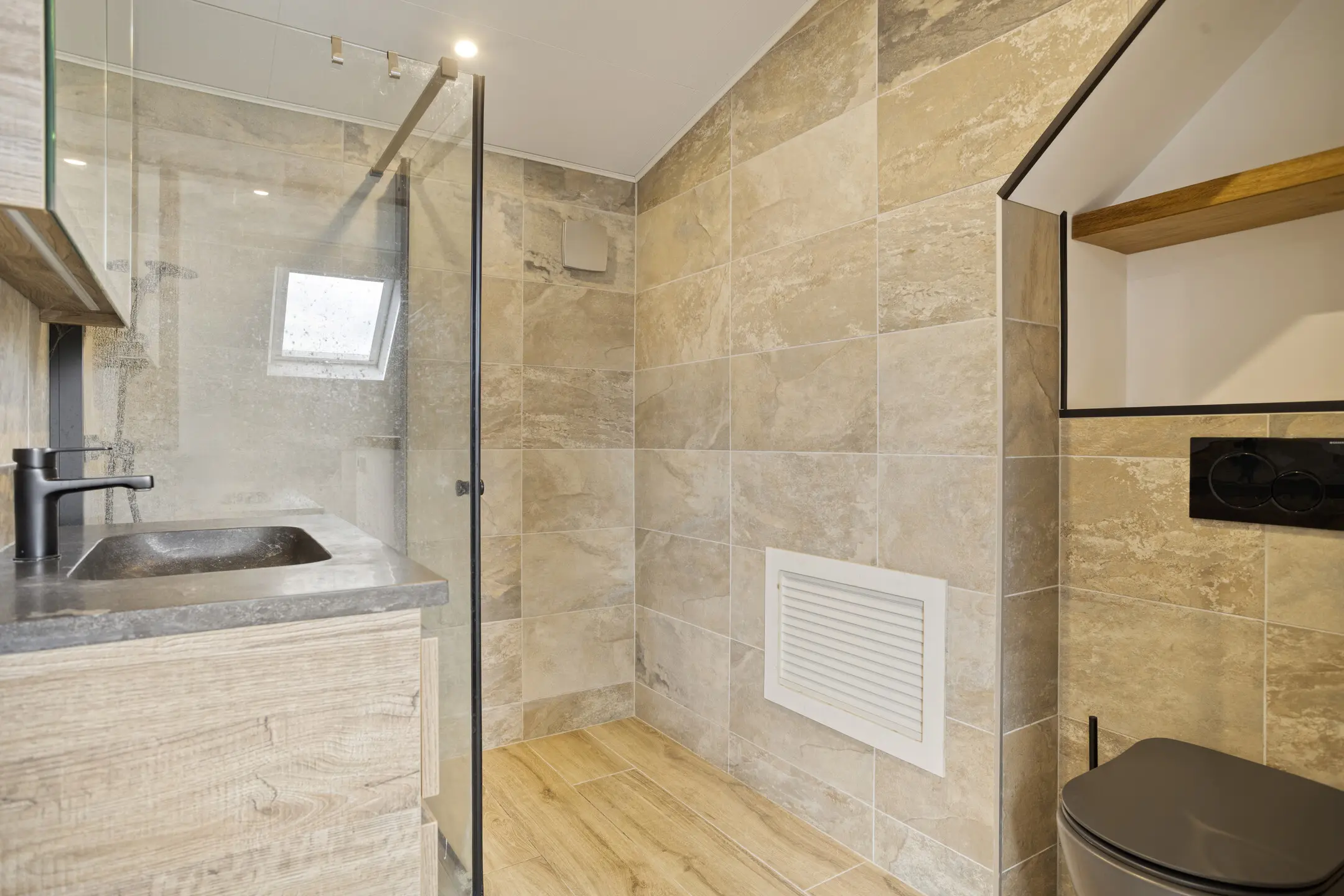 De eerste verdieping is volledig voorzien van vloerverwarming en biedt een ruime slaapkamer met zowel dakramen als een dakkapel, wat zorgt voor extra ruimte en lichtinval. De moderne badkamer (2020) is compleet uitgevoerd met een douche, badmeubel en een toilet (sanibroyeur). Zowel de wanden als de vloer zijn betegeld en er is mechanische ventilatie aanwezig voor extra comfort.
