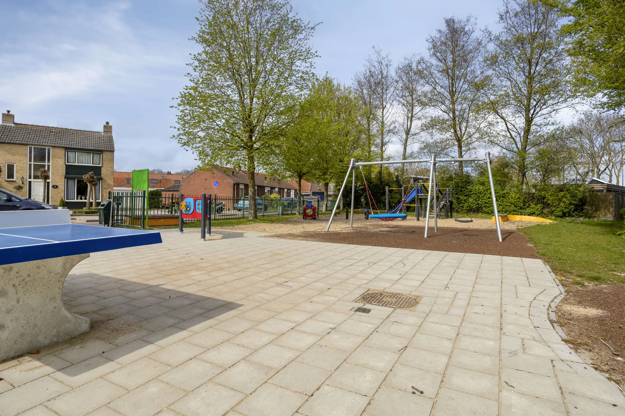 De onderhoudsvriendelijke achtertuin is netjes aangelegd met bestrating en borders. Hier geniet je van een ruime overkapping, ideaal voor lange zomeravonden. Daarnaast beschikt de tuin over een berging en een eigen parkeerplaats met ruimte voor circa twee auto’s.