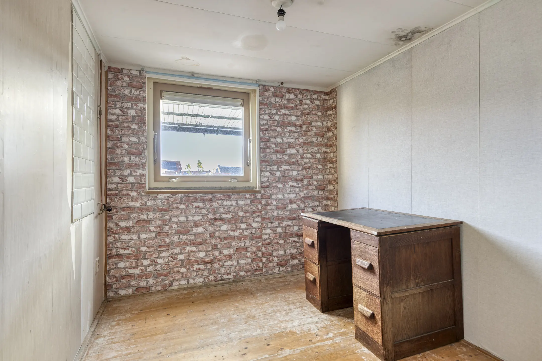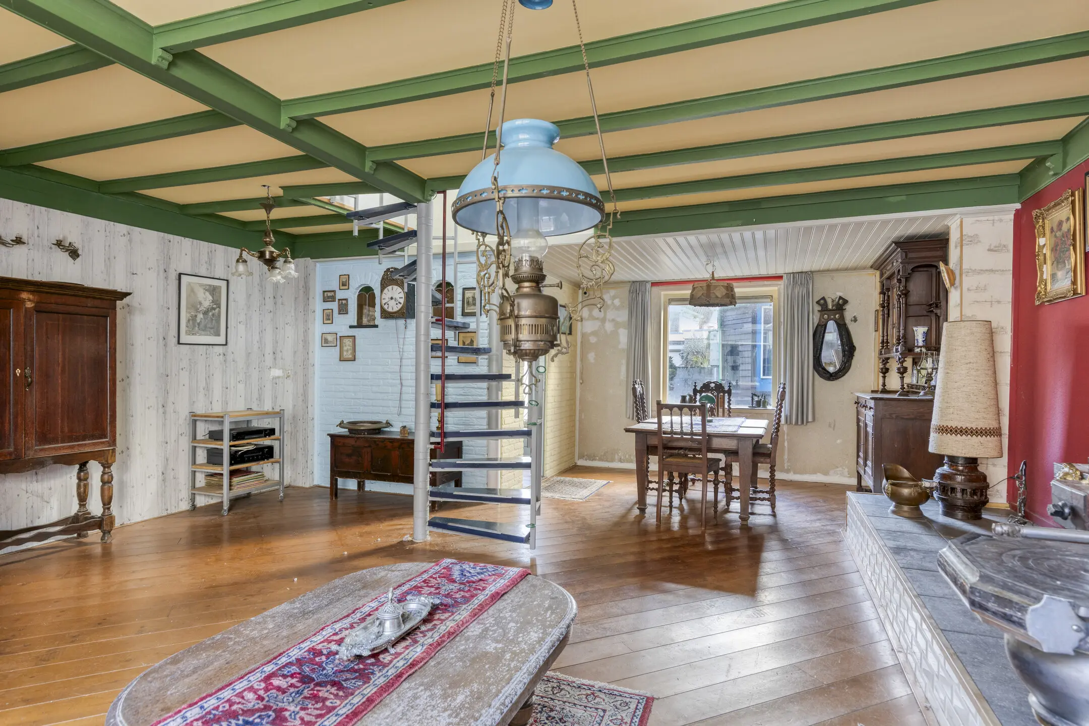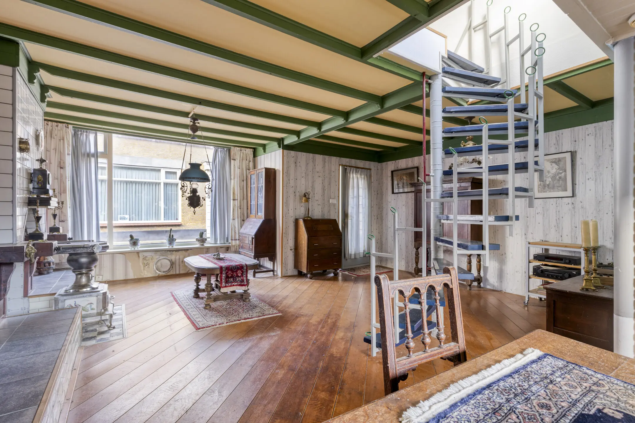 Via de stalen wenteltrap in de woonkamer bereik je de eerste verdieping. De overloop is verrassend ruim en licht en biedt toegang tot drie slaapkamers.