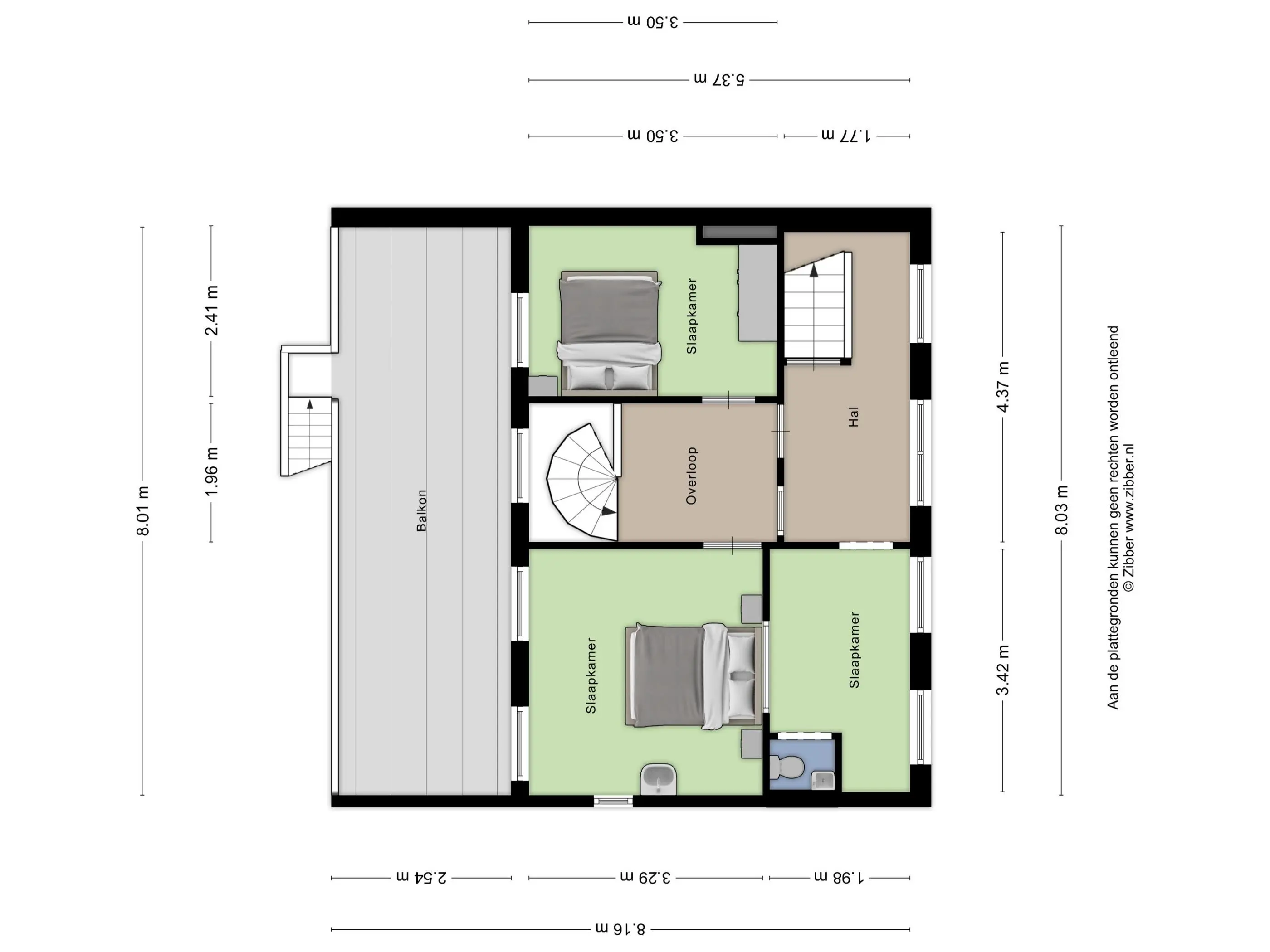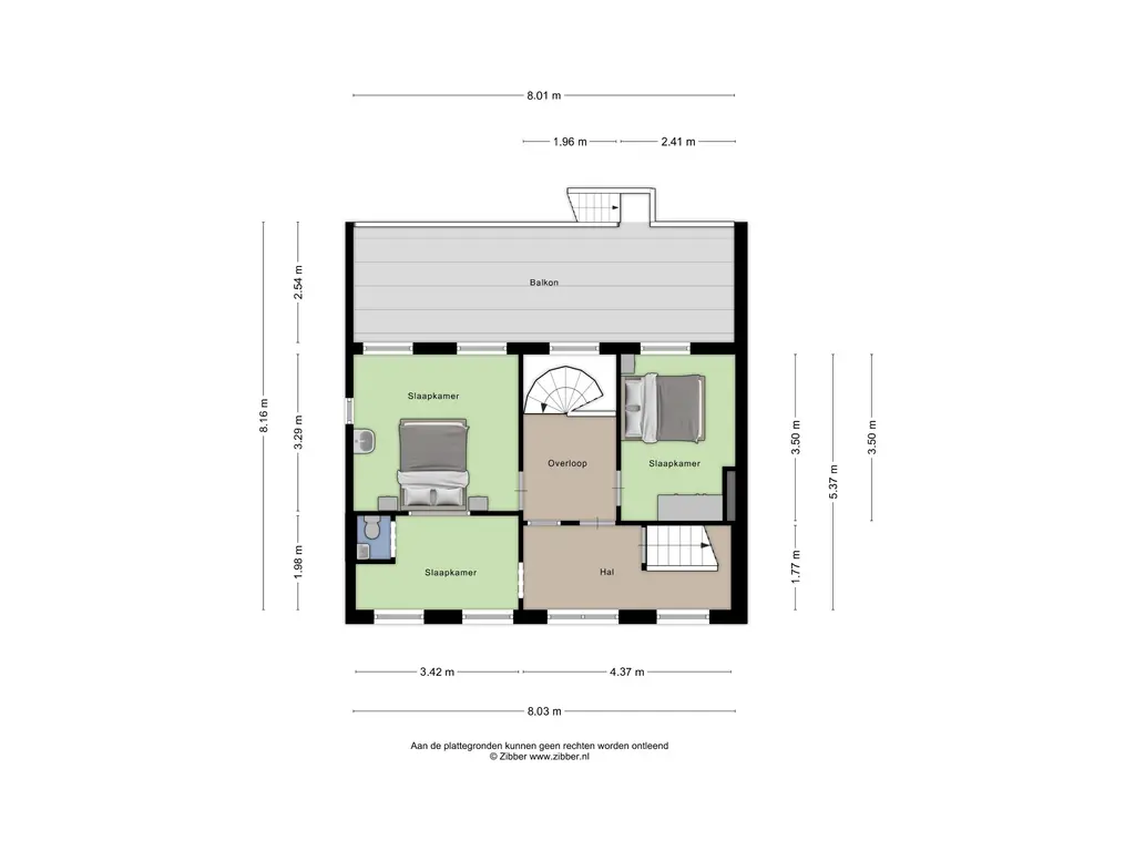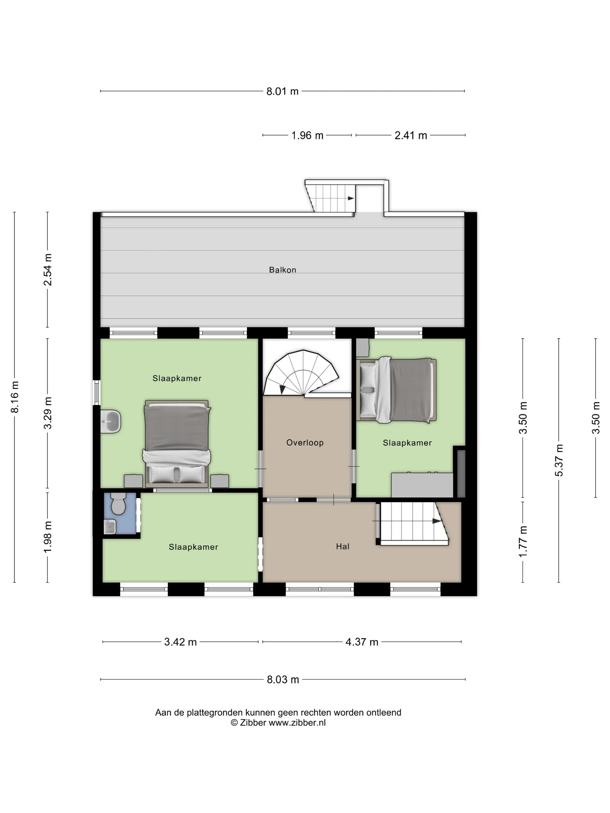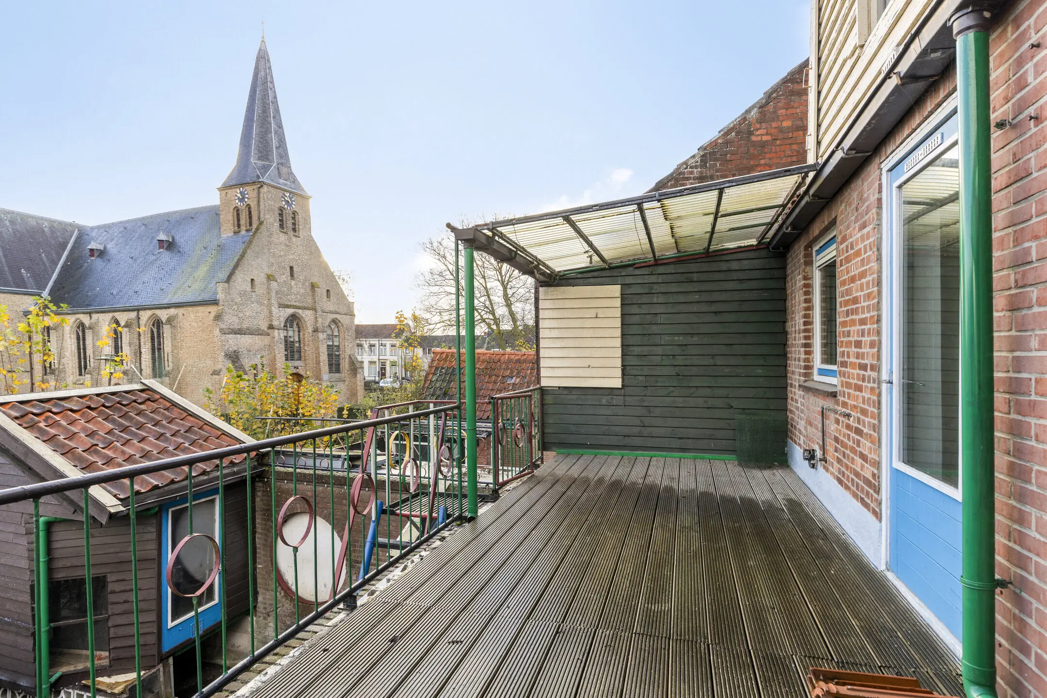 Via de stalen wenteltrap in de woonkamer bereik je de eerste verdieping. De overloop is verrassend ruim en licht en biedt toegang tot drie slaapkamers.
