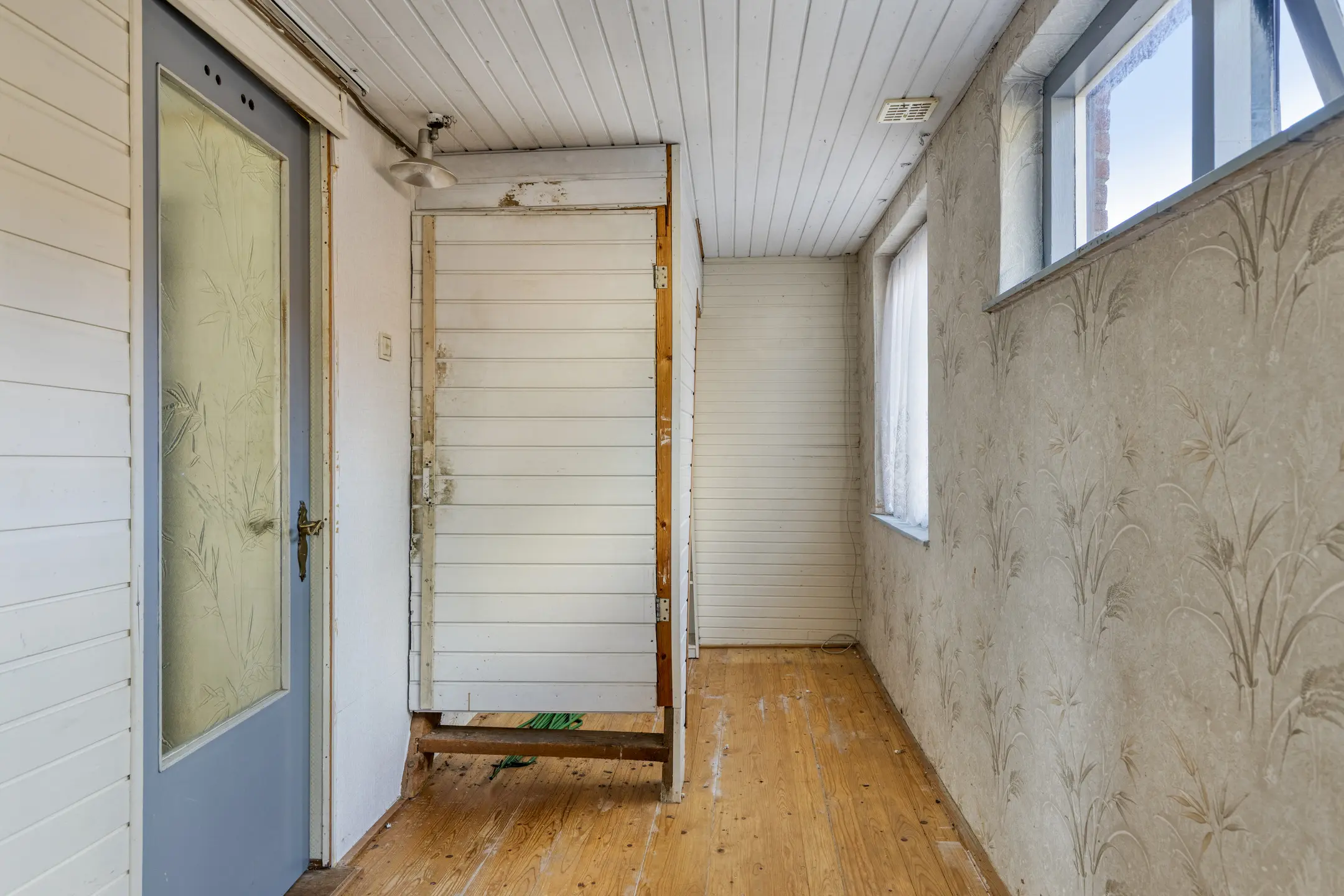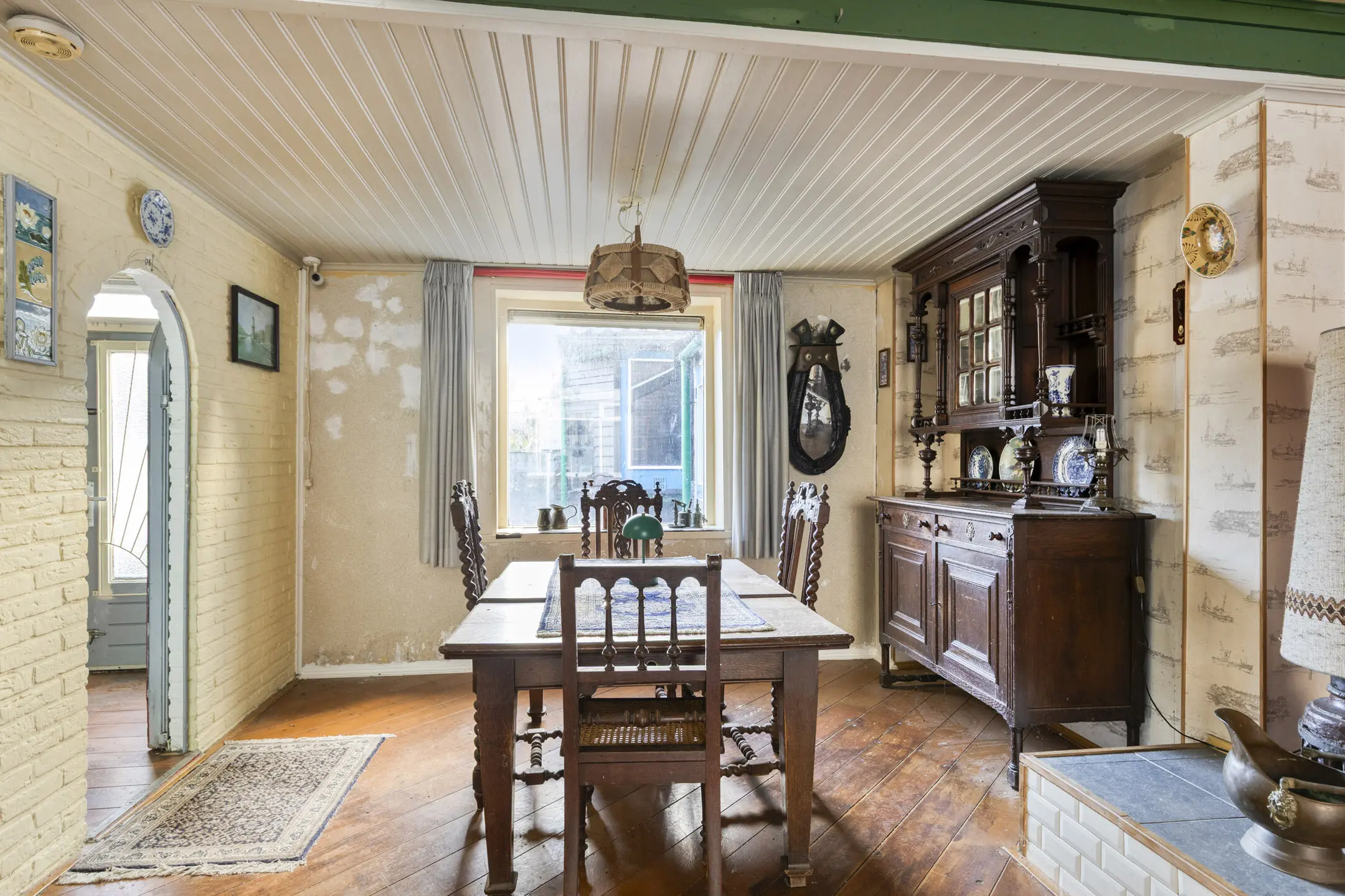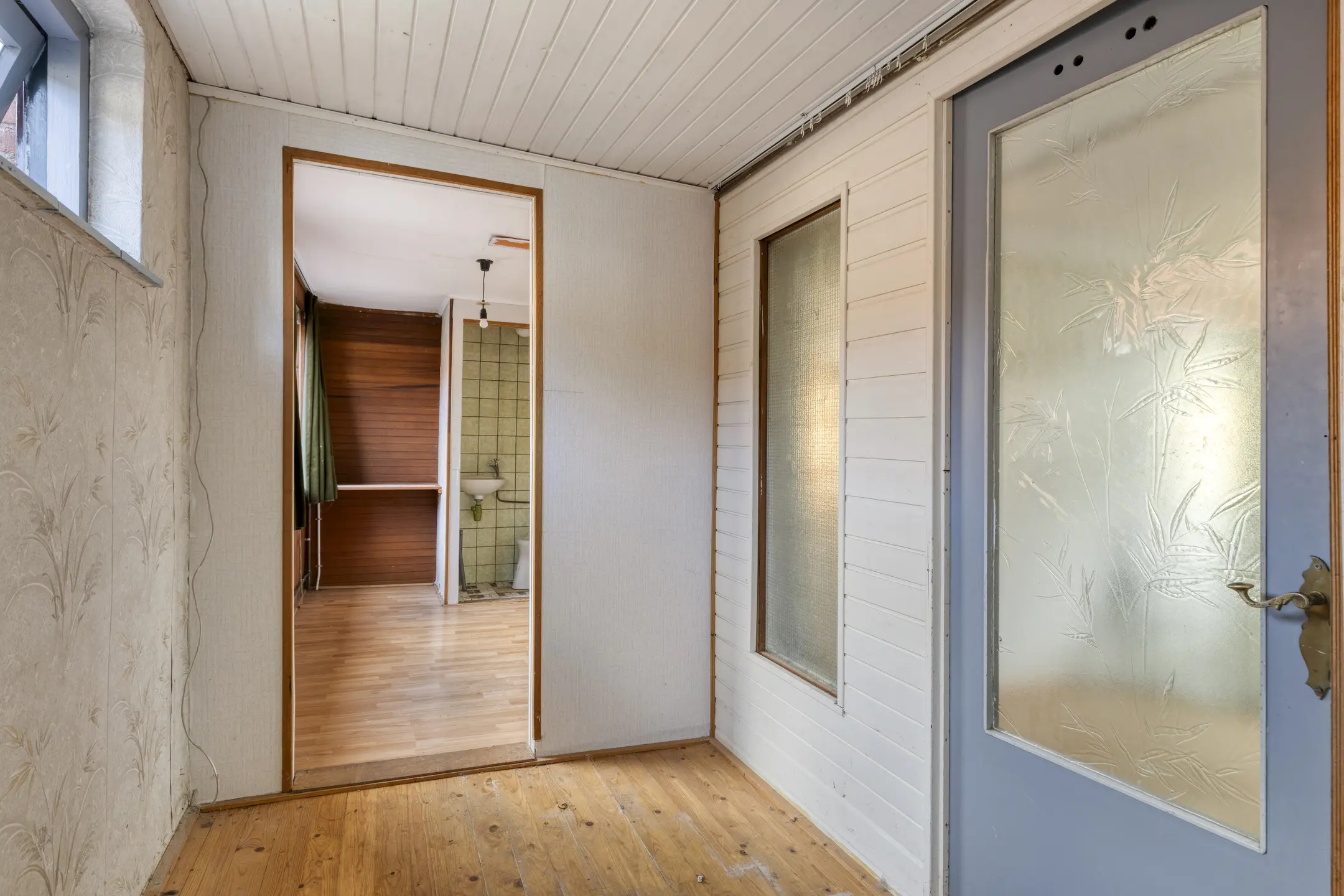 Via de hal kom je binnen in de woning. Aan de linkerzijde bevindt zich een berging met de meterkast (gas en elektra niet aangesloten). Vanuit de hal loop je door naar de woonkamer. Deze is ruim van opzet en beschikt over een karakteristieke schouwpartij. Aan de achterzijde bevindt zich de keuken, die in een hoekopstelling is geplaatst en is voorzien van een geiser en toegang biedt tot de tuin. Aansluitend vind je de badkamer. Deze is voorzien van een ligbad, toilet en fonteintje.