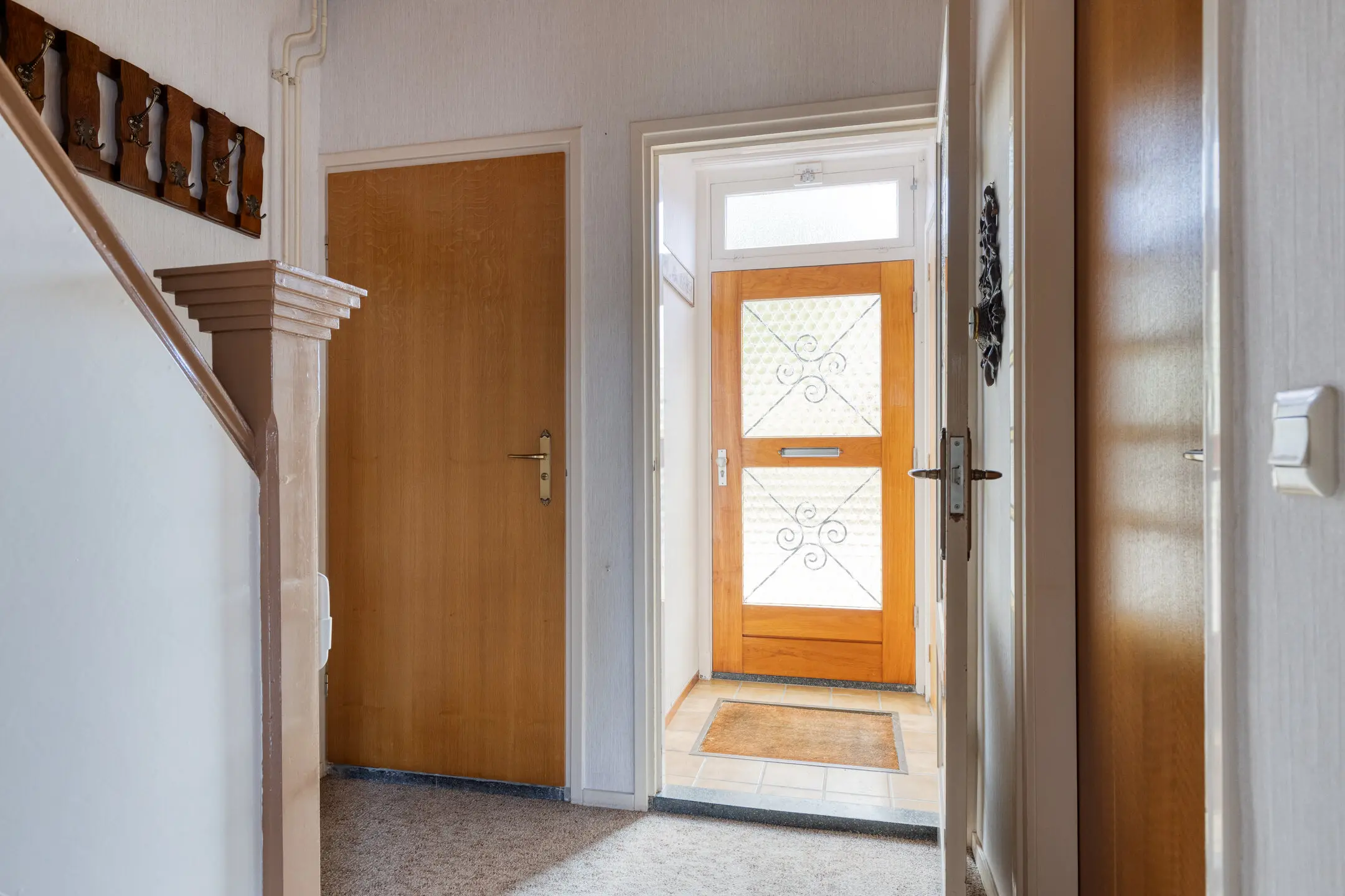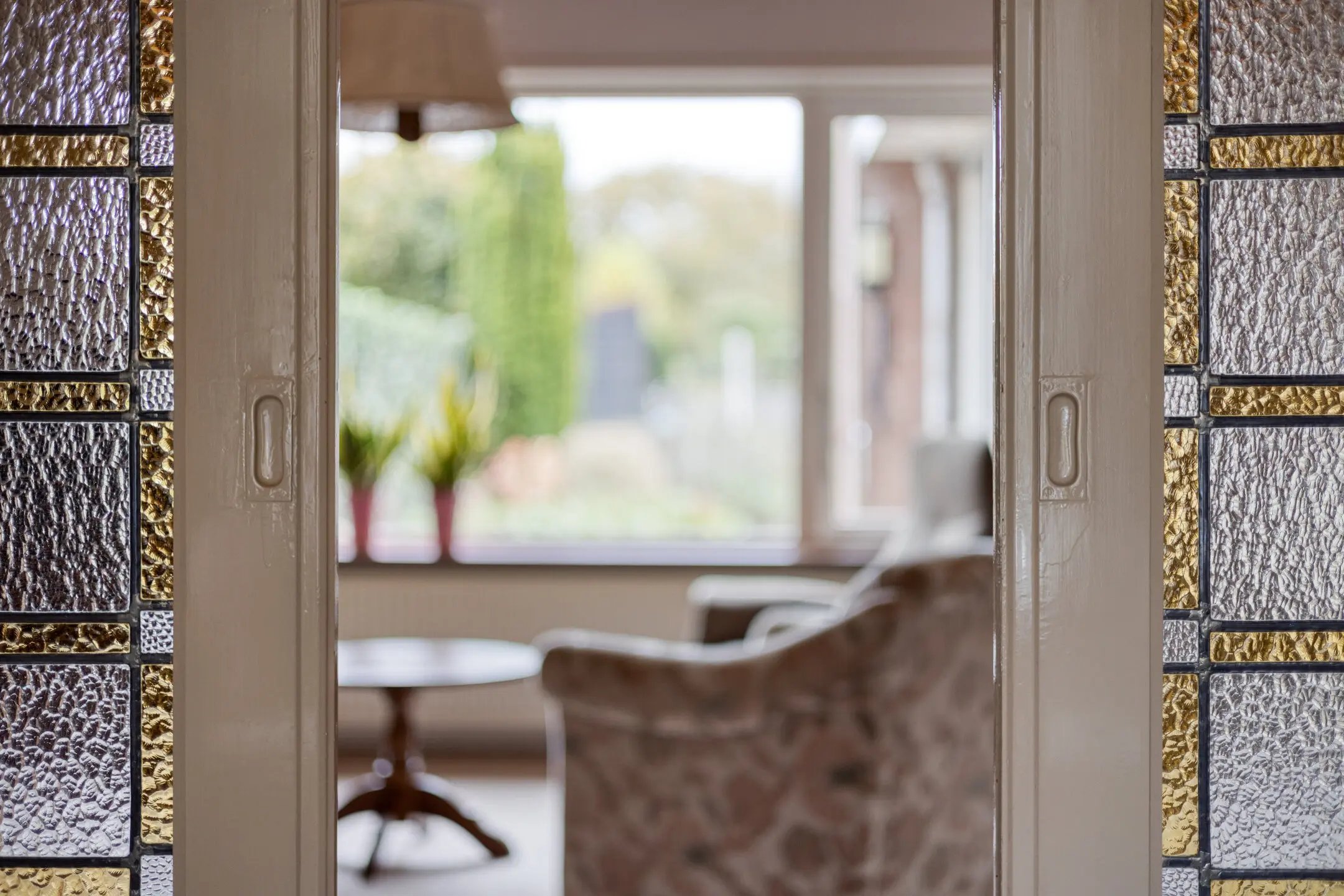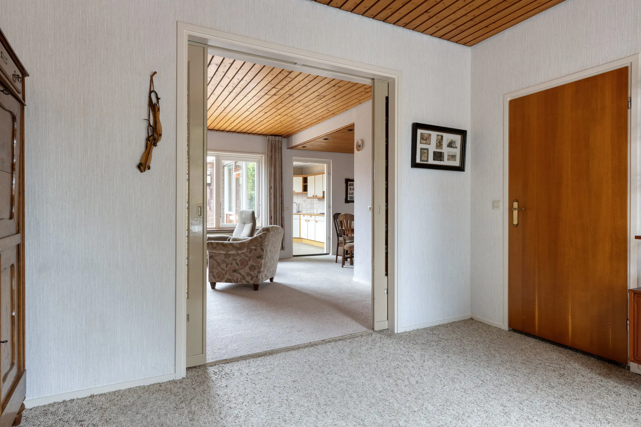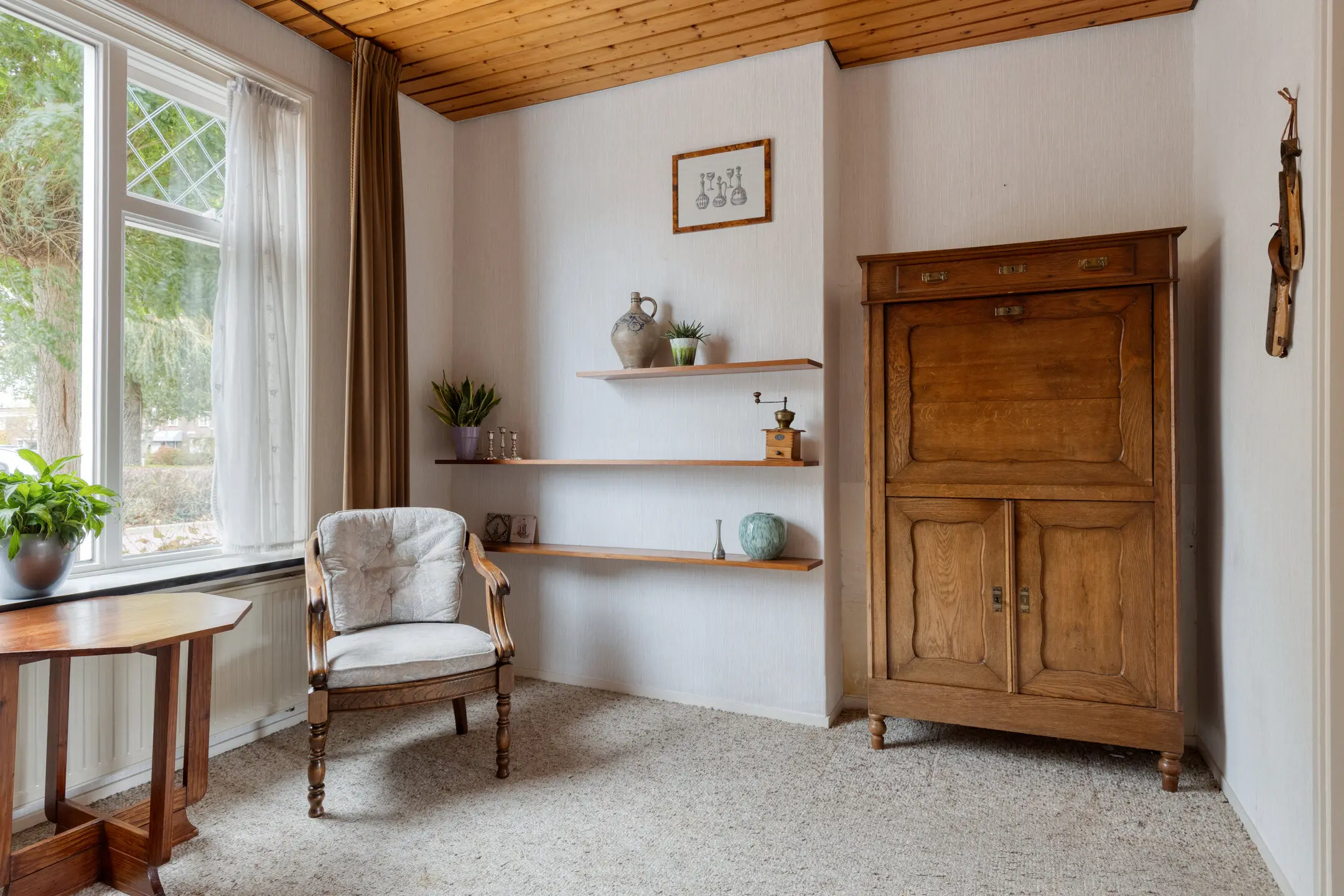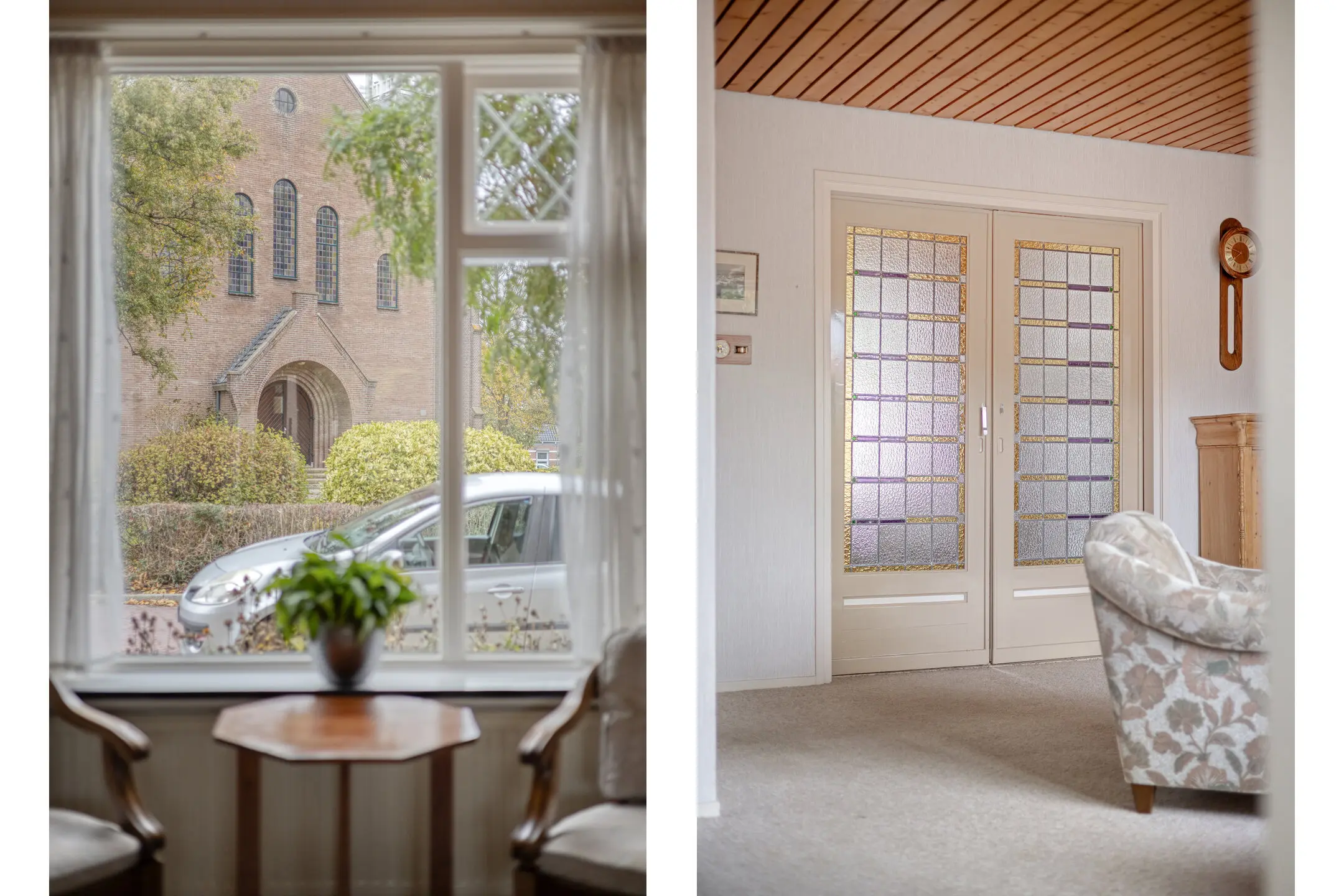 Via de hal – met meterkast, toilet met fonteintje, trapopgang en praktische verdiepte kelderkast – stap je de woonkamer binnen. De woonkamer heeft een gezellige indeling met karakteristieke en-suite deuren. Aan de voorzijde geniet je van een sfeervol uitzicht op de Ring en de kerk, terwijl je aan de achterzijde uitkijkt over de tuin. Het grote raam aan deze kant zorgt voor veel lichtinval en is voorzien van zonwering.