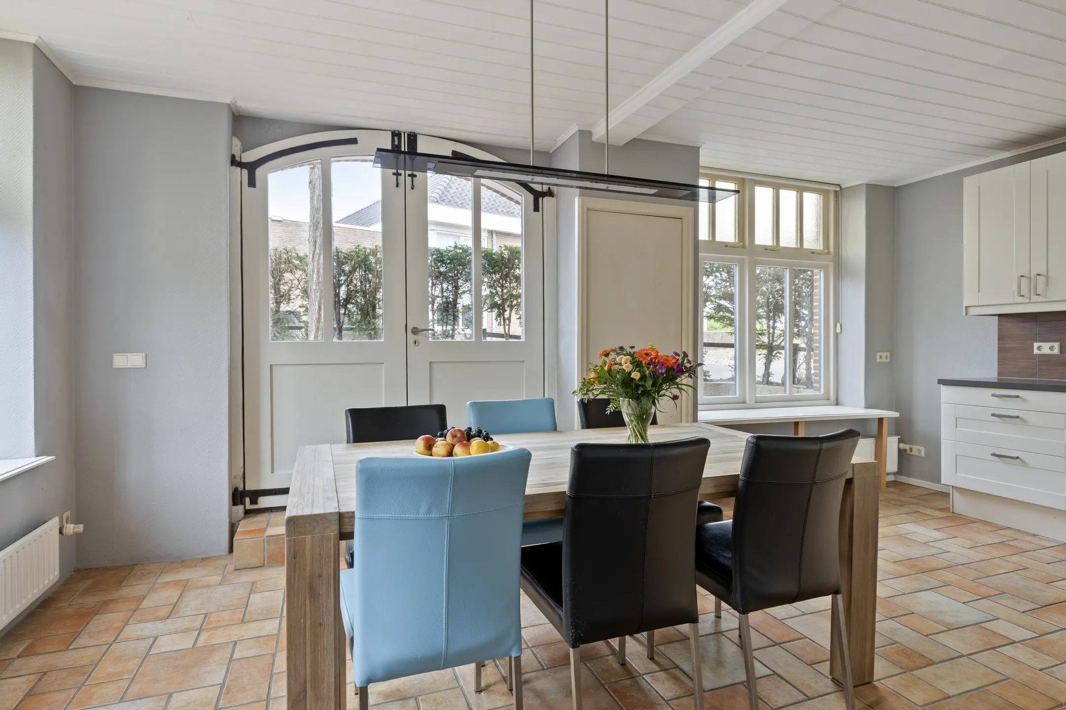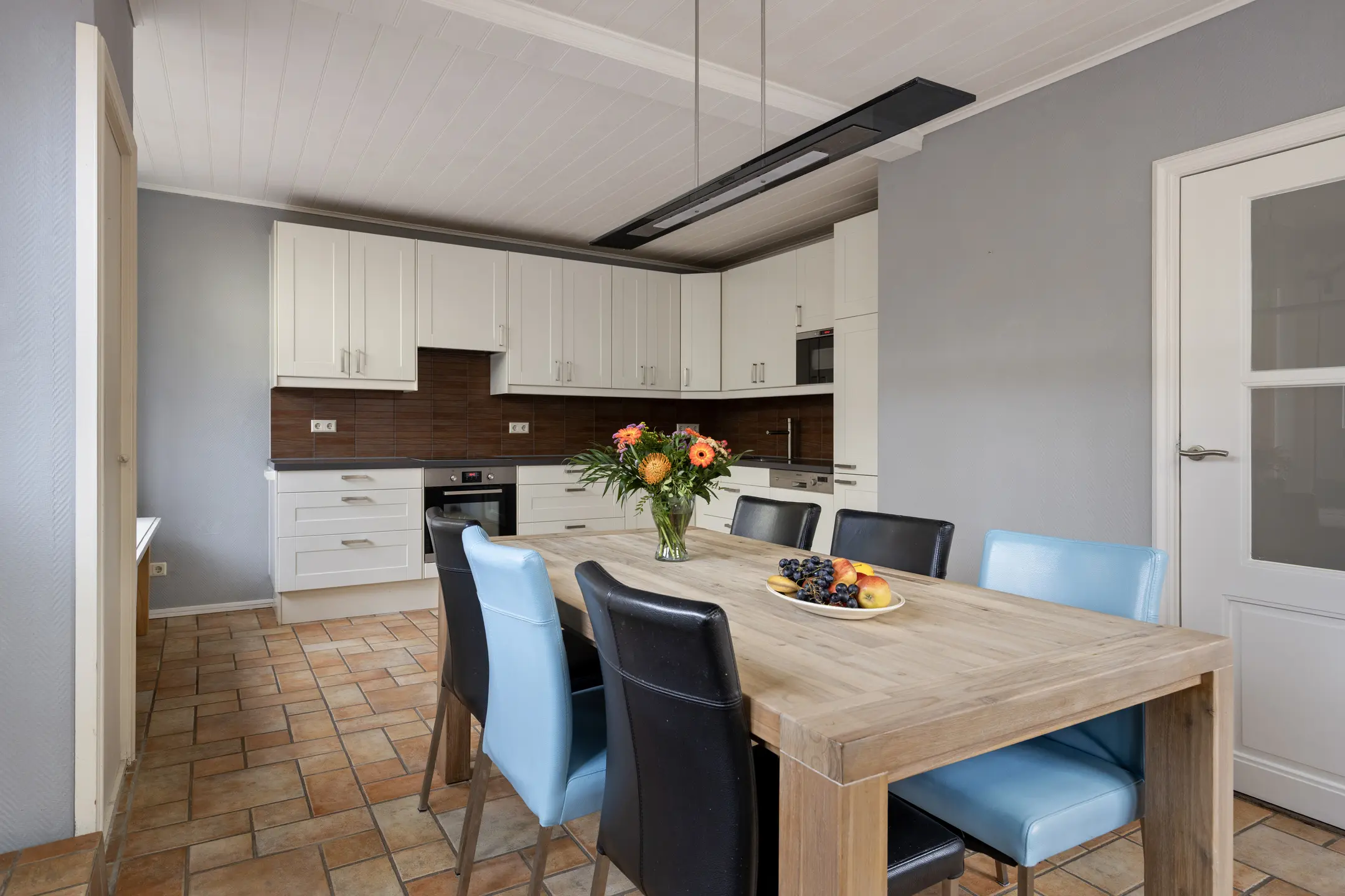 Je komt binnen in een ruime hal met toegang tot de bijkeuken, berging, het toilet en de woonkeuken. Tevens bevindt zich hier de trapopgang naar de eerste verdieping. De woonkeuken aan de voorzijde is een heerlijke, lichte ruimte dankzij de grote ramen en openslaande deuren naar het terras. De keuken is verzorgd en uitgevoerd in een praktische hoekopstelling en voorzien van diverse inbouwapparatuur, waaronder een 4-pits inductiekookplaat, afzuigkap, oven, magnetron, koel-vriescombinatie en een vaatwasser. Een comfortabele plek om te koken en samen te komen. Je kunt er tafelen met tien personen. Daarnaast is er op de begane grond de bijkeuken (met aansluiting voor douche). In de vaste kast bevindt zich de verdeler van de vloerverwarming. De vloerverwarming bevindt zich in de keuken, hal, het toilet en de bijkeuken. Aan de achterzijde van de woning bevindt zich een berging / bijkeuken met extra opstelmogelijkheden voor witgoed, de cv-installatie (bouwjaar ca. 2012) en een deur naar de achtertuin.