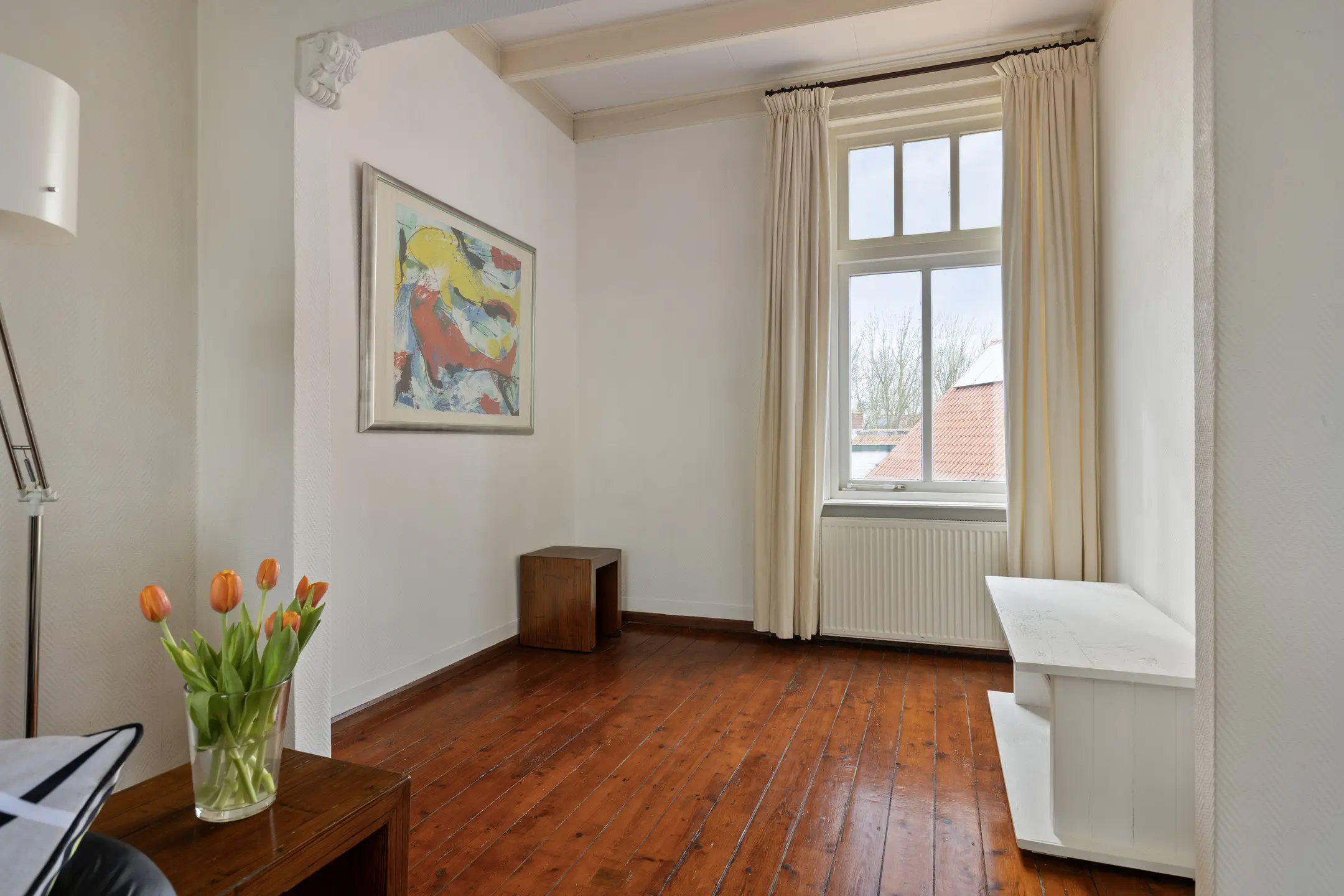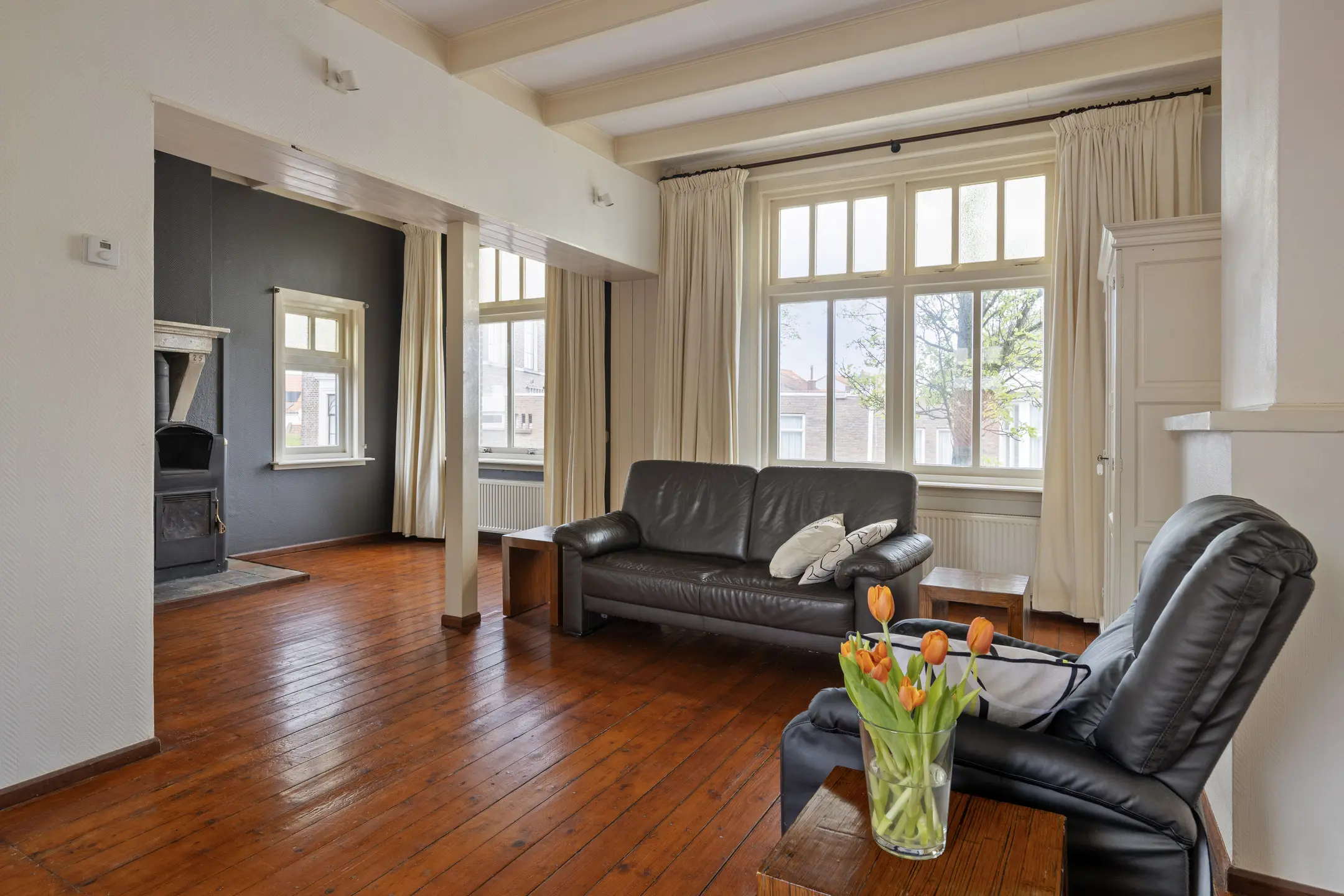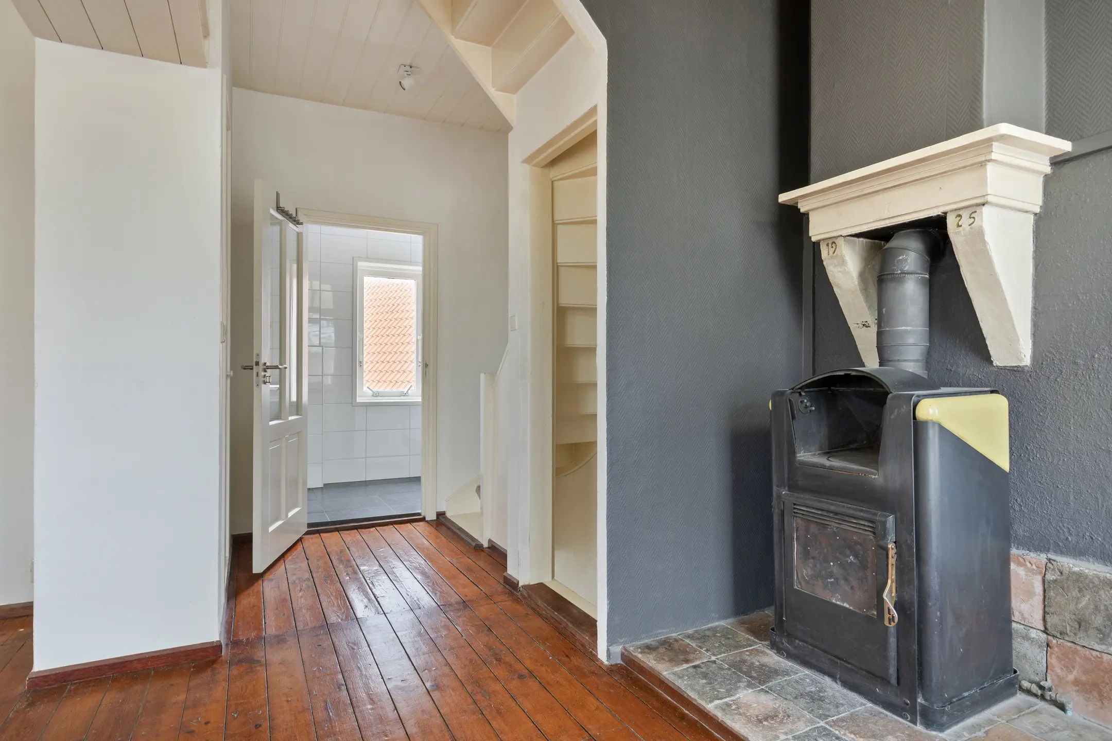 De eerste verdieping verrast direct. Hier bevindt zich een sfeervolle woonkamer met een warme en authentieke uitstraling. Het balkenplafond, de houten vloer, vaste kasten en de houtkachel (niet in gebruik) met schouw zorgen samen voor een karaktervol geheel. De hoge ramen zorgen voor een prettige lichtinval en aan de voorzijde geniet je van een fraai zicht over de haven. De badkamer op deze verdieping is ruim en compleet, voorzien van een inloopdouche, toilet en een badmeubel met dubbele wastafel. Dankzij de ramen is ook hier sprake van aangenaam daglicht.