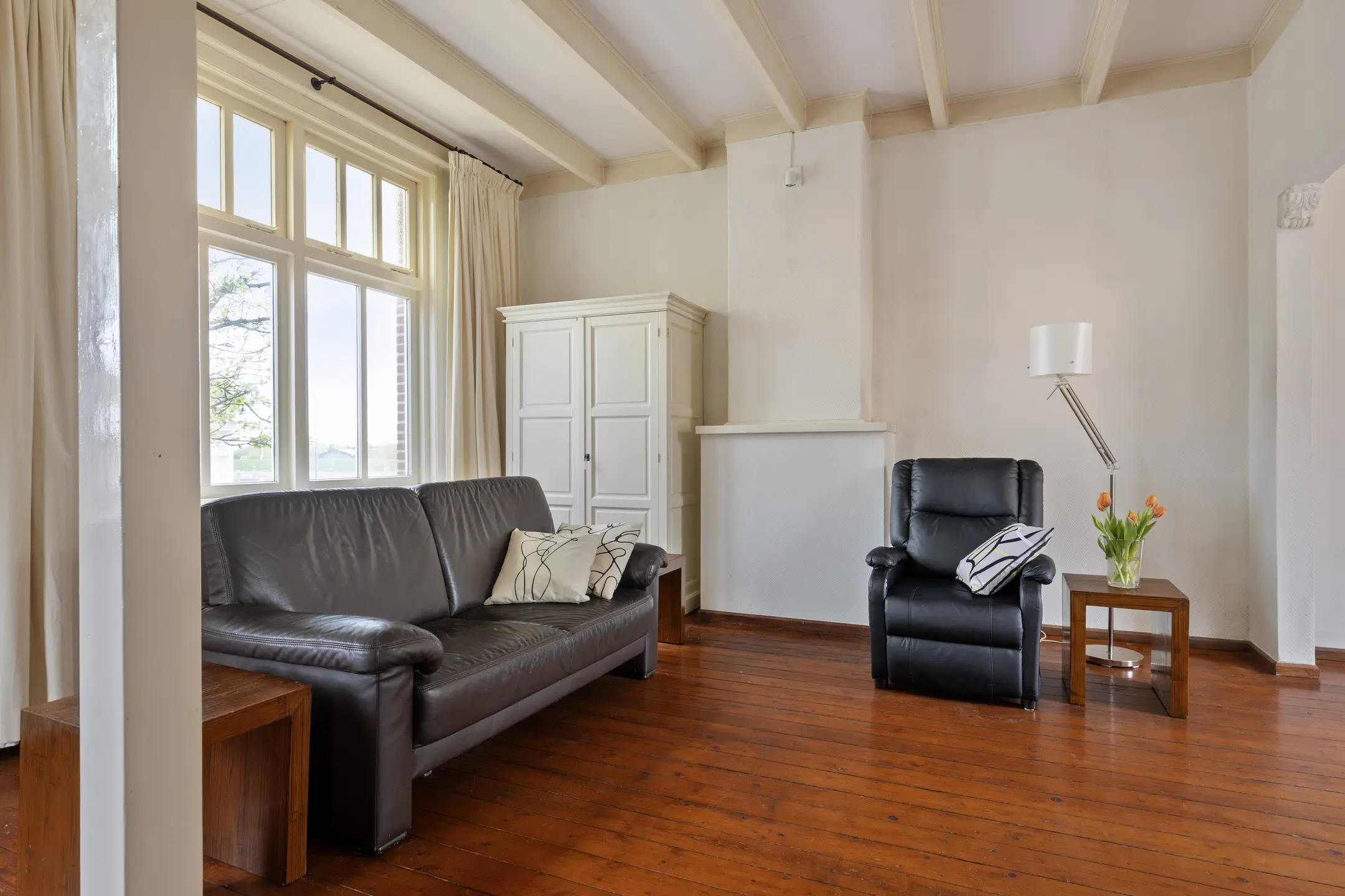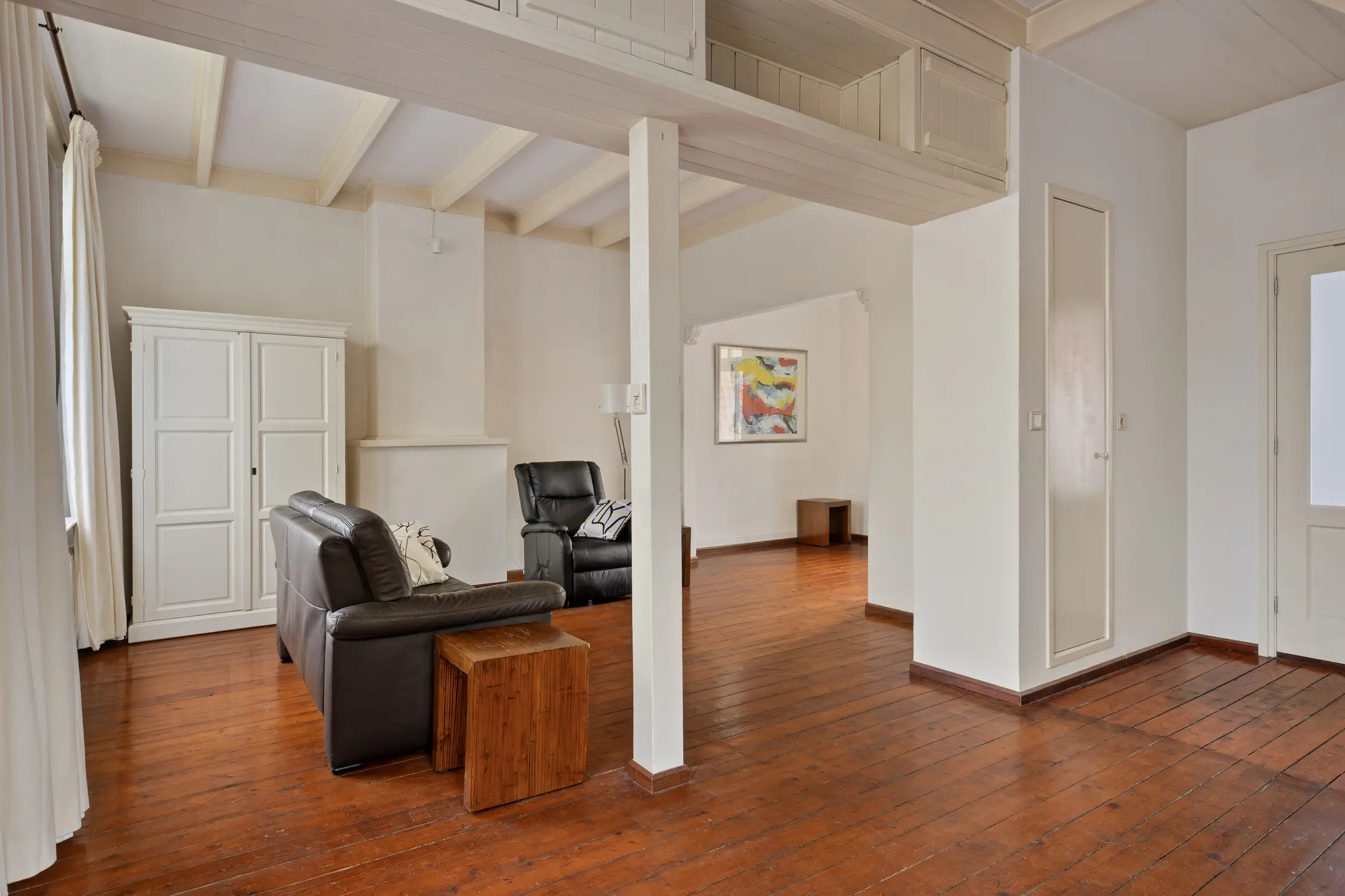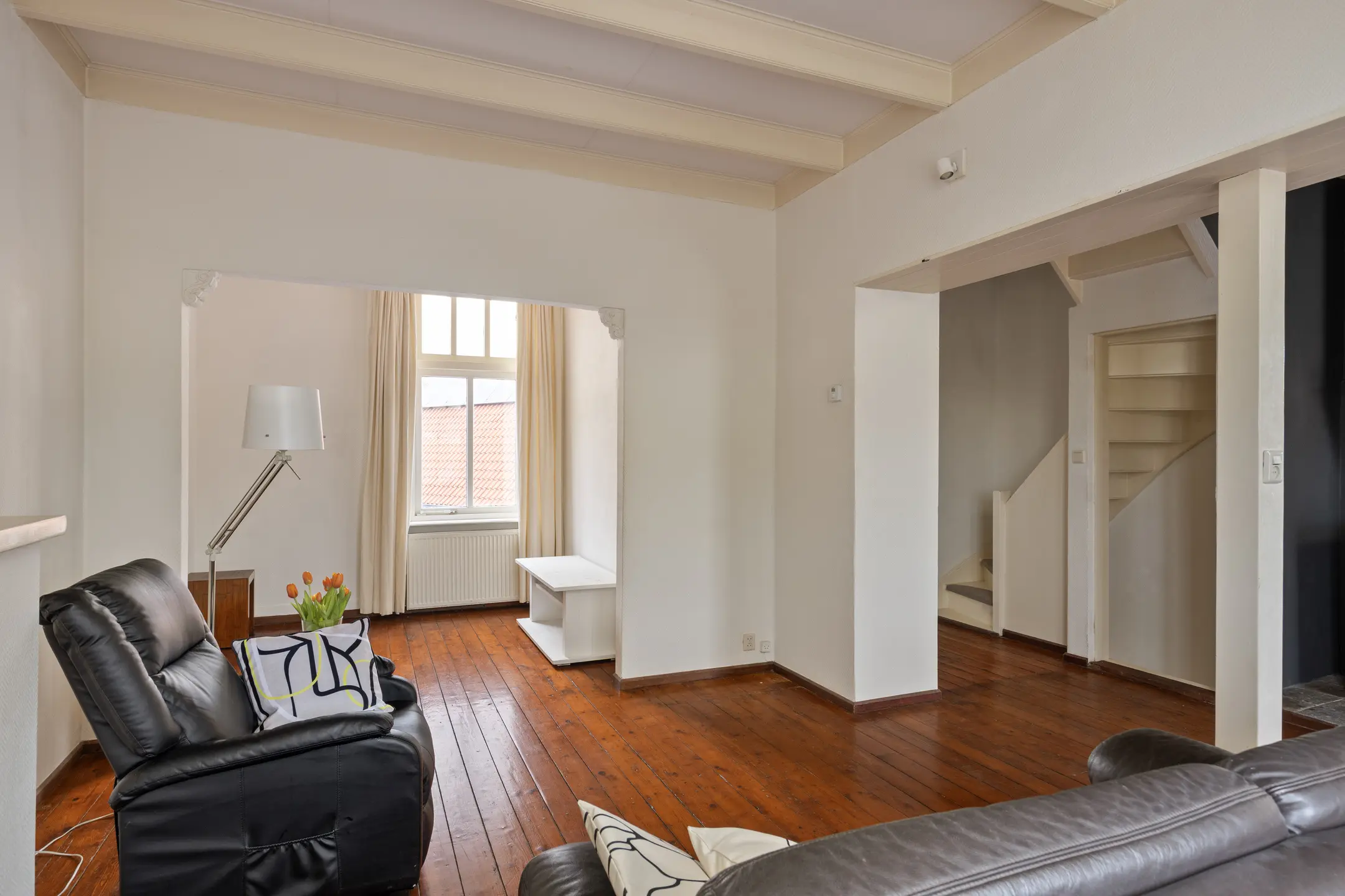 De eerste verdieping verrast direct. Hier bevindt zich een sfeervolle woonkamer met een warme en authentieke uitstraling. Het balkenplafond, de houten vloer, vaste kasten en de houtkachel (niet in gebruik) met schouw zorgen samen voor een karaktervol geheel. De hoge ramen zorgen voor een prettige lichtinval en aan de voorzijde geniet je van een fraai zicht over de haven. De badkamer op deze verdieping is ruim en compleet, voorzien van een inloopdouche, toilet en een badmeubel met dubbele wastafel. Dankzij de ramen is ook hier sprake van aangenaam daglicht.