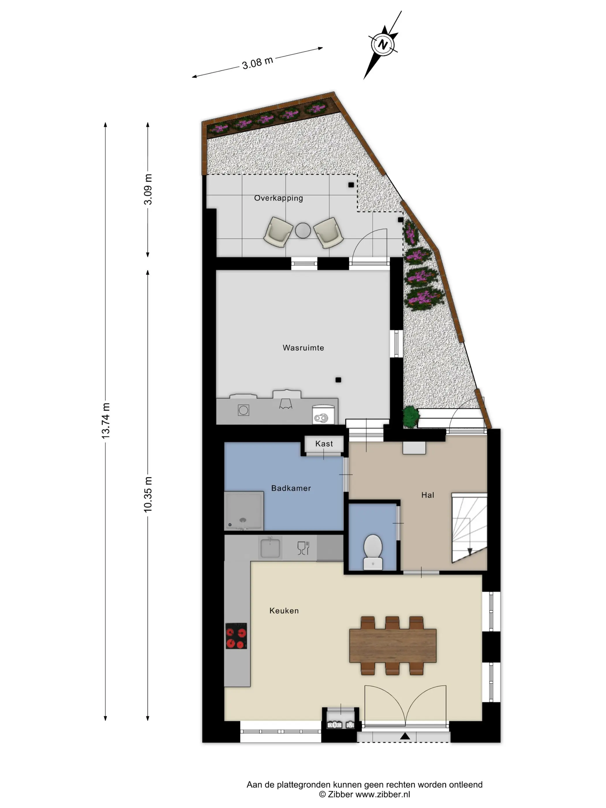 De achtertuin is ingericht met siergrind en een overkapping direct bij de achterdeur en gelegen op het zuidoosten. Een zonnige plek om beschut buiten te zitten. Aan de voorzijde bevindt zich eveneens een siertuin en een terras, ideaal gelegen aan de keuken, perfect voor degene die van buiten koken houdt.