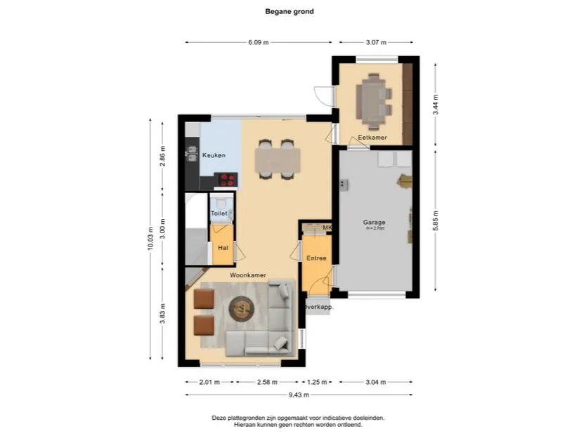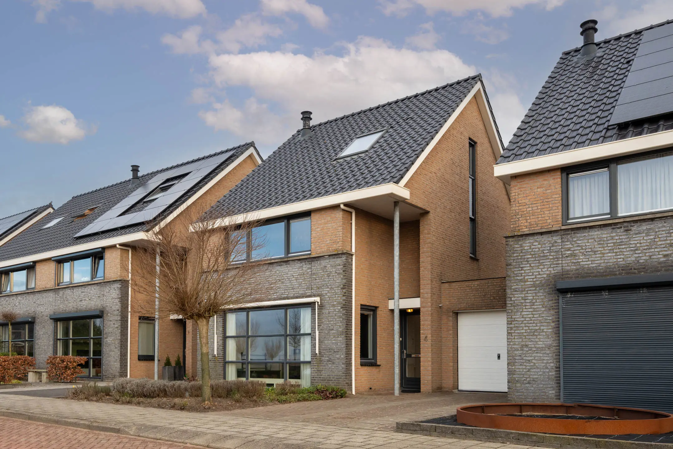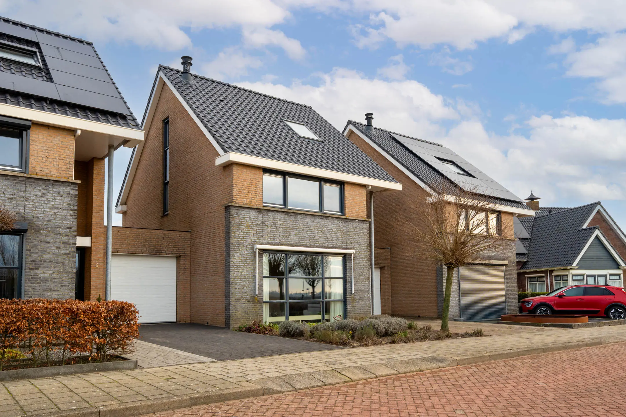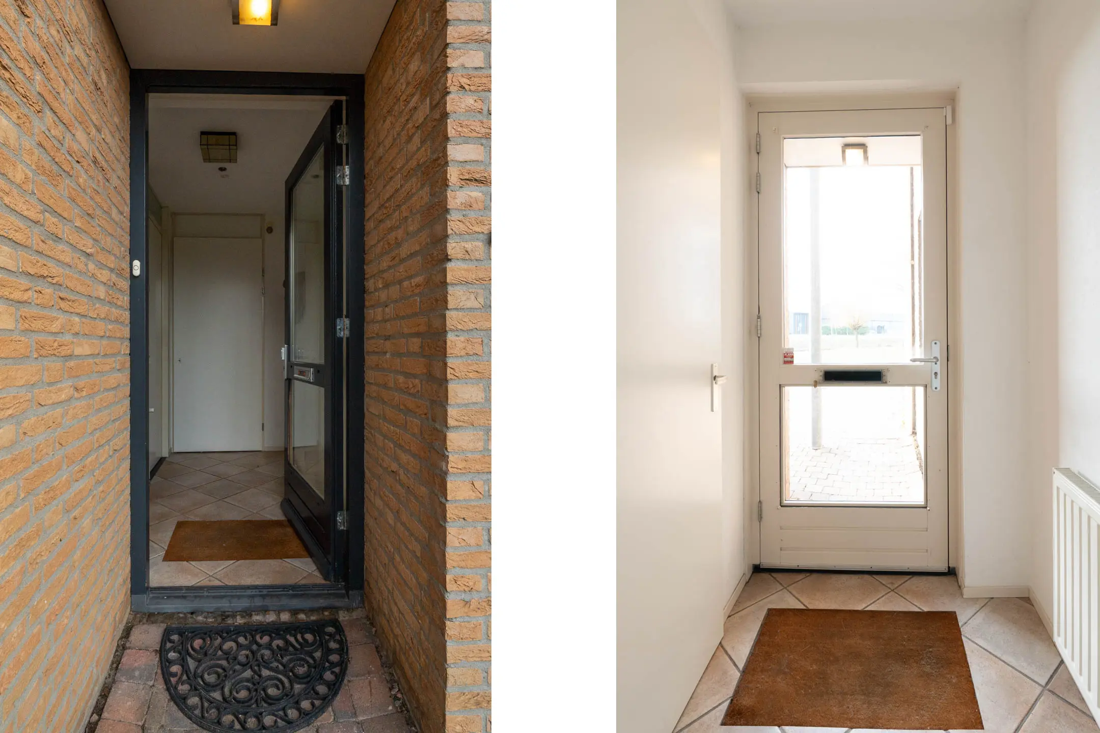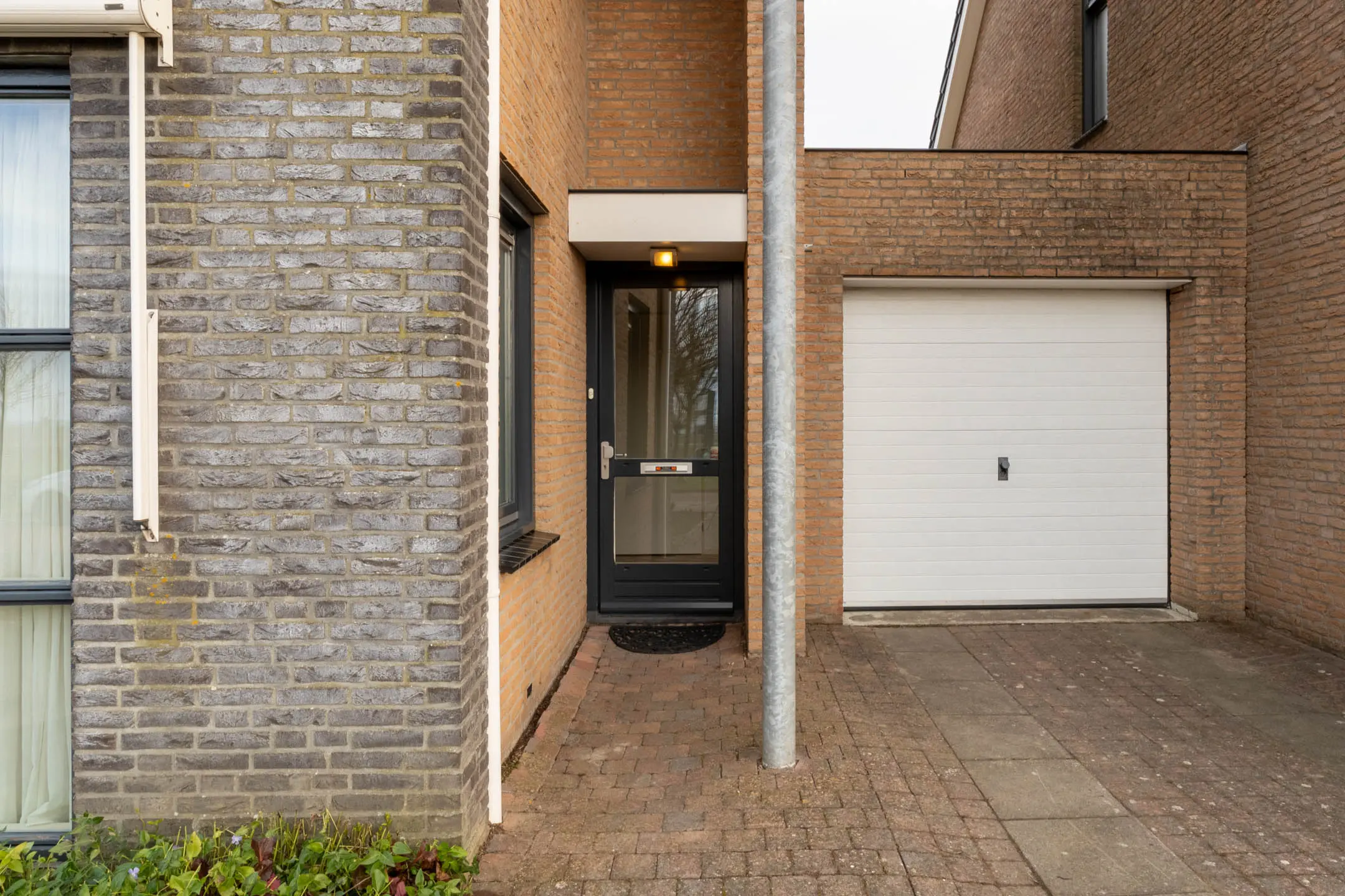 De voordeur bevindt zich onder een prettig overstek, waardoor je altijd droog binnenkomt. In de hal vind je de meterkast en heb je toegang tot meerdere ruimtes. Direct rechts is een praktische doorgang naar de garage en links stap je de woonkamer binnen.