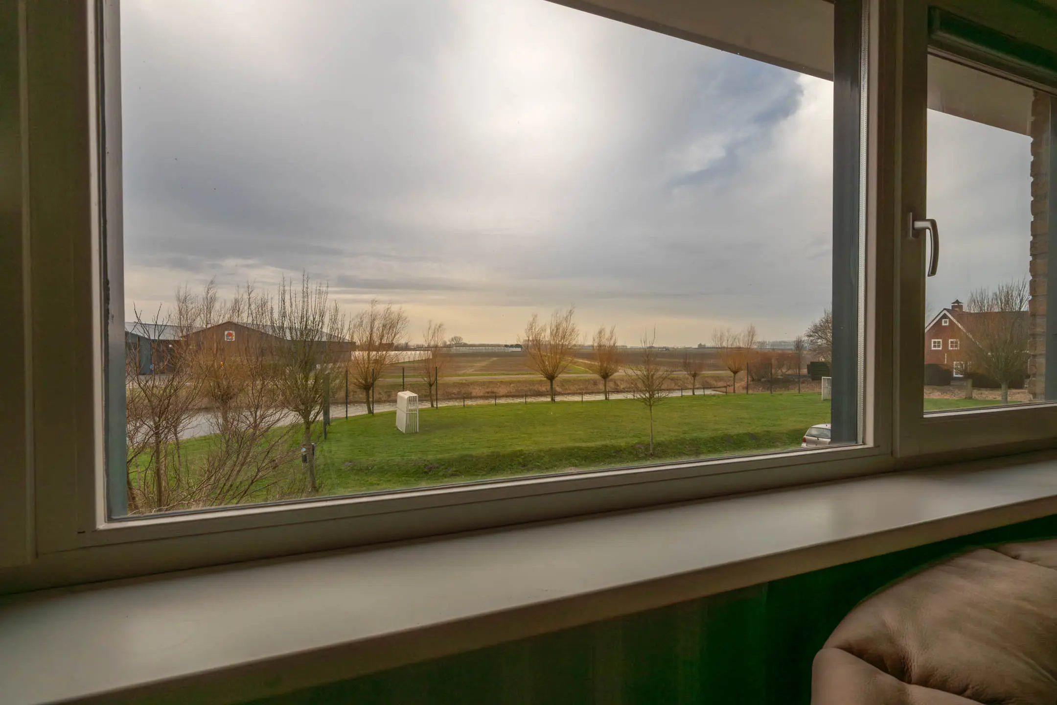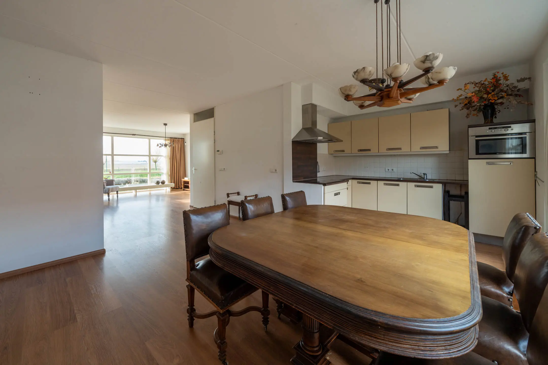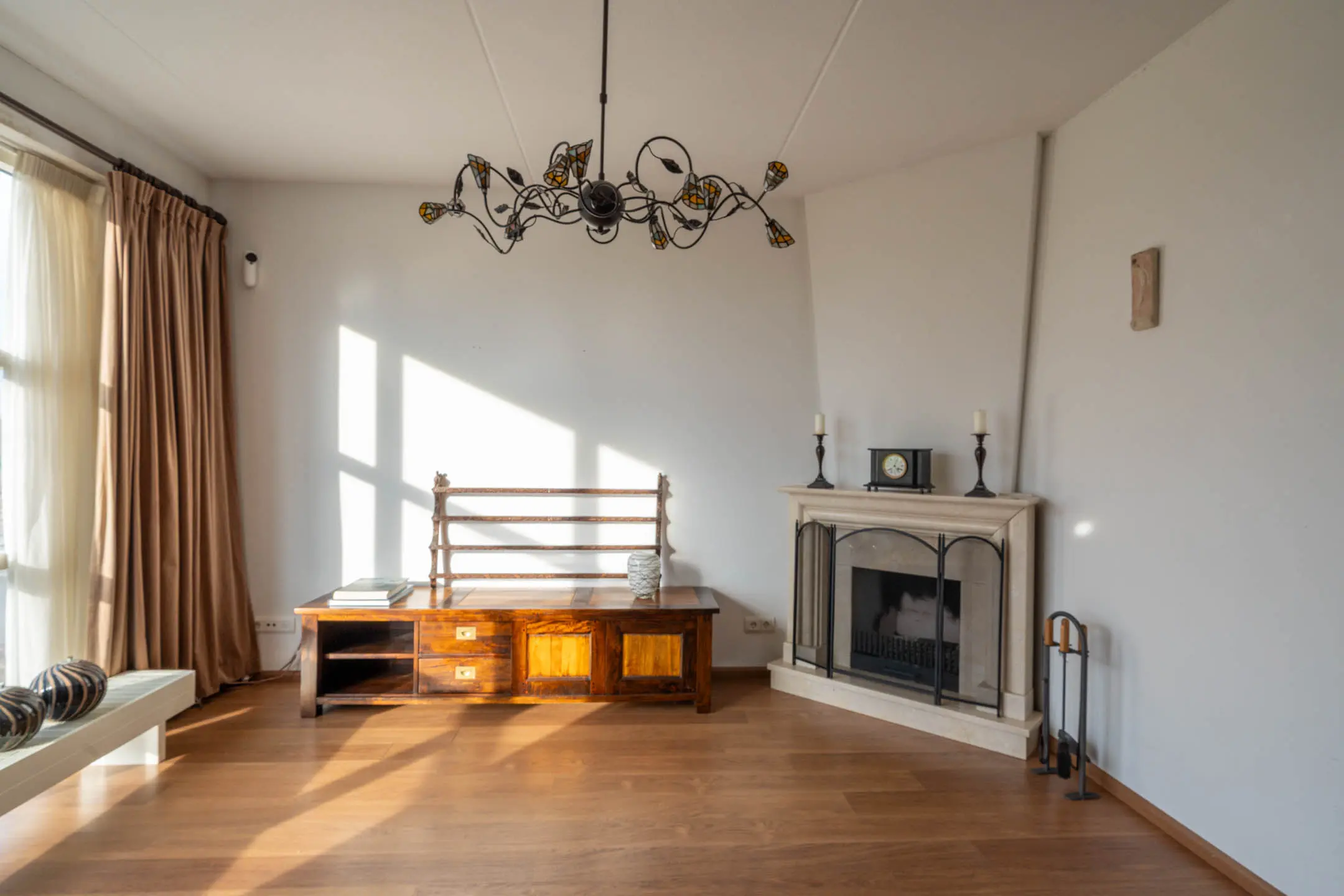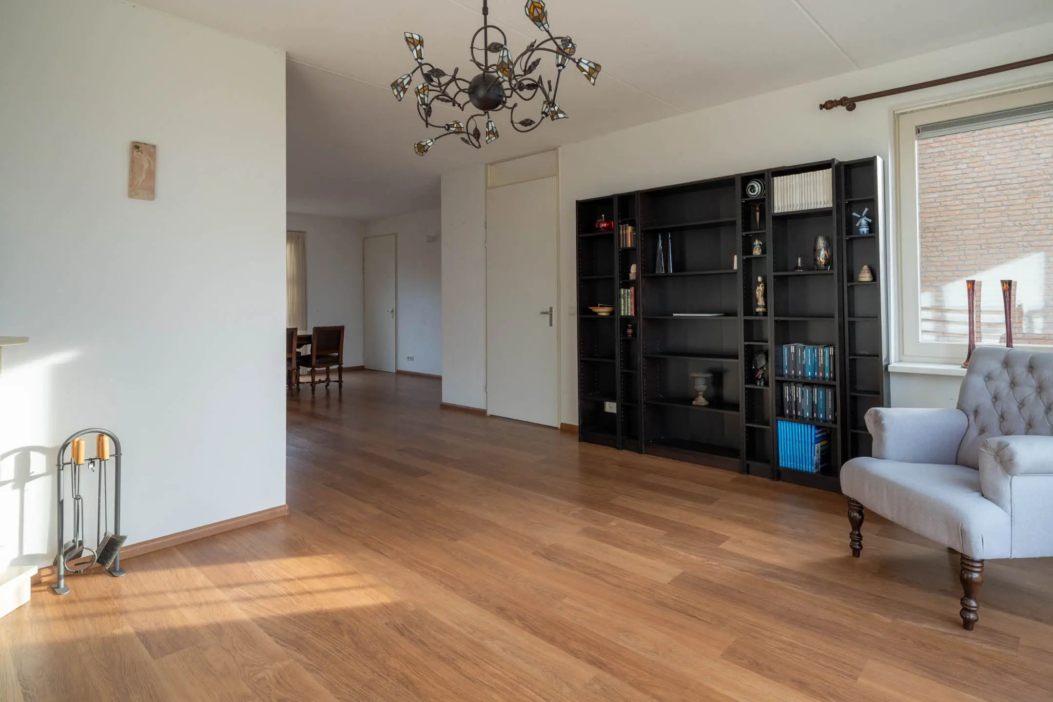 De doorzonwoonkamer vormt een royale en lichte leefruimte. De open haard met fraaie schouw zorgt voor extra sfeer. Aan de voorzijde geniet je van een vrij uitzicht over het speelveldje en de polder. Het raam aan deze zijde is voorzien van elektrisch bedienbare zonwering.