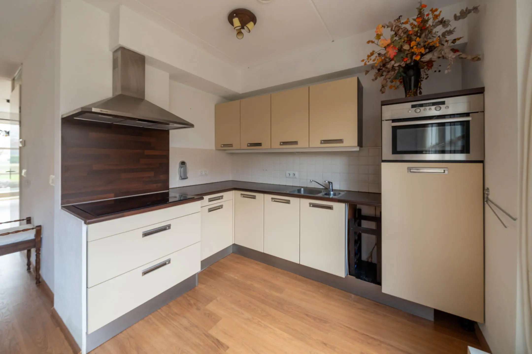 Aan de achterzijde staat de woonkamer in open verbinding met de keuken. De keuken is uitgerust met een koelkast, combimagnetron en een 4-pits inductiekookplaat met afzuigkap. Dankzij de schuifpui naar de achtertuin lopen binnen en buiten hier mooi in elkaar over.