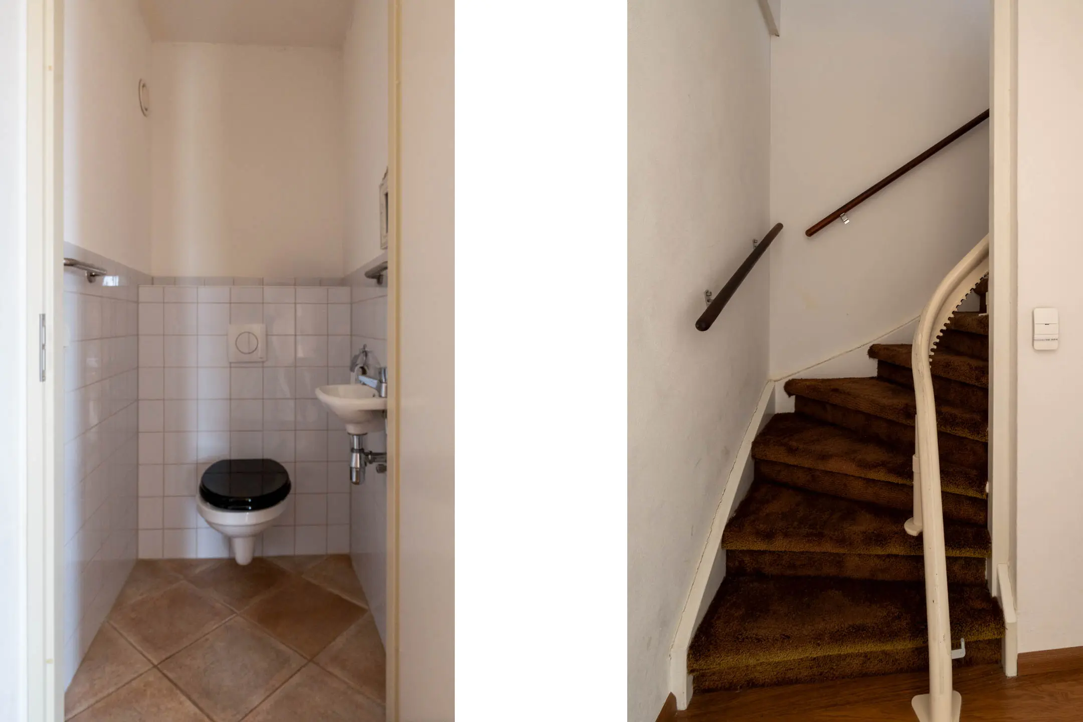 Tussen de woonkamer en keuken ligt een tussenhal met het toilet en de trapopgang naar de verdieping.