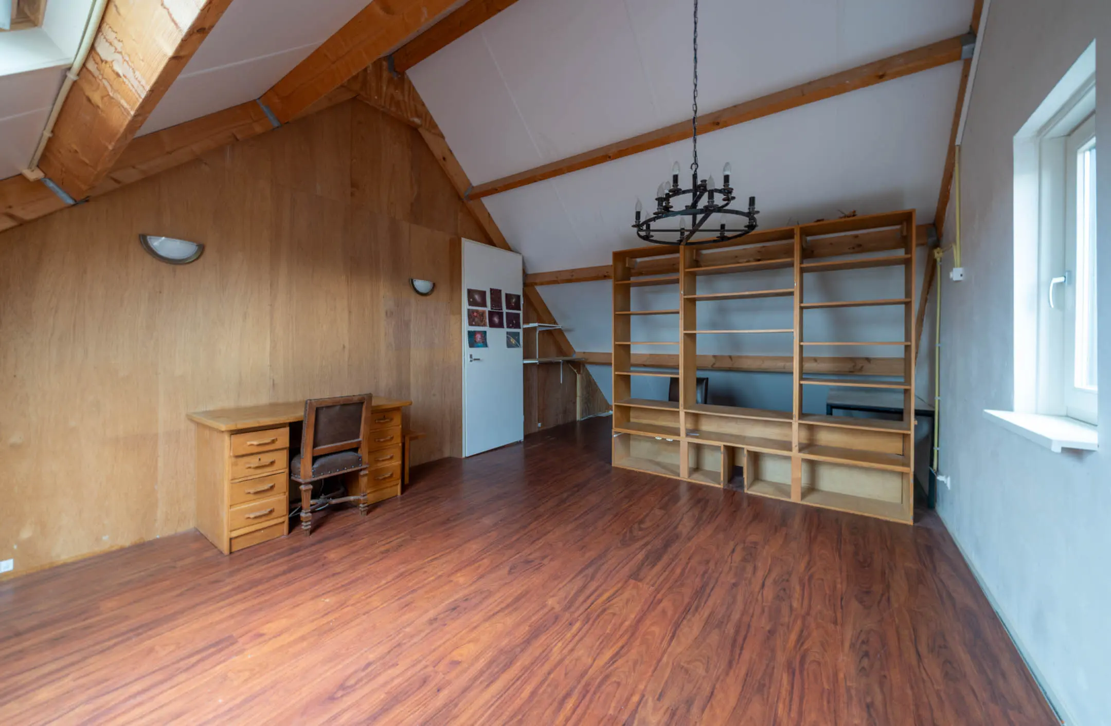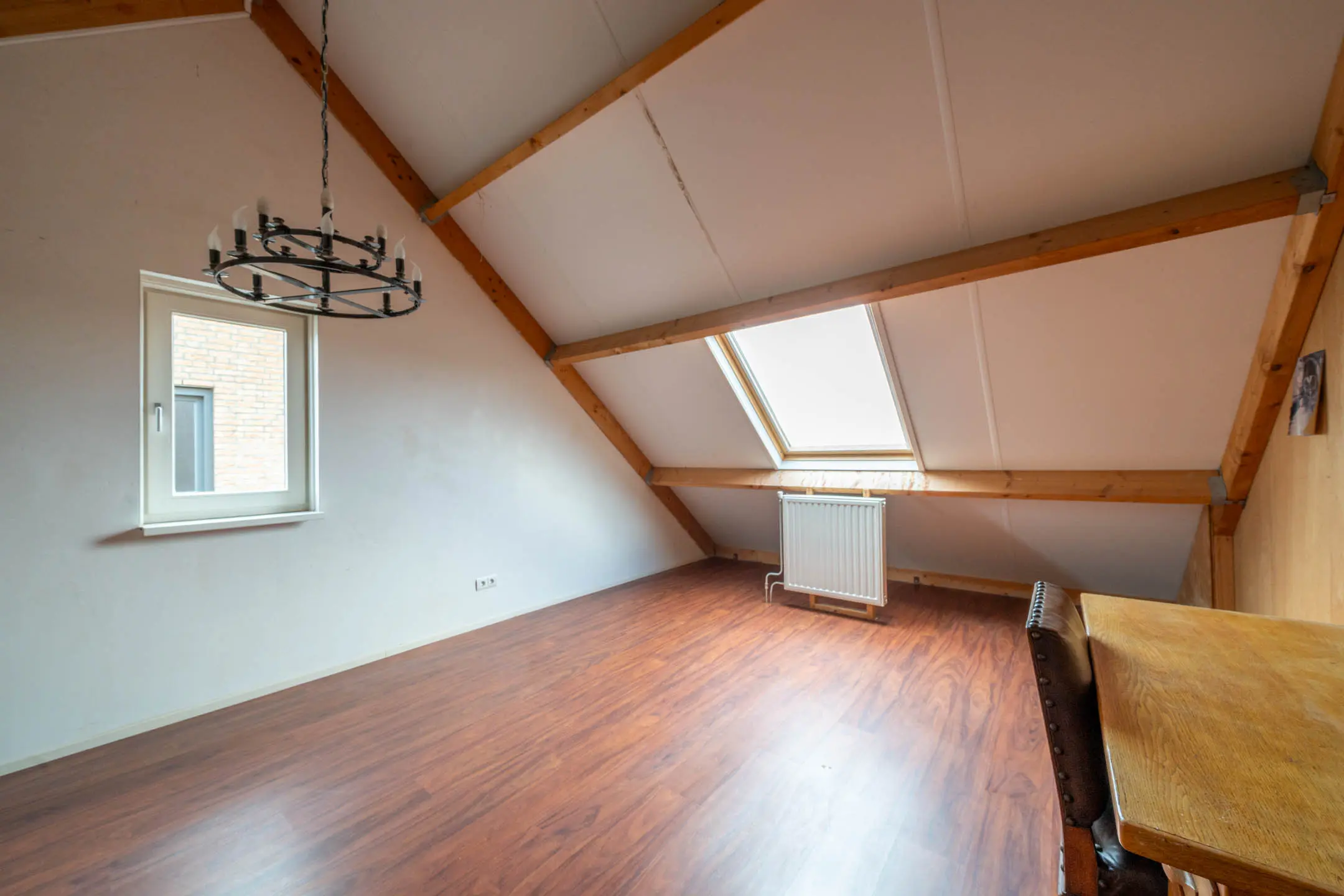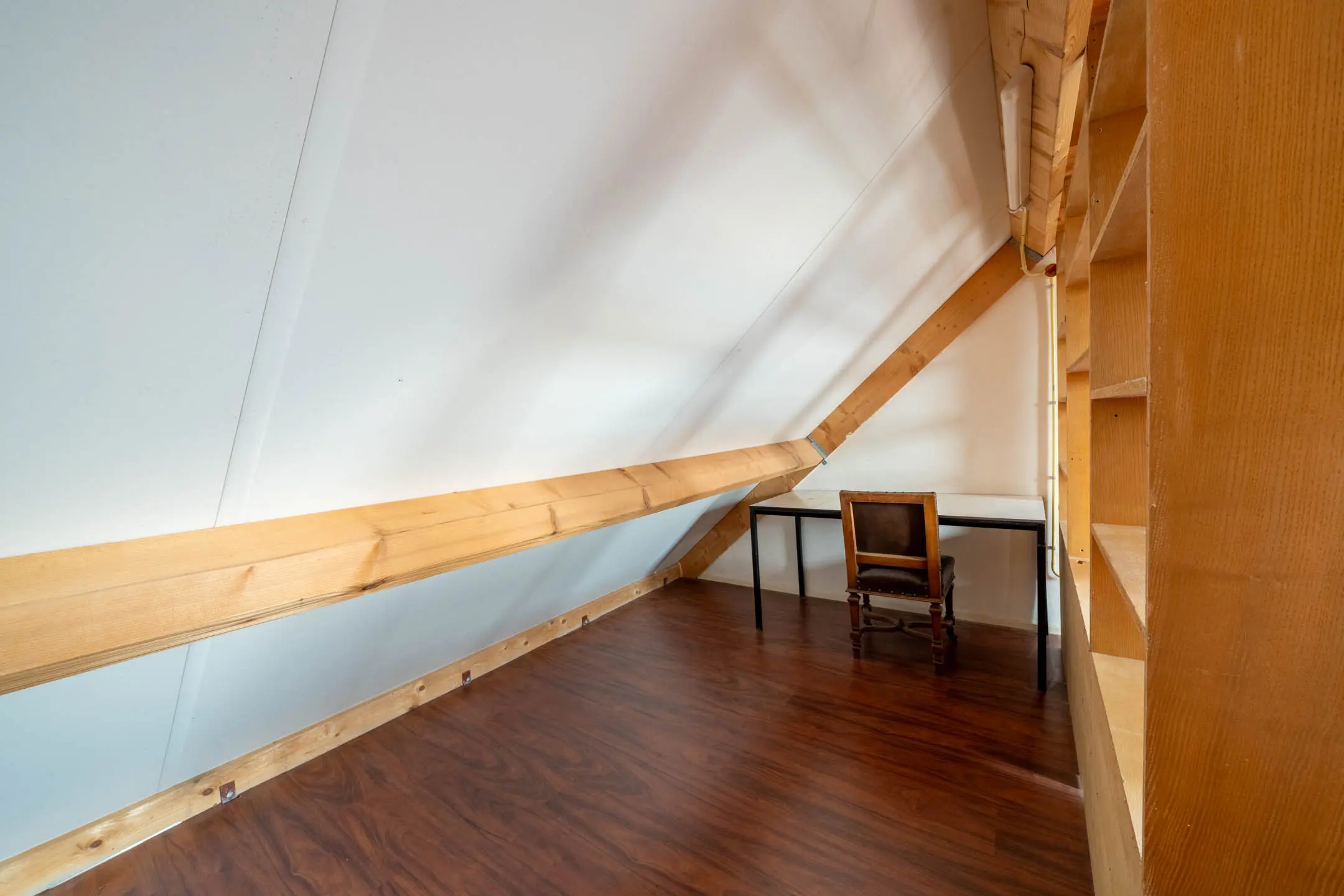 Achter de deur bevindt zich een grote open zolderruimte, deze ruimte biedt echter uitstekende mogelijkheden voor het realiseren van één of zelfs twee extra slaapkamers, waardoor het totaal aantal kamers eenvoudig kan worden uitgebreid. Het aanwezige Velux-dakraam zorgt voor een prettige lichtinval.