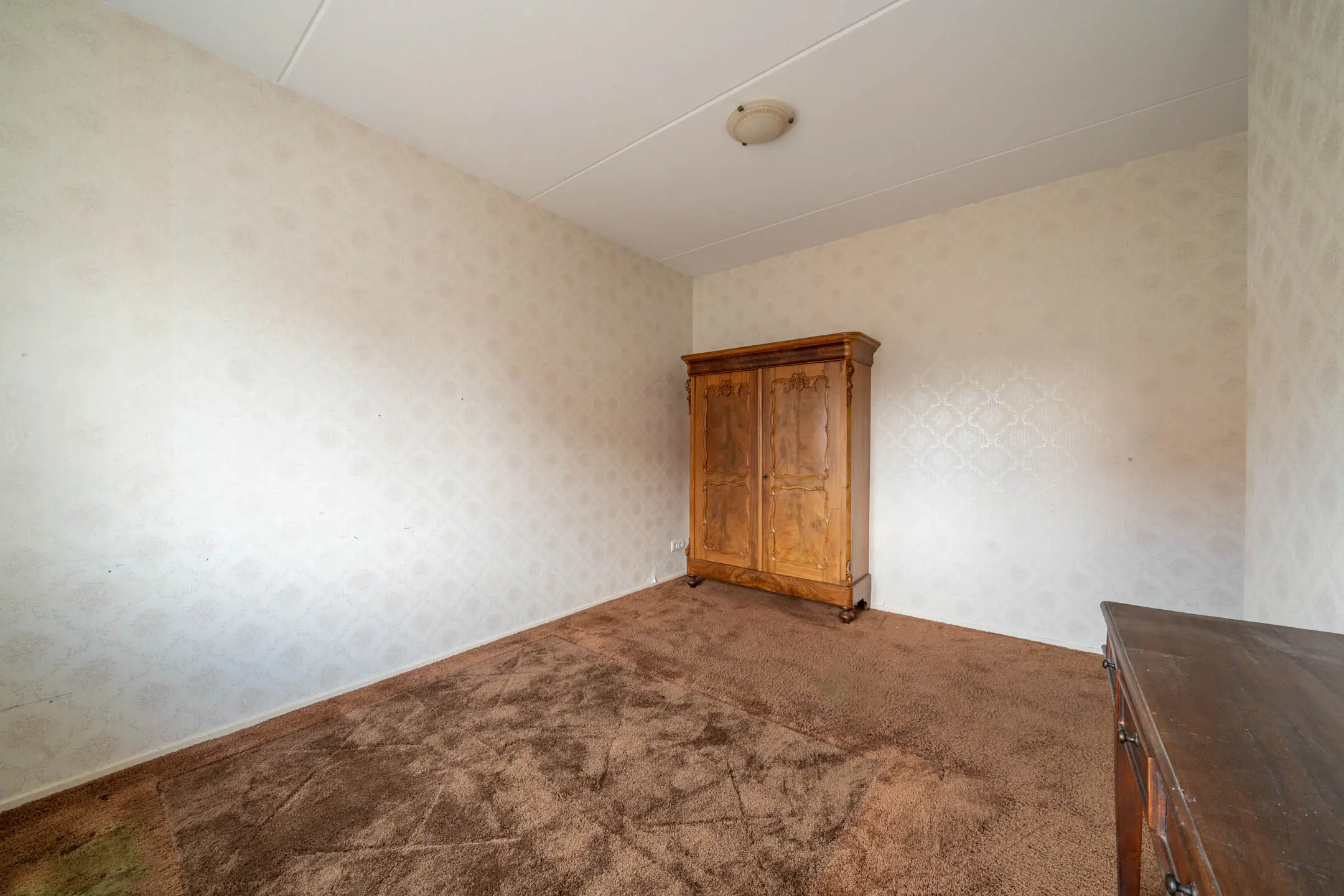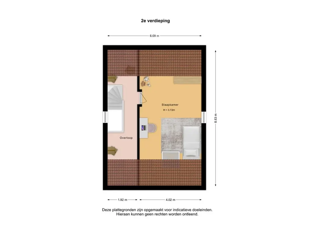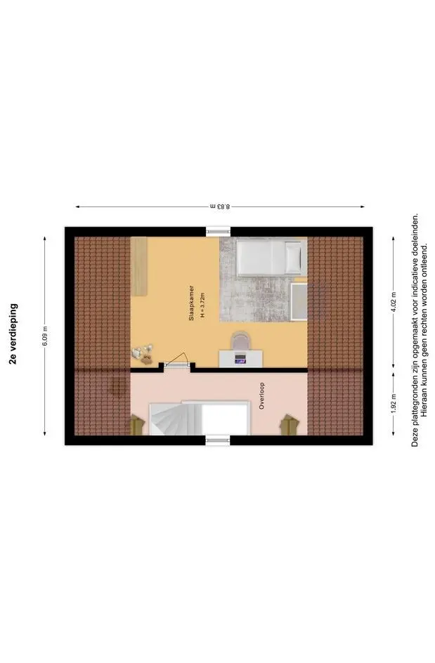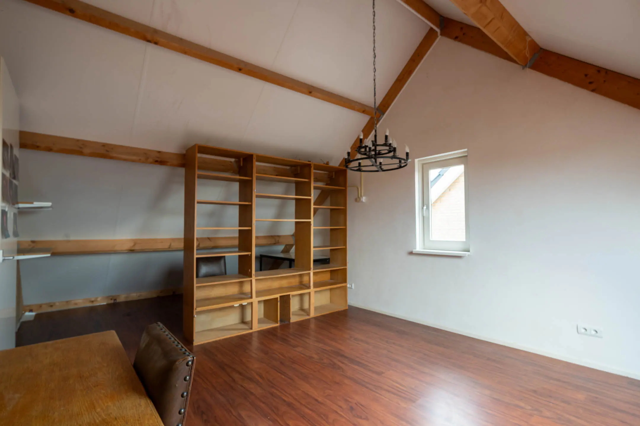 Achter de deur bevindt zich een grote open zolderruimte, deze ruimte biedt echter uitstekende mogelijkheden voor het realiseren van één of zelfs twee extra slaapkamers, waardoor het totaal aantal kamers eenvoudig kan worden uitgebreid. Het aanwezige Velux-dakraam zorgt voor een prettige lichtinval.