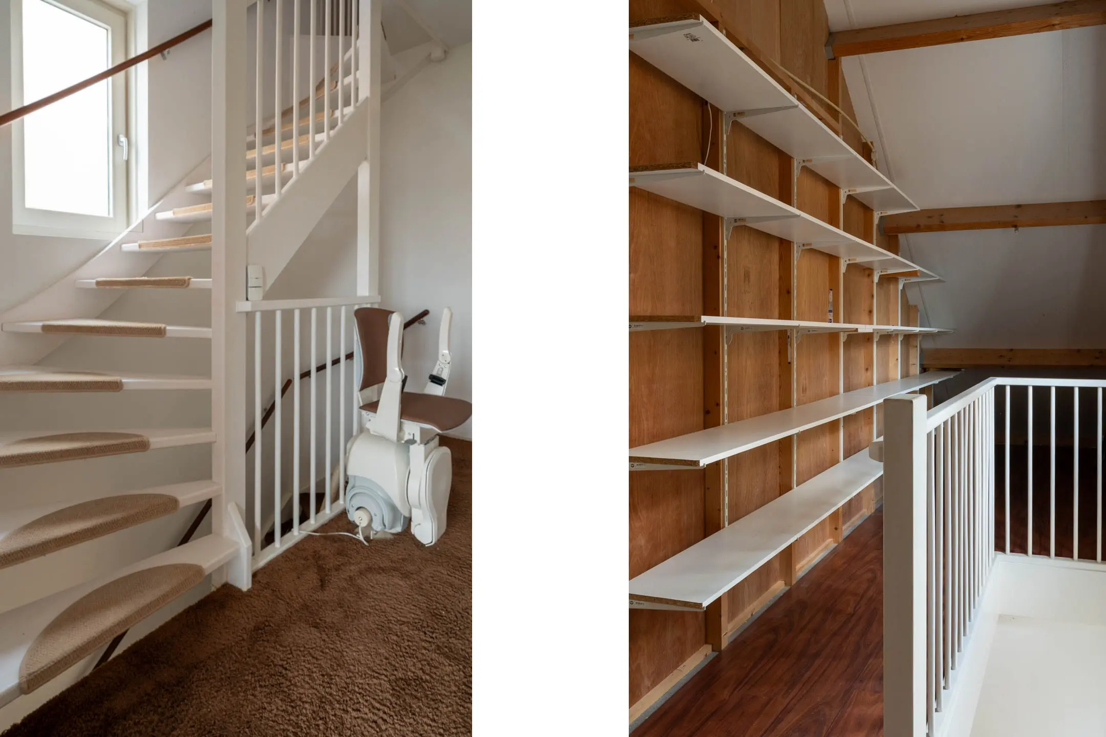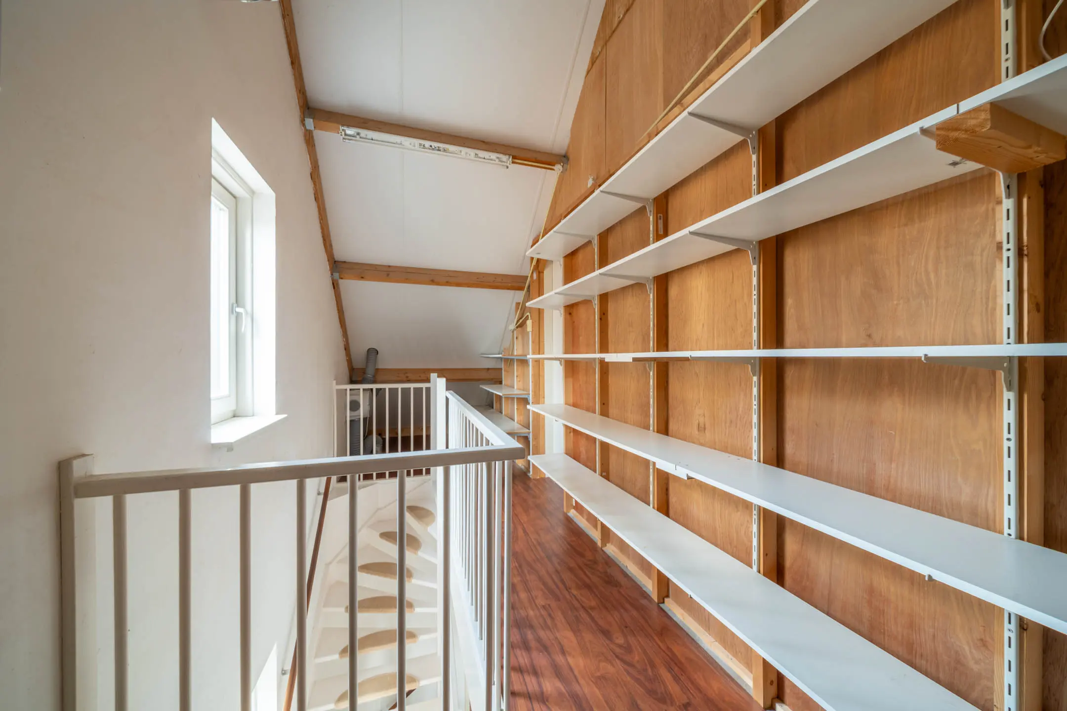 Via een vaste trap bereik je de ruime zolderverdieping met betonvloer. Je komt eerst op de voorzolder, waar de unit van de mechanische ventilatie is geplaatst en waar bovendien volop bergruimte aanwezig is.