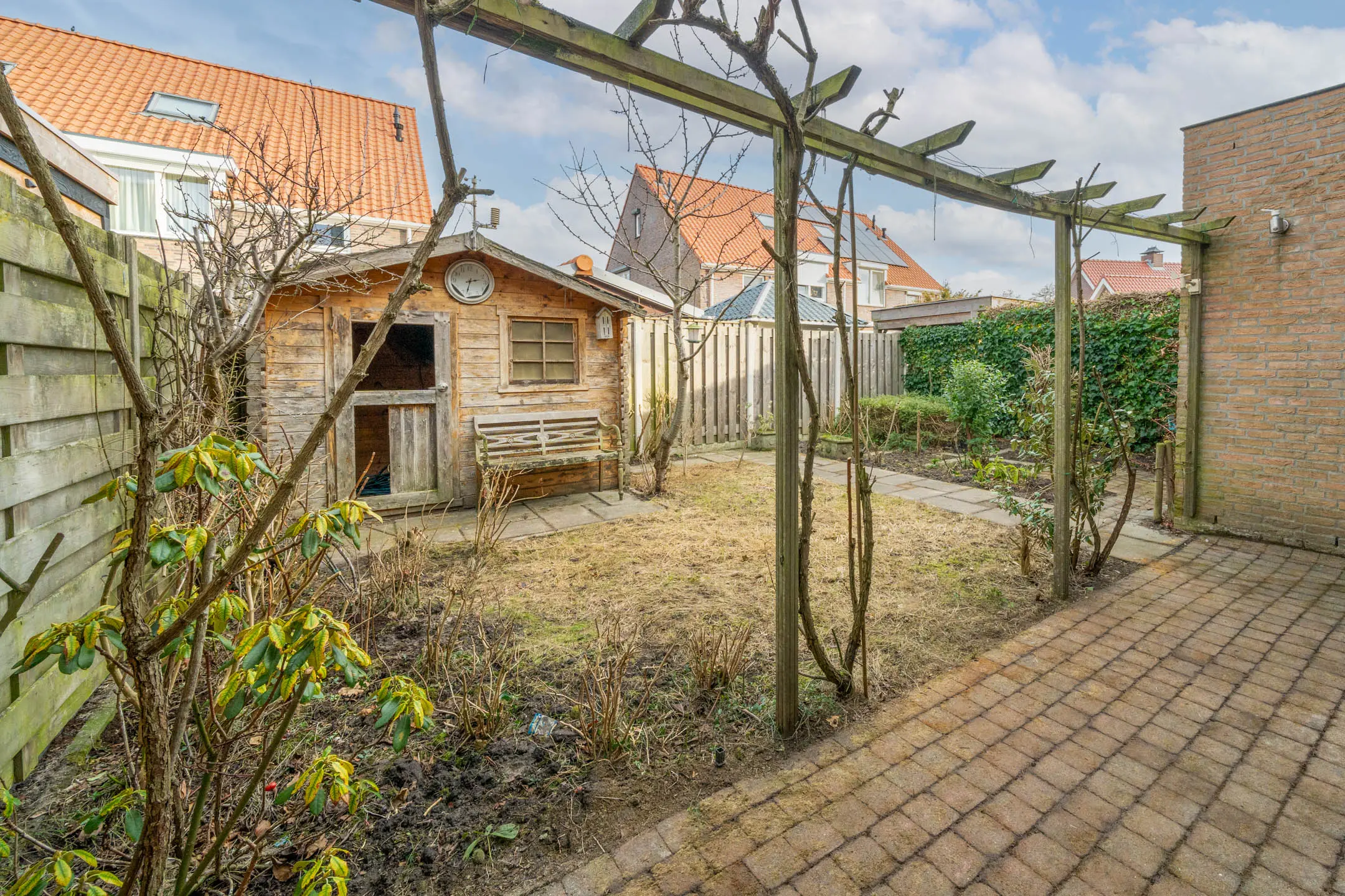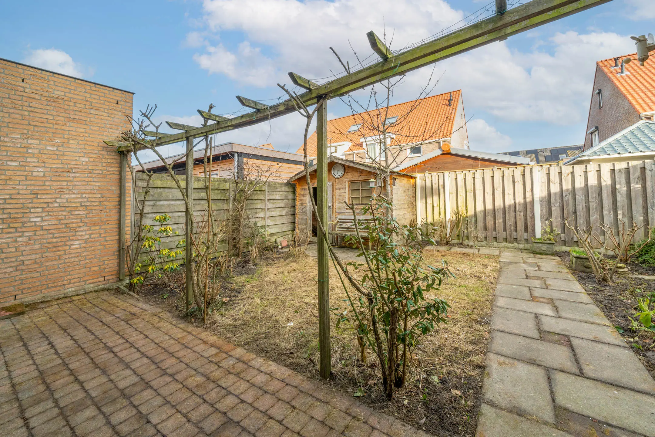 De achtertuin is gelegen op het noordoosten en biedt volop mogelijkheden om deze geheel naar eigen wens in te richten. Achterin de tuin staat een houten berging. Ook de voortuin is aangelegd met sierbestrating en beschikt over een eigen oprit, waardoor er parkeergelegenheid op eigen terrein aanwezig is.