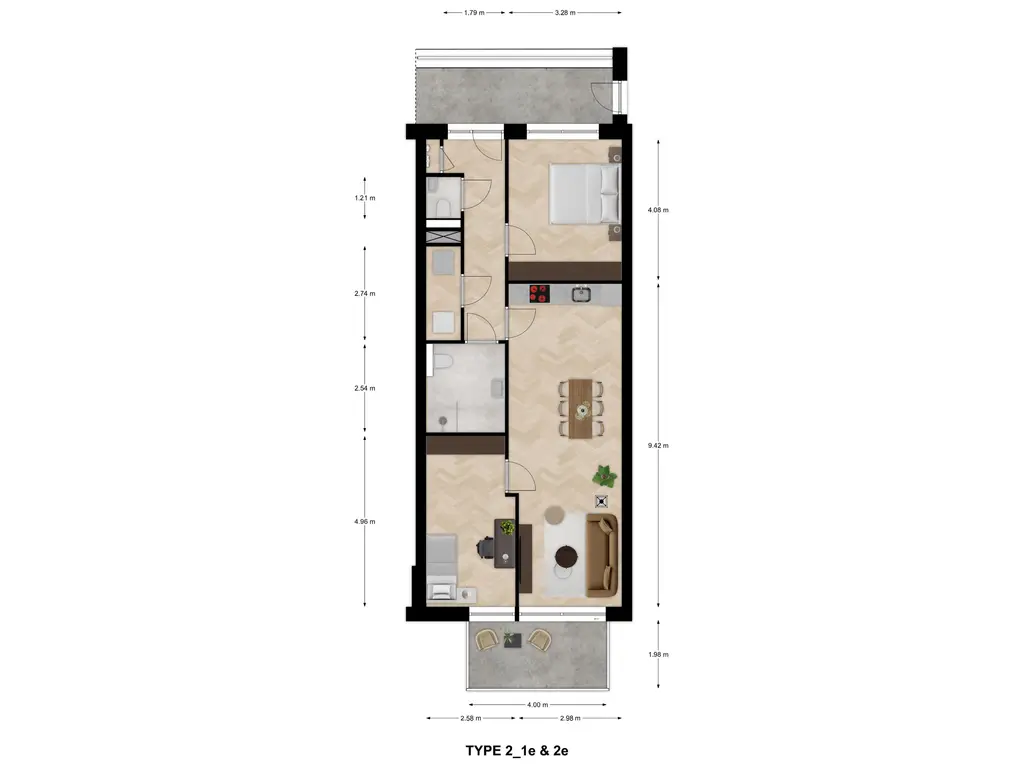 Binnen zorgt de open woonkeuken voor een warme en uitnodigende leefruimte die naadloos overloopt in de sfeervolle woonkamer, ideaal om te koken, eten en ontspannen samen te laten komen. Alle Type 2 appartementen zijn slim ingedeeld met zowel een apart toilet als een toilet in de badkamer, voor optimaal comfort en gemak.