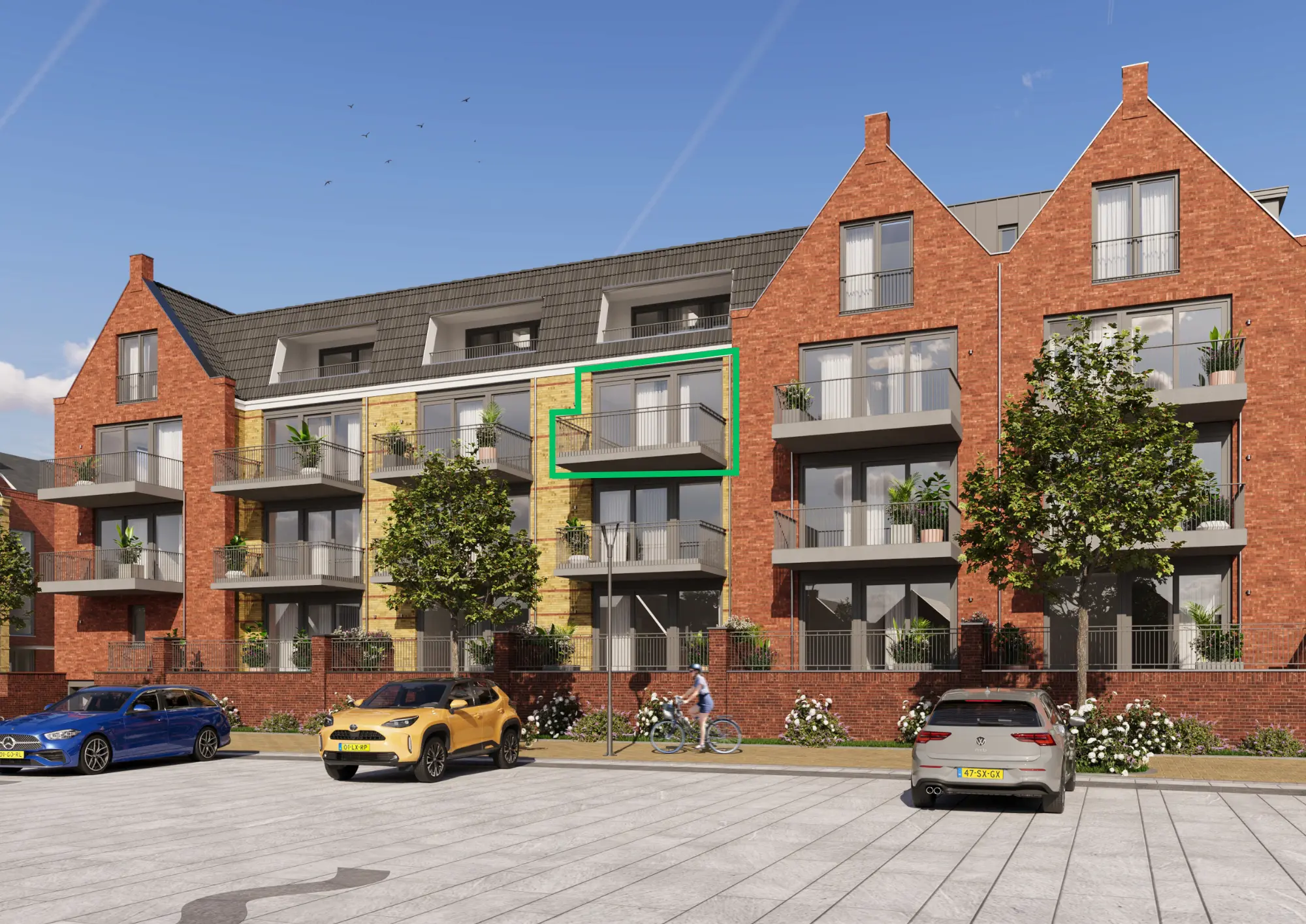Dankzij de grote schuifpui stroomt het daglicht binnen en ontstaat een natuurlijke verbinding met de buitenruimte. Op de begane grond geniet je van je eigen terras, terwijl de appartementen op de verdiepingen beschikken over een balkon waar binnen en buiten naadloos in elkaar overvloeien.