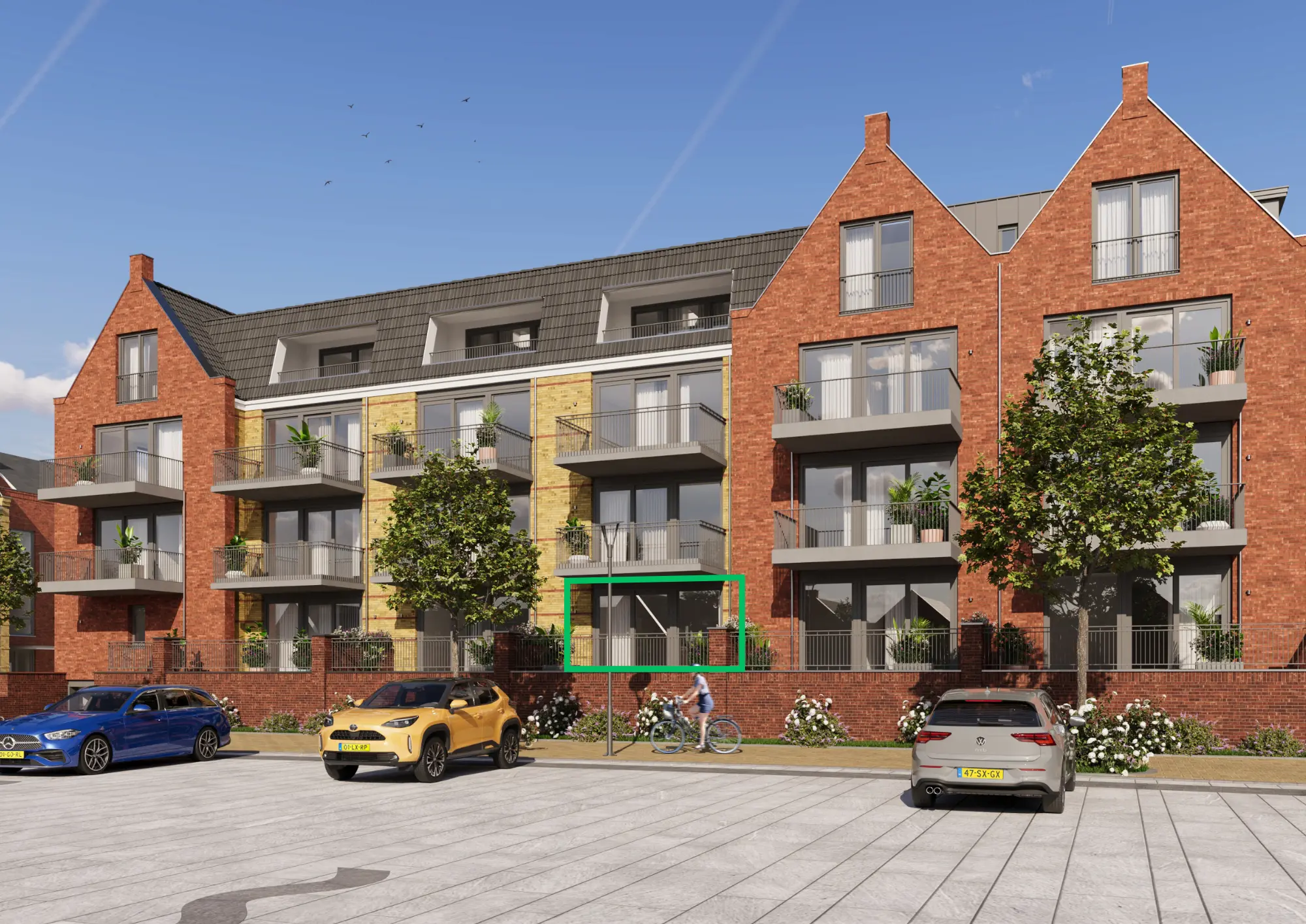 Dankzij de grote schuifpui stroomt het daglicht binnen en ontstaat een natuurlijke verbinding met de buitenruimte. Op de begane grond geniet je van je eigen terras, terwijl de appartementen op de verdiepingen beschikken over een balkon waar binnen en buiten naadloos in elkaar overvloeien.