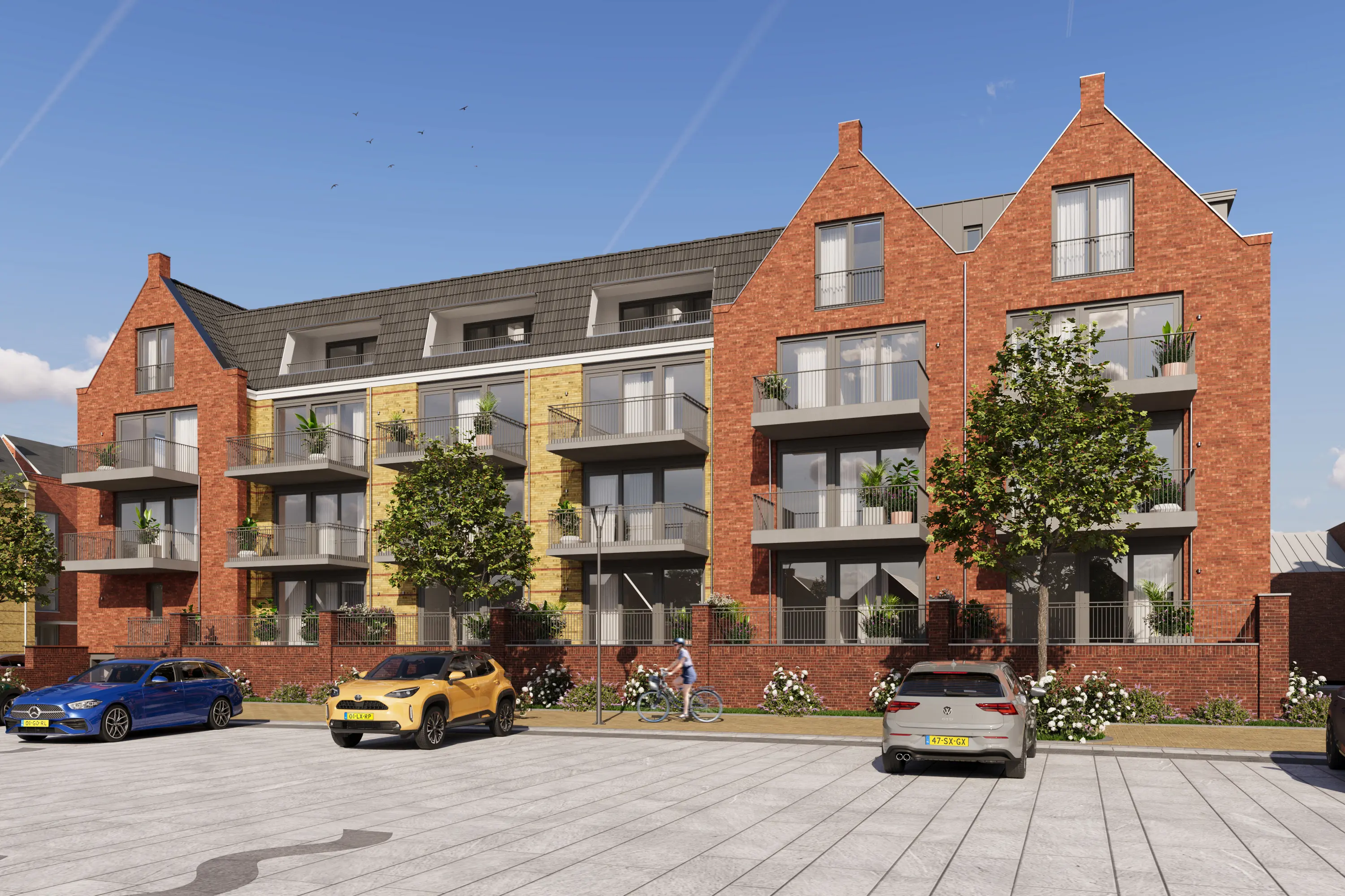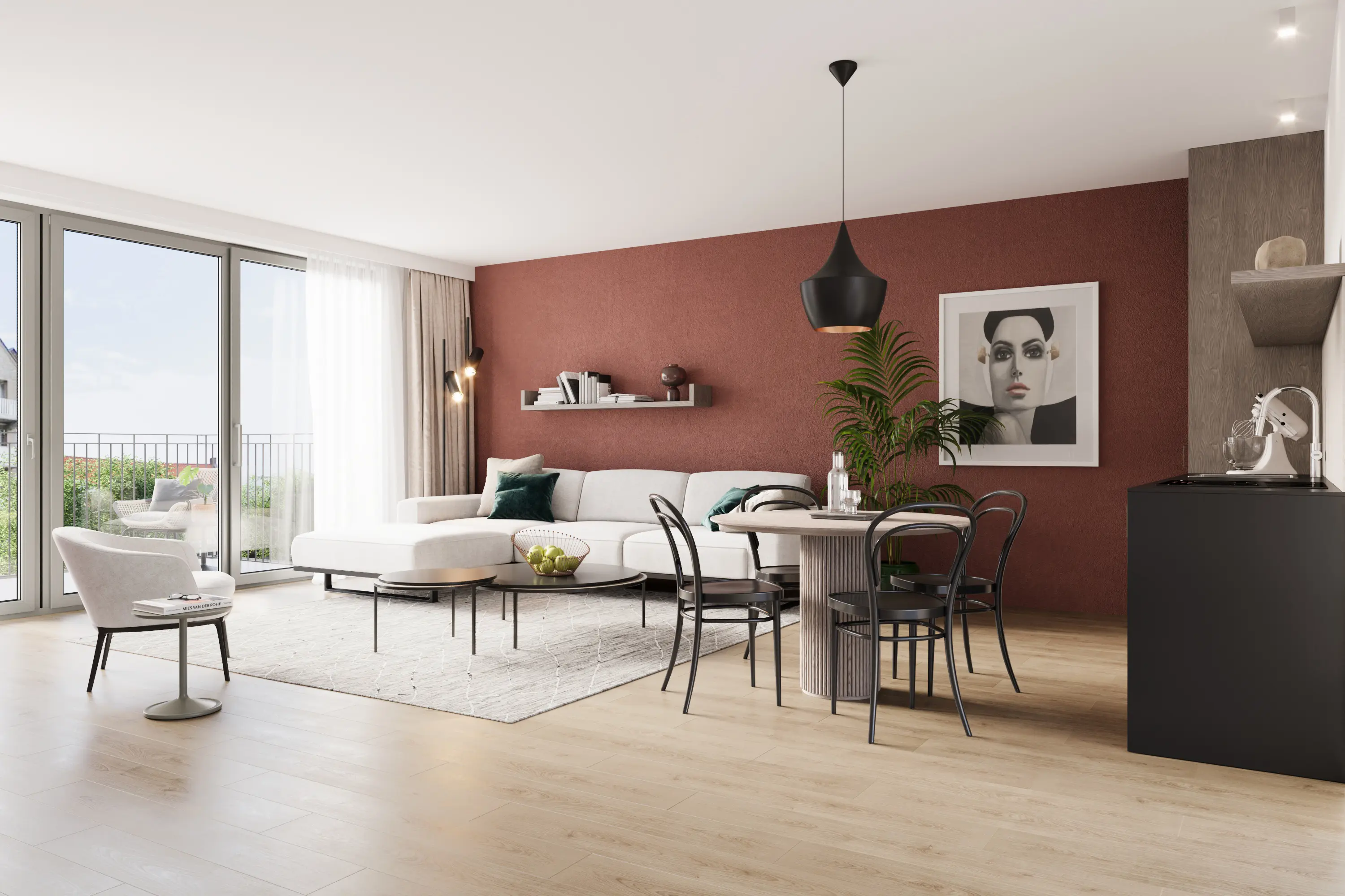 Dankzij de grote schuifpui stroomt het daglicht binnen en ontstaat een natuurlijke verbinding met de buitenruimte. Op de begane grond geniet je van je eigen terras, terwijl de appartementen op de verdiepingen beschikken over een balkon waar binnen en buiten naadloos in elkaar overvloeien.