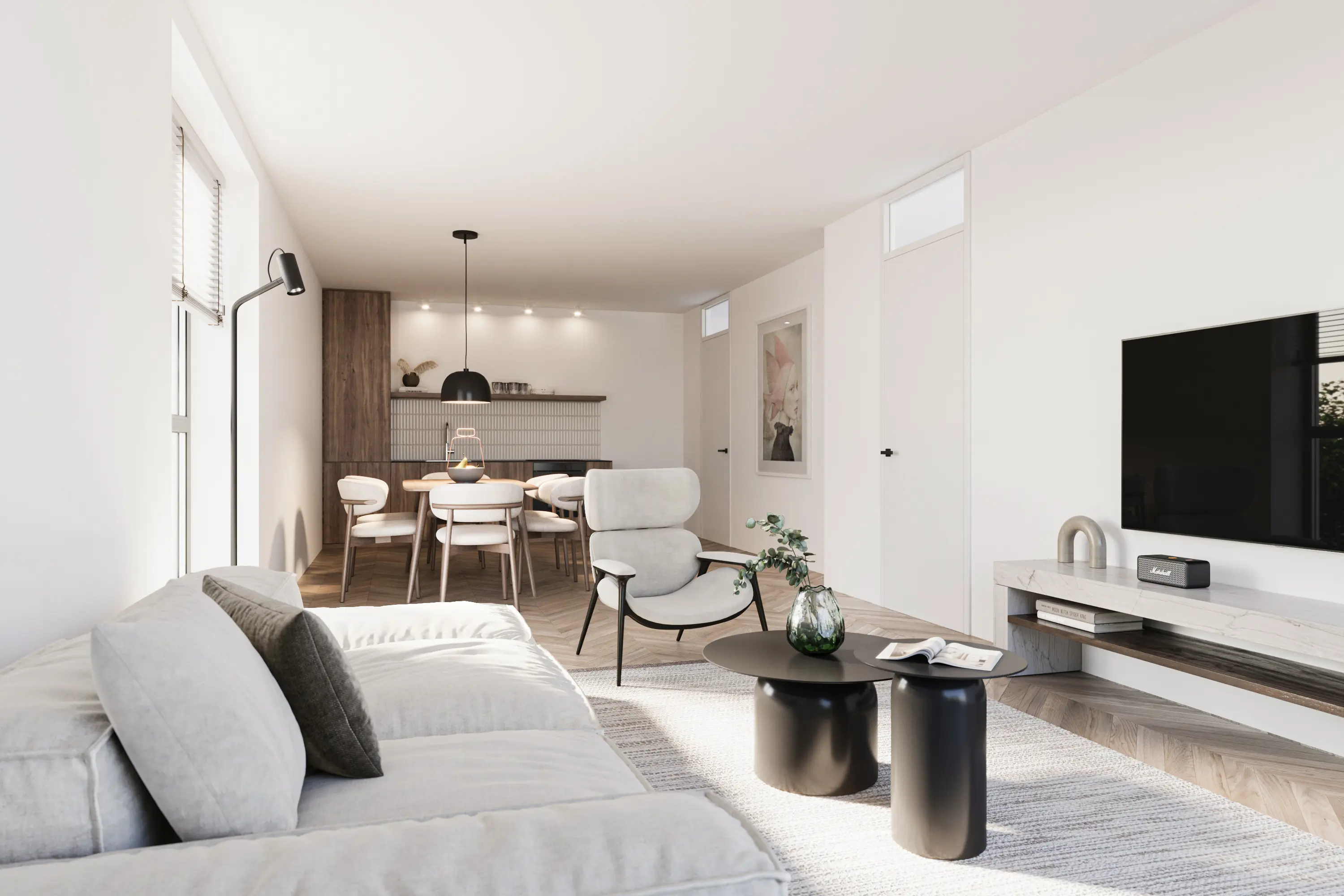 De keuken en het eetgedeelte vormen samen met de woonkamer één uitnodigende leefruimte. Of je nu gezellig dineert met vrienden of juist tot rust komt na een lange dag, hier voelt alles natuurlijk aan.
